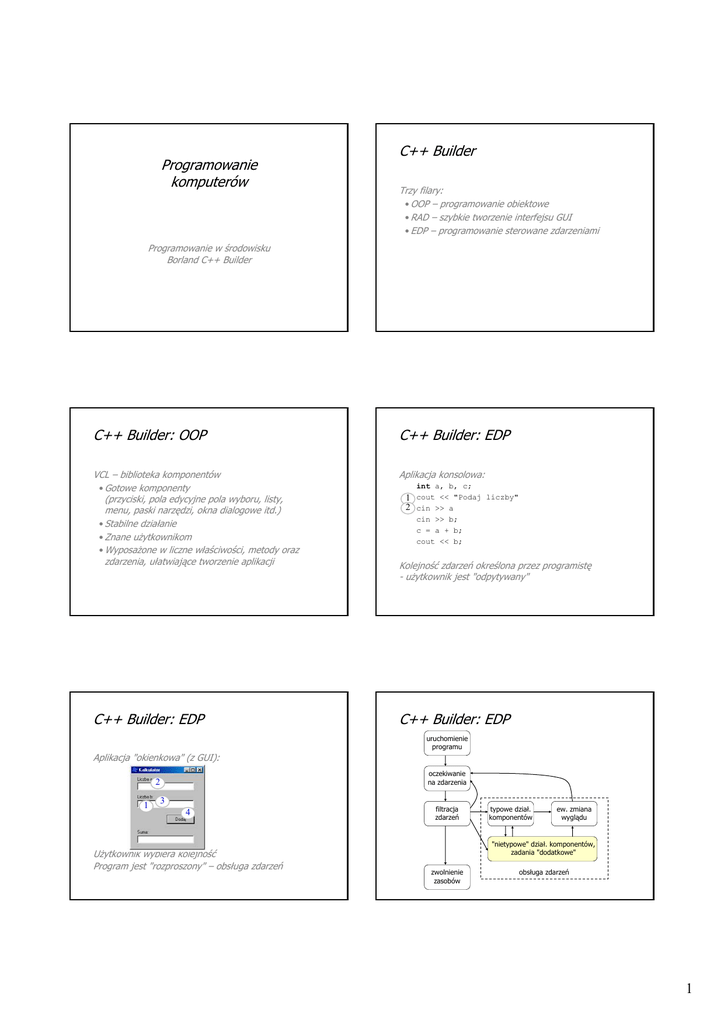 Programowanie komputerów C++ Builder Trzy filary: • OOP – programowanie obiektowe • RAD – szybkie tworzenie interfejsu GUI • EDP – programowanie sterowane zdarzeniami Programowanie w środowisku Borland C++ Builder C++ Builder: OOP C++ Builder: EDP VCL – biblioteka komponentów • Gotowe komponenty (przyciski, pola edycyjne pola wyboru, listy, menu, paski narzędzi, okna dialogowe itd.) • Stabilne działanie • Znane użytkownikom • Wyposażone w liczne właściwości, metody oraz zdarzenia, ułatwiające tworzenie aplikacji Aplikacja konsolowa: C++ Builder: EDP int a, b, c; 1 cout << "Podaj liczby" 2 cin >> a cin >> b; c = a + b; cout << b; Kolejność zdarzeń określona przez programistę - użytkownik jest "odpytywany" C++ Builder: EDP uruchomienie programu Aplikacja "okienkowa" (z GUI): oczekiwanie na zdarzenia 2 1 3 4 Użytkownik wybiera kolejność Program jest "rozproszony" – obsługa zdarzeń filtracja zdarzeń typowe dział. komponentów ew. zmiana wyglądu "nietypowe" dział. komponentów, zadania "dodatkowe" zwolnienie zasobów obsługa zdarzeń 1 C++ Builder: EDP C++ Builder: EDP Rodzaje zdarzeń: • Mysz: Jakie zdarzenia musi obsługiwać program? OnMouseDown, OnMouseUp, OnMouseMove • Klawiatura: OnKeyDown, OnKeyUp • API/VCL: OnCreate, OnShow, OnResize, OnEnter, OnExit, OnCloseQuery, OnClose, OnPaint Sekwencje zdarzeń OnMouseMove-OnMouseDown-OnMouseUp-OnClick OnKeyDown-OnKeyUp-OnKeyPress OnKeyDown-OnKeyUp-OnClick C++ Builder: RAD Które zdarzenia nie są obsługiwane przez komponenty? Nowe typy zmiennych komponenty Rozszerzenie standardu języka ANSI C++: • bool – typ zmiennych logicznych • AnsiString – typ do zapisu łańcuchów tekstowych, zastępujący tablice znaków zdarzenia właściwości Typ bool Typ bool – typ tzw. zmiennych "boolowskich" (tj. logicznych), przyjmujących wartości • "true" (prawda) lub • "false" (fałsz) Zamiennie można też używać wartości 1 i 0 Typ bool • Przypisanie wartości: bool p, q, r; p = (x>y) && (x!=z); q = false; // lub: q = 0; r = true; // lub: r = 1; • Wykorzystanie w wyrażeniach if (p) ... if (!q) ... // zamiast: if (p==true) ... // zamiast: if (q==false) ... 2 Typ AnsiString Typ AnsiString (lub w skrócie String) – umożliwia wygodne manipulowanie łańcuchami znaków. • Posiada szereg operatorów, a w tym przypisania (=), dodawania (+) oraz relacji (<, ==, >) • Posiada szereg metod, a w tym: ToInt(), ToDouble() – zamiana łańcucha tekst. na liczbę, w notacji całkowitej lub zmiennoprzecinkowej, IsEmpty() – sprawdza, czy łańcuch jest pusty Typ AnsiString • Przypisanie wartości: double x=3.15; String a, b, c; a = "Dowolny tekst"; b = x; c = String() + "Wynik: " + x; • Zamiana na liczbę: double y; y = b.ToDouble() • Relacje if (a==b && c.IsEmpty()) ... Właściwości komponentów Właściwości komponentów Name • Nazwa, pod jaką komponent jest widziany w programie; formalnie komponenty są deklarowane jako wskaźniki będące elementami składowymi formularza • Domyślnie: NazwaKlasy + numer, np. Button1, Label2 itp. • Można zmienić – obowiązują zwykłe zasady dla identyfikatorów; przydatne zwłaszcza, gdy komponentów jest więcej, np. SpeedButton17 zmieniamy na BtnSaveFile Caption • Podpis – nieedytowalny tekst, widoczny na komponencie; Znak "&" powoduje, że następna litera jest podkreślona i stanowi skrót klawiaturowy, np.: &Start Æ Start (reaguje na [Alt] + s) Text • Tekst wpisany przez użytkownika – edytowalny Właściwości komponentów Właściwości komponentów Visible • Komponent widoczny (tak/nie) Enabled • Komponent dostępny (tak/nie) Hint • Treść podpowiedzi w dymku (AnsiString) ShowHint • Czy podpowiedź ma być wyświetlana (bool) • Są to właściwości typu AnsiString • Są to właściwości typu bool (logicznego): 3 Właściwości komponentów Właściwości komponentów Font cechy czcionki, której używa komponent: - Name – krój (np. „Bookman Old Style”) - Size – rozmiar w punktach - Color – kolor (np. clRed, clBlue itd.) - Style – pogrubienie (fsBold), kursywa (fsItalic) Color kolor tła (można używać stałych clRed, clBlue, clGreen, ...) Właściwości można modyfikować: • w inspektorze obiektów (właściwości na moment uruchomienia programu) • programowo Komponenty Komponenty Label - etykieta • statyczny tekst, opisuje inne komponenty; może aktywować wybrany komponent Edit – pole edycyjne • do wczytywania i wyświetlania danych • właściwości: - Caption – tekst wyświetlany przez etykietę - FocusControl – komponent aktywowany p. etykietę - Alignment – wyrównanie tekstu - WordWrap – dzielenie tekstu na kilka linii Edit1->Text = ""; Button1->Enabled = false; Właściwości można odczytywać int e = Button1->Enabled; if (!Label2->Visible) Labe1->Visible = true; • właściwości: - Text – tekst wpisany w polu edycyjnym - ReadOnly – tylko do odczytu (wyśw. wyników) • zdarzenia: - OnChange – kiedy zmieni się tekst Komponenty Komponenty Edit – jak korzystać z właściwości Text • do wczytywania danych: Button – przycisk • inicjuje określone reakcje programu double x; int a; x = Edit1->Text.ToDouble(); a = Edit2->Text.ToInt(); • do wyświetlania wyników: Edit1->Text = x; // int, float, double Edit2->Text = "dowolny tekst"; Edit3->Text = String() + "suma:" + s; • właściwości: - Caption – tekst na przycisku (& -> podkreślenie) - Default – przycisk domyślny • zdarzenia: - OnClick – kliknięcie lub Alt+litera lub [Enter] 4 Komponenty Timer – czasomierz • odmierza odstępy czasu • właściwości: - Interval – odstęp czasu między "tyknięciami" [ms] - Enabled – "tyka" / "nie tyka" • zdarzenia: - OnTimer – po każdym upłynięciu interwału czasu Projekt Na projekt składa się 6 plików: Project1.bpr Unit1.h Project1.res Unit1.cpp Project1.cpp Unit1.dfm Projekt Projekt Pliki modułu • unit.dfm – "opis"