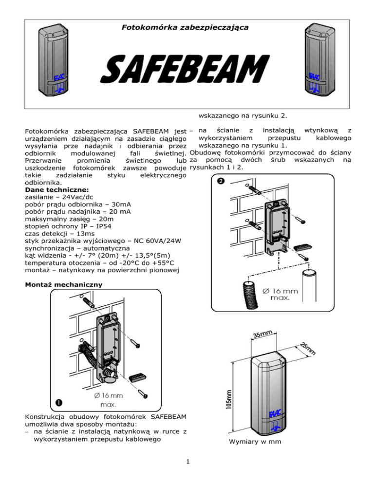 Fotokomórka zabezpieczająca wskazanego na rysunku 2. Fotokomórka zabezpieczająca SAFEBEAM jest urządzeniem działającym na zasadzie ciągłego wysyłania prze nadajnik i odbierania przez odbiornik modulowanej fali świetlnej. Przerwanie promienia świetlnego lub uszkodzenie fotokomórek zawsze powoduje takie zadziałanie styku elektrycznego odbiornika. Dane techniczne: zasilanie – 24Vac/dc pobór prądu odbiornika – 30mA pobór prądu nadajnika – 20 mA maksymalny zasięg – 20m stopień ochrony IP – IP54 czas detekcji – 13ms styk przekażnika wyjściowego – NC 60VA/24W synchronizacja – automatyczna kąt widzenia - +/- 7° (20m) +/- 13,5°(5m) temperatura otoczenia – od -20°C do +55°C montaż – natynkowy na powierzchni pionowej na ścianie z instalacją wtynkową z wykorzystaniem przepustu kablowego wskazanego na rysunku 1. Obudowę fotokomórki przymocować do ściany za pomocą dwóch śrub wskazanych na rysunkach 1 i 2. – Montaż mechaniczny Konstrukcja obudowy fotokomórek SAFEBEAM umożliwia dwa sposoby montażu: – na ścianie z instalacją natynkową w rurce z wykorzystaniem przepustu kablowego 1 Wymiary w mm Podłączenia elektryczne. RX odbiornik fotokomórki TX nadajnik fotokomórki DL1– wskaźnik zasilania DL2– wskaźnik działania fotobariery COM – styk wspólny przekaźnika NC - wyjście sygnałowe fotokomórki Uruchomienie fotokomórek SAFEBEAM – załączyć zasilanie nadajnika i odbiornika. Diody DL1 zaczną świecić światłem ciągłym. – Zgodnie z rysunkiem 6 zmontować obudowę w jedną całość – koniecznie umieścić półprzezroczystą pokrywę przednią i przykręcić wkrętami. – Prawidłowo – współosiowo – zamontowane fotokomórki i poprawnie podłączone rozpoznaje się po ciągłym świeceniu diody DL2 w odbiorniku. Pojawienie się przeszkody na drodze fotobariery (wystarczy ręką przesłonić jedną z fotokomórek) spowoduje zgaśnięcie diody DL2 i słyszalne przełączenie przekaźnika. Synchronizacja nadajnika z odbiornikiem nastepuje automatycznie. Z uwagi na tą cechę fotokomórki SAFEBEAM, można je stosować wyłącznie pojedynczo (jedna linia) w systemie. Jeżeli ma być wykorzystana druga linia fotokomórek zaleca się zastosowanie modelu PHOTOBEAM w drugiej parze. 2
