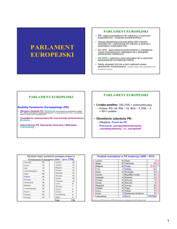 PARLAMENT EUROPEJSKI • PE: organ prawodawczy UE wybierany w wyborach bezpośrednich - instytucja ponadnarodowa PARLAMENT EUROPEJSKI • WyraŜa demokratyczną wolę blisko 500 milionów obywateli UE i reprezentuje ich interesy w dyskusji z pozostałymi instytucjami Unii. • Do 1979: zgromadzenie parlamentarne o charakterze czysto konsultacyjnym składające się z delegatów parlamentów narodowych. • Od 1979 r. wybierany przez obywateli UE w wyborach bezpośrednich na kadencje 5-letnie. • KaŜdy obywatel Unii ma w tych wyborach prawo głosowania i kandydowania, niezaleŜnie od jego miejsca zamieszkania w UE po spełnieniu warunków . PARLAMENT EUROPEJSKI PARLAMENT EUROPEJSKI • Liczba posłów: 750 (753) + przewodniczący Siedziby Parlamentu Europejskiego (PE): • Oficjalna siedziba PE: Strasburg (Comiesięczne posiedzenia całego PE, zwane zwyczajnymi sesjami plenarnymi - 12 sesji plenarnych w roku w Strasburgu, – Polska: PO -25, PiS – 15, SLD – 7, PSL – 3 = 50+1 posłów Ŝadna w sierpniu ale 2 w październiku). • Posiedzenia nadzwyczajne PE oraz komisje parlamentarne: Bruksela • Administracja PE, Sekretariat Generalny i Biblioteka: Luksemburg Rozdział miejsc poselskich pomiędzy krajami w Parlamencie Europejskim 2009 – 2014 (TN) Sweden 18 72 Austria 17 72 Bulgaria 17 72 Finland 13 Denmark 13 Germany 99 France Italy United Kingdom Spain 50 Poland 50 Slovakia 13 Ireland 12 Romania 33 Netherlands 26 Belgium 22 Slovenia 7 Czech Republic 22 Cyprus 6 Greece 22 Estonia 5 Hungary 22 Luxembourg 6 22 Malta 5 Portugal Lithuania 12 Latvia 8 Total 736 • Określenie członków PE: – Oficjalnie: Poseł do PE – Potocznie „europarlamentarzysta”, „eurodeputowany” lub „europoseł”. Podział mandatów w PE kadencja 2009 - 2014 Austria 19 Malta Belgia 22 Niderlandy Bułgaria 18 Niemcy Cypr Dania Estonia 6 Polska 13 Portugalia 6 Republika Czeska 6 26 96 (99) 51 22 22 Finlandia 13 Rumunia 33 Francja 74 Słowacja 13 Grecja 22 Słowenia 8 Hiszpania 54 Szwecja 20 Irlandia 12 Węgry 22 Litwa 12 Włochy 73 Łotwa 9 Zjednoczone Królestwo Luksemburg 6 Razem 73 751(754) AS from June 2014 (new term of EP) the Germany’s memebership in the EP will drop to 96. 1 PARLAMENT EUROPEJSKI PARLAMENT EUROPEJSKI Frakcje polityczne w PE: • Rozmieszczenie posłów na sali PE: według przynaleŜności do jednego z ogólnoeuropejskich ugrupowań politycznych. Grupy polityczne 1 2 Polscy członkowie PE …….PO+PSL=25 + 3 …….....SLD+7 3 4 • Poglądy: od skrajnego federalizmu po otwarty eurosceptycyzm. 5 ………PiS+15 6 7 • Kryteria utworzenia grupy politycznej: – minimum 25 posłów (3,3 % posłów PE), – reprezentujących co najmniej ¼ państw członkowskich (obecnie co najmniej 7 państw). Przewodniczący Michał Kamiński PIS EPP – Europejska Partia Ludowa; S&D – Postępowy Sojusz Socjalistów i Demokratów; ALDE – Sojusz Demokratów i liberałów dla Europy; G-EFA – Zieloni – Wolny Sojusz Europejski; ECR – Europejscy Konserwatyści i Reformiści; EUL-NGL – Grupa Konfederalna Zjednoczonej Lewicy Europejskiej/Lewica Nordycka Zielonych; EFD – Europa Wolności i Demokracji; nie zrzeszeni PARLAMENT EUROPEJSKI Struktura zarządzania: • Przewodniczący PE (Kadencja 2,5 roku) – nadzoruje pracę PE, – przewodniczy posiedzeniom plenarnym, zebraniom Prezydium i Konferencji Przewodniczących, – podpisuje akty prawne przyjęte w zwyczajnej procedurze prawodawczej, w tym budŜet, – reprezentuje Parlament na płaszczyźnie międzynarodowej, – przemawia jako pierwszy na posiedzeniu RE. PARLAMENT EUROPEJSKI • Prezydium (skład): przewodniczący PE + 14 wiceprzewodniczących + 5 kwestorów z głosem doradczym • Wybory Przewodniczącego i Prezydium – Prawo zgłoszenia kandydatów: grupa polityczna lub co najmniej 37 posłów, Jerzy Buzek – Przewodniczący Parlamentu Europejskiego PARLAMENT EUROPEJSKI Kompetencje Prezydium, m. in.: • polityka budŜetowa PE, • sprawy administracyjne, organizacyjne, polityka kadrowa, – Wybory przez aklamację: jeŜeli liczba kandydatur nie przekracza liczby miejsc do obsadzenia, • powołanie Sekretarza Generalnego, – Kadencja: 2,5-letnia. Zamiast Michała Kamińskiego Edward McMillan-Scott jednym z 14 wiceprzewodniczących). 2 PARLAMENT EUROPEJSKI • Kwestorzy (Kolegium kwestorów): sprawy administracyjne i finansowe dotyczące deputowanych i ich statusu. • Konferencja Przewodniczących - organ wykonawczy PE – Skład: Przewodniczący PE + przewodniczący grup politycznych + przedstawiciel niezrzeszonych bez prawa głosu Obowiązki, kompetencje: – decyduje w sprawach organizacji pracy PE i planowania prawodawczego. Obowiązki, kompetencje c.d.: – określa skład i kompetencje komisji parlamentarnych, stałych i innych, – Odpowiada za stosunki z innymi instytucjami i ciałami UE oraz parlamentami PC. – odpowiada za relacje z krajami oraz instytucjami i organizacjami pozaunijnymi. – opracowuje projekty programów miesięcznych sesji plenarnych. PARLAMENT EUROPEJSKI PARLAMENT EUROPEJSKI Stałe komisje parlamentarne: • Komisje parlamentarne – 20 komisji stałych • Komisja Spraw Zagranicznych ─ Committee on Foreign Affairs; • Podkomisja ds. Praw Człowieka ─ Subcommittee on Human Rights; • Podkomisja ds. Bezpieczeństwa i Obrony ─ Subcommittee on Security and Defence; – Komisje badają projekty aktów prawnych wnoszonych przez KE, opracowują poprawki. Przygotowują sprawozdania i projekty uchwał na posiedzenia plenarne PE. – Parlament moŜe takŜe powoływać podkomisje, komisje tymczasowe i komisje śledcze. PARLAMENT EUROPEJSKI • Komisja Zatrudnienia i Spraw Socjalnych ─ Committee on • Komisja Rozwoju ─ Committee on Development; • Komisja Handlu Zagranicznego ─ Committee on International Trade; • Komisja BudŜetowa ─ Committee on Budgets; • Komisja Kontroli BudŜetowej ─ Committee on Budgetary Control; • Komisja Gospodarcza i Monetarna ─ Committee on Ec