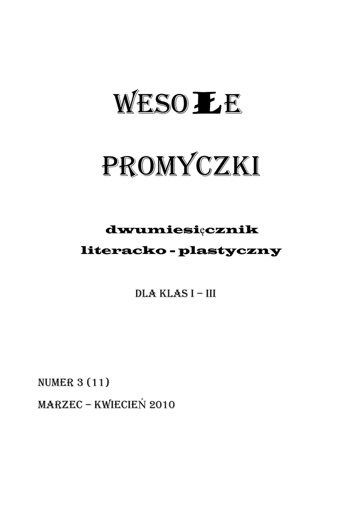 Wesołe promyczki dwumiesięcznik literacko - plastyczny dla klas i – iii numer 3 (11) MARZEC – KWIECIEŃ 2010 Witamy czytelników w kolejnym numerze gazetki ,,Wesołe Promyczki”. Z życia szkoły… 30 marca 2010 r. klasy pierwsze zaprezentowały program artystyczny dla klas II i III z okazji Świąt Wielkanocnych pt. „O wielkanocnych tradycjach”. ●♣●♣●●♣●♣●●♣●♣●●♣●♣●●♣●♣●●♣●♣●●♣●♣●●♣●♣●♣●●♣●♣●●♣●♣ 2 W marcu został zorganizowany konkurs dla klas młodszych „Wiosenne kukiełki”. Wzięło w nim udział 26 uczniów z klas I - III. Komisja w składzie: p. I. Forszpaniak, p. E. Bernacka-Pacyna, p. B. Kryś wyłoniło zwycięzców : - wśród uczniów klas pierwszych 1. miejsce Oskar Kłyszyński 2. miejsce Ewelina Kras 3. miejsce Julia Piróg - wśród uczniów klas drugich 1. miejsce Agnieszka Klimas 2. miejsce Natalia Fałek 3. miejsce Martyna Sienkowiec - wśród uczniów klas trzecich 1. miejsce Ula Tekień 2. miejsce Julia Rogoś 3. miejsce Karolina Czyż 3 SWOBODNE TEKSTY Jestem magicznym kamykiem. Leżę nad brzegiem morza tysiące lat. Dzieci biegają, lepią zamki z piasku, szukają muszelek ale żadne z nich mnie zauważa. Chciałbym, aby jakaś dziewczynka czy chłopiec mnie odnaleźli. Nawet nie wyobrażałem sobie, że moje życzenie tak szybko się spełni. Pewnego równie słonecznego dnia jak poprzednie dni usłyszałem, że dzieci postanowiły urządzić konkurs, kto wyłowi z morza najwięcej muszelek. Dzieci wskoczyły do wody. Po piętnastu minutach wynurzyły się i zaczęły gromadzić się przy brzegu. Niestety po zakończeniu konkursu zaczęła się zupełnie bezsensowna kłótnia. - Mam 21 muszelek – powiedziała Ala. - A ja 22 muszelki – powiedziała Asia. - Twoje dwie się nie liczą, masz je połamane. - To nieprawda! – wrzasnęła Asia – To przecież muszelki, każda się z nich liczy. - Tak, ale połamane nie! – odpowiedziała z rozłoszczoną miną Ala. - Ja wygrałam! - Nie, ja! - Przestańcie się kłócić – powiedział Wojtek – Nieważne kto wygrał, przecież liczy się dobra zabawa. - To już nie jest dobra zabawa jeśli ktoś oszukuje – odpowiedziała Ala. A potem nagle zawołała: - Ojej, jaki śliczny kamyczek! Podbiegła do mnie i wzięła mnie do ręki. Od razu przeprosiła Asię i Wojtka. Przez cały tydzień leżałem w ładnej szkatułce. Pewnego dnia zabrała mnie na plażę. Gdy jej rodzice rozkładali swoje ręczniki zobaczyłem Asię i Wojtka. Pobiegła do nich i wtedy wyślizgnąłem się jej z ręki. Upadłem na ziemię. Szybko powiedziałem sobie w myśli, że dalej chcę pomagać innym Agnieszka Klimas II a 4 Jestem magicznym kamykiem. Długo leżałem na plaży. Pewnego dnia, a był to piękny słoneczny poranek, młoda dziewczyna szła brzegiem morza. Była smutna. Nagle wzrok jej przyciągnął leżący kamyk, niechętnie się schyliła i podniosła go. Wtedy nastąpiła w jej zachowaniu dziwna zmiana, zaczęła się uśmiechać. Po przyjściu do domu zaczęła pomagać mamie i bez przerwy się śmiała, śpiewała i była uprzejma, grzeczna dla całej rodziny. Nie wiedziała, że znalazła kamyk szczęścia. Po pewnym czasie zgubiła kamyk na tej samej plaży, obok wydmy. Teraz leżę i czekam, może znów ktoś mnie znajdzie i będzie szczęśliwy i uśmiechnięty. Wiktoria Wieczorek II a flfiflfiflfi flfi W każdym numerze gazetki ,,Wesołe Promyczki” prezentujemy uczniów z wybranej klasy. Dziś przedstawiamy dzieci z klasy II A, której wychowawcą jest pani Genowefa Kowalczyk. Gruning Mateusz Interesuje się matematyką, lubi rozwiązywać i układać zadania. Czyta książki przygodowe. Interesuje się samochodami wyścigowymi. Klimas Agnieszka Zawsze przygotowana do lekcji. Chętnie bierze udział w różnych konkursach, zajmuje czołowe miejsca. Pełni funkcję przewodniczącej klasy, ze swoich obowiązków wywiązuje się bardzo dobrze. Uczynna, koleżeńska. Można na nią liczyć w różnych sytuacjach. 5 Kołek Oktawia Jest osobą bardzo wrażliwą na niepowodzenia szkolne. Lubi czytać książki, zwłaszcza książki przygodowe. Uwielbia konie i chciałaby mieć konia. Leszczyk Paulina Aktywna na lekcjach. Zawsze przygotowana do zajęć. Używa bogatego słownictwa w opowiadaniach. Lubi wykonywać prace plastyczne. Należy do szkolnego zespołu muzycznego. Marceniuk Nicola Aktywna na zajęciach. Ładnie pisze opowiadania, używa bogatego słownictwa. Wykonuje staranne prace plastyczne.. Interesuje się przyrodą, ogląda filmy przyrodnicze. Lubi zwierzęta, zwłaszcza konie, psy, koty. Należy do szkolnego koła teatralnego. 6 Mareczek Bartłomiej Lubi matematykę, chętnie rozwiązuje zadania matematyczne. Lubi również rysować. Najczuk Bartłomiej Ładnie i starannie wykonuje prace plastyczne. Lubi matematykę. Chętnie ogląda filmy przygodowe. Orłowski Szymon Chętnie ogląda filmy przygodowe, przyrodnicze. Z przedmiotów szkolnych najbardziej lubi matematykę. Pietryniecz Jan Interesuje się wszystkimi dziedzinami ale najbardziej lubi informatykę. Czyta książki przygodowe. W czasie wolnym gra na komputerze. 7 Rosik Jakub Interesuje się sportem, grami komputerowymi oraz muzyką. Zawsze chętny do pomocy. Aktywny na lekcjach. Samek Filip Interesuje się sportem, piłką nożną, gra w drużynie „Młodzików”. Lubi pomagać w pracach klasowych. Aktywny na lekcjach. Tokarek Karolina Jest wrażliwa na niepowodzenia szkolne, grzeczna na lekcjach. Zawsze przygotowana do zajęć. Należy do szkolnego koła teatralnego. Lubi zwierzęta, szczególnie psy. Uryn Sławomir Interesuje się motorami i samochodami rajdowymi. Ładnie czyta teksty. Wicher Izabela Grzeczna, zawsze przygotowana do lekcji. Chętnie pomaga w dekoracjach klasowych. Interesuje się sportem. W zawodach sportowych zdobywa medale. Wieczorek Wiktoria Na lekcjach grzeczna, chętna do pomocy. Aktywnie uczestniczy w róż