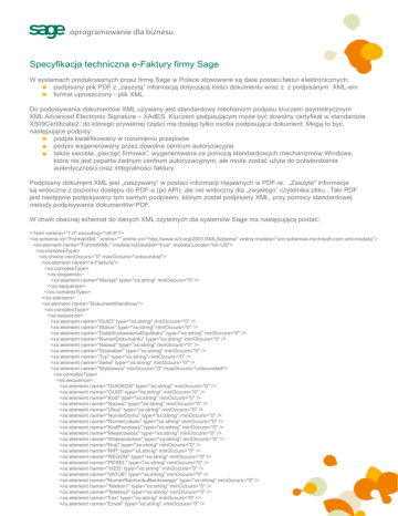 oprogramowanie dla biznesu Specyfikacja techniczna e-Faktury firmy Sage W systemach produkowanych przez firmę Sage w Polsce stosowane są dwie postaci faktur elektronicznych: podpisany plik PDF z „zaszytą” informacją dotyczącą treści dokumentu wraz z z podpisanym XML-em. format uproszczony - plik XML Do podpisywania dokumentów XML używany jest standardowy mechanizm podpisu kluczem asymetrycznym XML Advanced Electronic Signature – XAdES. Kluczem podpisującym może być dowolny certyfikat w standardzie X509Certificate2, do którego prywatnej części ma dostęp tylko osoba podpisująca dokument. Mogą to być następujące podpisy: podpis kwalifikowany w rozumieniu przepisów podpis wygenerowany przez dowolne centrum autoryzacyjne także swoista „pieczęć firmowa”, wygenerowana za pomocą standardowych mechanizmów Windows, która nie jest poparta żadnym centrum autoryzacyjnym, ale może zostać użyta do potwierdzenia autentyczności oraz integralności faktury Podpisany dokument XML jest „zaszywany” w postaci informacji niejawnych w PDF-ie. „Zaszyte” informacje są widoczne z poziomu dostępu do PDF-a (po API), ale nie widoczny dla „zwykłego” czytelnika pliku.. Taki PDF jest następnie podpisywany tym samym podpisem, którym został podpisany XML, przy pomocy standardowej metody podpisywania dokumentów PDF. W chwili obecnej schemat do danych XML czytelnych dla systemów Sage ma następującą postać: <?xml version="1.0" encoding="utf-8"?> <xs:schema id="FormatXML" xmlns="" xmlns:xs="http://www.w3.org/2001/XMLSchema" xmlns:msdata="urn:schemas-microsoft-com:xml-msdata"> <xs:element name="FormatXML" msdata:IsDataSet="true" msdata:Locale="en-US"> <xs:complexType> <xs:choice minOccurs="0" maxOccurs="unbounded"> <xs:element name="e-Faktura"> <xs:complexType> <xs:sequence> <xs:element name="Wersja" type="xs:string" minOccurs="0" /> </xs:sequence> </xs:complexType> </xs:element> <xs:element name="DokumentHandlowy"> <xs:complexType> <xs:sequence> <xs:element name="GUID" type="xs:string" minOccurs="0" /> <xs:element name="Status" type="xs:string" minOccurs="0" /> <xs:element name="DataWystawieniaDuplikatu" type="xs:string" minOccurs="0" /> <xs:element name="NumerDokumentu" type="xs:string" minOccurs="0" /> <xs:element name="Nazwa" type="xs:string" minOccurs="0" /> <xs:element name="Charakter" type="xs:string" minOccurs="0" /> <xs:element name="Typ" type="xs:string" minOccurs="0" /> <xs:element name="Seria" type="xs:string" minOccurs="0" /> <xs:element name="Wystawca" minOccurs="0" maxOccurs="unbounded"> <xs:complexType> <xs:sequence> <xs:element name="GUIDEDS" type="xs:string" minOccurs="0" /> <xs:element name="GUID" type="xs:string" minOccurs="0" /> <xs:element name="Kod" type="xs:string" minOccurs="0" /> <xs:element name="Nazwa" type="xs:string" minOccurs="0" /> <xs:element name="Ulica" type="xs:string" minOccurs="0" /> <xs:element name="NumerDomu" type="xs:string" minOccurs="0" /> <xs:element name="NumerLokalu" type="xs:string" minOccurs="0" /> <xs:element name="KodPocztowy" type="xs:string" minOccurs="0" /> <xs:element name="Miejscowosc" type="xs:string" minOccurs="0" /> <xs:element name="Wojewodztwo" type="xs:string" minOccurs="0" /> <xs:element name="Kraj" type="xs:string" minOccurs="0" /> <xs:element name="NIP" type="xs:string" minOccurs="0" /> <xs:element name="REGON" type="xs:string" minOccurs="0" /> <xs:element name="PESEL" type="xs:string" minOccurs="0" /> <xs:element name="VIES" type="xs:string" minOccurs="0" /> <xs:element name="VATUE" type="xs:string" minOccurs="0" /> <xs:element name="NumerRachunkuBankowego" type="xs:string" minOccurs="0" /> <xs:element name="Telefon1" type="xs:string" minOccurs="0" /> <xs:element name="Telefon2" type="xs:string" minOccurs="0" /> <xs:element name="Fax" type="xs:string" minOccurs="0" /> <xs:element name="Email" type="xs:string" minOccurs="0" /> oprogramowanie dla biznesu </xs:sequence> </xs:complexType> </xs:element> <xs:element name="Odbiorca" minOccurs="0" maxOccurs="unbounded"> <xs:complexType> <xs:sequence> <xs:element name="GUIDEDS" type="xs:string" minOccurs="0" /> <xs:element name="GUID" type="xs:string" minOccurs="0" /> <xs:element name="Kod" type="xs:string" minOccurs="0" /> <xs:element name="Nazwa" type="xs:string" minOccurs="0" /> <xs:element name="Ulica" type="xs:string" minOccurs="0" /> <xs:element name="NumerDomu" type="xs:string" minOccurs="0" /> <xs:element name="NumerLokalu" type="xs:string" minOccurs="0" /> <xs:element name="KodPocztowy" type="xs:string" minOccurs="0" /> <xs:element name="Miejscowosc" type="xs:string" minOccurs="0" /> <xs:element name="Wojewodztwo" type="xs:string" minOccurs="0" /> <xs:element name="Kraj" type="xs:string" minOccurs="0" /> <xs:element name="NIP" type="xs:string" minOccurs="0" /> <xs:element name="REGON" type="xs:string" minOccurs="0" /> <xs:element name="PESEL" type="xs:string" minOccurs="0" /> <xs:element name="VIES" type="xs:string" minOccurs="0" /> <xs:element name="VATUE" type="xs:string" minOccurs="0" /> <xs:element name="NumerRachunkuBankowego" type="xs:string" minOccurs="0" /> <xs:element name="Telefon1" type="xs:string" minOccurs="0" /> <xs:element name="Telefon2" type="xs:string" minOccurs="0" /> <xs:element name="Fax" type="xs:string" minOccurs="0" /> <xs:element name="Email" type="xs:string" minOccurs="0" /> </xs:sequence> </xs:complexType> </xs:element> <xs:element name="Rejestr" type="xs:string" minOccurs="0" /> <xs:element name="RodzajCeny" type="xs:string" minOccurs="0" /> <xs:element name="NaliczanieVAT" type="xs:string" minOccurs="0" /> <xs:element name="MetodaRozliczaniaVAT" type="xs:string" minOccurs="0" /> <xs:element name="DataWystawienia" type="xs:string" minOccurs="0" /> <xs:element name="DataSprzedazy" type="xs:string" minOccurs="0" /> <xs:element name="DataWplywu" type="xs:string" minOccurs="0" /> <xs:element name="RejestrPlatnosci" type="xs:string" minOccurs="0" /> <xs:element name="FormaPlatnosci" type="xs:string" minOccurs="0" /> <xs:ele