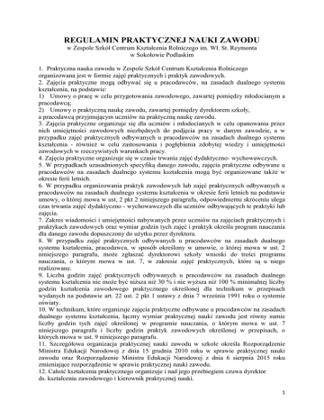 REGULAMIN PRAKTYCZNEJ NAUKI ZAWODU w Zespole Szkół Centrum Kształcenia Rolniczego im. Wł. St. Reymonta w Sokołowie Podlaskim 1. Praktyczna nauka zawodu w Zespole Szkół Centrum Kształcenia Rolniczego organizowana jest w formie zajęć praktycznych i praktyk zawodowych. 2. Zajęcia praktyczne mogą odbywać się u pracodawców, na zasadach dualnego systemu kształcenia, na podstawie: 1) Umowy o pracę w celu przygotowania zawodowego, zawartej pomiędzy młodocianym a pracodawcą; 2) Umowy o praktyczną naukę zawodu, zawartej pomiędzy dyrektorem szkoły, a pracodawcą przyjmującym uczniów na praktyczną naukę zawodu. 3. Zajęcia praktyczne organizuje się dla uczniów i młodocianych w celu opanowania przez nich umiejętności zawodowych niezbędnych do podjęcia pracy w danym zawodzie, a w przypadku zajęć praktycznych odbywanych u pracodawców na zasadach dualnego systemu kształcenia - również w celu zastosowania i pogłębienia zdobytej wiedzy i umiejętności zawodowych w rzeczywistych warunkach pracy. 4. Zajęcia praktyczne organizuje się w czasie trwania zajęć dydaktyczno- wychowawczych. 5. W przypadkach uzasadnionych specyfiką danego zawodu, zajęcia praktyczne odbywane u pracodawców na zasadach dualnego systemu kształcenia mogą być organizowane także w okresie ferii letnich. 6. W przypadku organizowania praktyk zawodowych lub zajęć praktycznych odbywanych u pracodawców na zasadach dualnego systemu kształcenia w okresie ferii letnich na podstawie umowy, o której mowa w ust, 2 pkt 2 niniejszego paragrafu, odpowiedniemu skróceniu ulega czas trwania zajęć dydaktyczno - wychowawczych dla uczniów odbywających te praktyki lub zajęcia. 7. Zakres wiadomości i umiejętności nabywanych przez uczniów na zajęciach praktycznych i praktykach zawodowych oraz wymiar godzin tych zajęć i praktyk określa program nauczania dla danego zawodu dopuszczony do użytku przez dyrektora. 8. W przypadku zajęć praktycznych odbywanych u pracodawców na zasadach dualnego systemu kształcenia, pracodawca, w sposób określony w umowie, o której mowa w ust. 2 niniejszego paragrafu, może zgłaszać dyrektorowi szkoły wnioski do treści programu nauczania, o którym mowa w ust. 7, w zakresie zajęć praktycznych, które są u niego realizowane. 9. Liczba godzin zajęć praktycznych odbywanych u pracodawców na zasadach dualnego systemu kształcenia nie może być niższa niż 30 % i nie wyższa niż 100 % minimalnej liczby godzin kształcenia zawodowego praktycznego określonej dla technikum w przepisach wydanych na podstawie art. 22 ust. 2 pkt 1 ustawy z dnia 7 września 1991 roku o systemie oświaty. 10. W technikum, które organizuje zajęcia praktyczne odbywane u pracodawców na zasadach dualnego systemu kształcenia, łączny wymiar praktycznej nauki zawodu jest równy sumie liczby godzin tych zajęć określonej w programie nauczania, o którym mowa w ust. 7 niniejszego paragrafu i liczby godzin praktyk zawodowych określonej w przepisach, o których mowa w ust. 9 niniejszego paragrafu. 11. Szczegółowa organizacja praktycznej nauki zawodu w szkole określa Rozporządzenie Ministra Edukacji Narodowej z dnia 15 grudnia 2010 roku w sprawie praktycznej nauki zawodu oraz Rozporządzenie Ministra Edukacji Narodowej z dnia 6 sierpnia 2015 roku zmieniające rozporządzenie w sprawie praktycznej nauki zawodu. 12. Całość kształcenia praktycznego organizuje i nad jego przebiegiem czuwa dyrektor ds. kształcenia zawodowego i kierownik praktycznej nauki. 1 ZAJĘCIA PRAKTYCZNE 1. Zajęcia praktyczne prowadzone są przy podziale klas na grupy. Podziału uczniów na grupy dokonuje dyrektor szkoły. Liczba uczniów w grupie powinna umożliwiać realizację programu nauczania dla danego zawodu i uwzględniać: - specyfikę nauczanego zawodu, - przepisy bezpieczeństwa i higieny pracy oraz przepisy w sprawie prac wzbronionych młodocianym, - warunki lokalowe i techniczne w miejscu odbywania praktycznej nauki zawodu. 2. Zajęcia praktyczne w Zespole Szkół Centrum Kształcenia Rolniczego odbywają się w pracowniach praktycznej nauki zawodu oraz w „SOKOŁÓW”S.A. – Oddział w Sokołowie Podlaskim, Hochland Polska Sp.zo.o. w Węgrowie, w filii firmy KORURS Sp. Z o.o. w Sokołowie Podlaskim i Rolmech Sp. z o.o. w Węgrowie. 3. Godzina zajęć praktycznych trwa 45 minut. Czas rozpoczęcia i zakończenia zajęć praktycznych dla poszczególnych grup ustala kierownik praktycznej nauki zawodu w planie organizacji na dany rok szkolny a czas zajęć nauczyciel. 4. Organizatorem procesu dydaktyczno-wychowawczego w poszczególnych grupach jest nauczyciel praktycznej nauki zawodu. 5. Specyfika pracy nauczycieli praktycznej nauki zawodu wymaga: - przygotowania uczniów do zewnętrznego egzaminu potwierdzającego kwalifikacje w zawodzie, - przestrzegania przepisów dotyczących działalności produkcyjnej i nadzorowania, wykonywanych przez uczniów prac zgodnie z obowiązującymi przepisami, - używania zgodnego z przepisami bhp ubrania roboczego, odzieży ochronnej, - odbywania zajęć zgodnie z harmonogramem, - przeszkolenia uczniów - instruktaż stanowiskowy - w zakresie szczegółowych przepisów i zasad bhp wraz z uzyskaniem pisemnego potwierdzenia jego odbycia, - zgłaszania kierownikowi praktycznej nauki zawodu potrzeb zakupu sprzętu, materiałów i urządzeń niezbędnych do prawidłowej realizacji zajęć praktycznych. 6. Prawa i obowiązki ucznia, zasady klasyfikacji i oceniania określają akty prawne szkoły. Ponadto uczeń zobowiązany jest do: - aktywnego uczestnictwa w zajęciach praktycznych i brania czynnego udziału w innych zajęciach praktycznych o charakterze dydaktyczno-wychowawczym (wystawy, konkursy, targi związane z branżą i inne), - posiadania określonej przepisami bhp odzieży roboczej lub ochronnej (w przypadku nieposiadania odpowiedniej odzieży uczeń nie będzie dopuszczony do zajęć praktycznych), - zachowywania kultury pracy i dbałości o powie