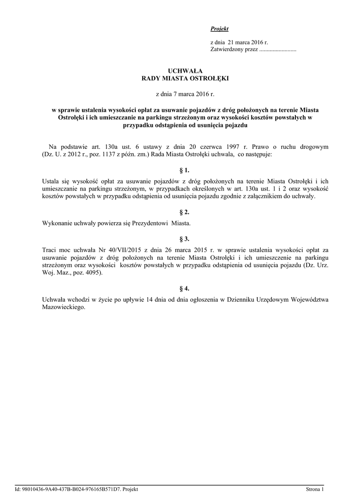 Projekt z dnia 21 marca 2016 r. Zatwierdzony przez ......................... UCHWAŁA RADY MIASTA OSTROŁĘKI z dnia 7 marca 2016 r. w sprawie ustalenia wysokości opłat za usuwanie pojazdów z dróg położonych na terenie Miasta Ostrołęki i ich umieszczanie na parkingu strzeżonym oraz wysokości kosztów powstałych w przypadku odstąpienia od usunięcia pojazdu Na podstawie art. 130a ust. 6 ustawy z dnia 20 czerwca 1997 r. Prawo o ruchu drogowym (Dz. U. z 2012 r., poz. 1137 z późn. zm.) Rada Miasta Ostrołęki uchwala, co następuje: § 1. Ustala się wysokość opłat za usuwanie pojazdów z dróg położonych na terenie Miasta Ostrołęki i ich umieszczanie na parkingu strzeżonym, w przypadkach określonych w art. 130a ust. 1 i 2 oraz wysokość kosztów powstałych w przypadku odstąpienia od usunięcia pojazdu zgodnie z załącznikiem do uchwały. § 2. Wykonanie uchwały powierza się Prezydentowi Miasta. § 3. Traci moc uchwała Nr 40/VII/2015 z dnia 26 marca 2015 r. w sprawie ustalenia wysokości opłat za usuwanie pojazdów z dróg położonych na terenie Miasta Ostrołęki i ich umieszczenie na parkingu strzeżonym oraz wysokości kosztów powstałych w przypadku odstąpienia od usunięcia pojazdu (Dz. Urz. Woj. Maz., poz. 4095). § 4. Uchwała wchodzi w życie po upływie 14 dnia od dnia ogłoszenia w Dzienniku Urzędowym Województwa Mazowieckiego. Id: 98010436-9A40-437B-B024-976165B571D7. Projekt Strona 1 Załącznik do uchwały Nr Rady Miasta Ostrołęki z dnia w sprawie ustalenia wysokości opłat za usuwanie pojazdów z dróg położonych na terenie Miasta Ostrołęki i ich umieszczanie na parkingu strzeżonym oraz wysokości kosztów powstałych w przypadkach odstąpienia od usunięcia pojazdu. Wysokość opłat za usunięcie pojazdu z drogi i jego parkowanie oraz wysokość kosztów powstałych w przypadkach odstąpienia od usunięcia pojazdu Określenie pojazdu w Wysokość opłat zależności od dopuszczalnej w złotych za masy całkowitej w tonach oraz usunięcie z rodzaju pojazdu drogi jednego pojazdu Rower, motorower Motocykl Pojazd o dopuszczalnej masie całkowitej do 3,5 t Pojazd o dopuszczalnej masie całkowitej powyżej 3,5 t do 7,5 t Pojazd o dopuszczalnej masie całkowitej powyżej 7,5 t do 16 t Pojazd o dopuszczalnej masie całkowitej powyżej 16 t Pojazd przewożący materiały niebezpieczne Id: FE4B4F39-5DBA-47F5-9D42-E8862B25601C. Projekt 50 80 310 Wysokość kosztów w złotych powstałych w przypadku odstąpienia od usunięcia pojazdu 50 50 155 Wysokość opłat w złotych za przechowywanie pojazdu na parkingu strzeżonym za każdą rozpoczętą dobę 15 22 35 460 230 47 610 305 67 910 455 122 1010 505 182 Strona 1 UZASADNIENIE do projektu Uchwały Rady Miasta Ostrołęki w sprawie ustalenia wysokości opłat za usuwanie pojazdów z dróg położonych na terenie Miasta Ostrołęki i ich umieszczanie na parkingu strzeżonym oraz wysokości kosztów powstałych w przypadku odstąpienia od usunięcia pojazdu Usuwanie pojazdów oraz prowadzenie parkingu strzeżonego dla pojazdów usuniętych w przypadkach określonych w art. 130a ust. 1 i 2 ustawy z dnia 20 czerwca 1997 r. Prawo o ruchu drogowym (tekst jednolity: Dz. U. z 2012 r., poz. 1137 z późn. zm.) należy do zadań własnych powiatu. Pojazd usunięty z drogi umieszcza się na wyznaczonym przez starostę parkingu strzeżonym do czasu uiszczenia opłaty za jego usunięcie i parkowanie. Na podstawie art. 130a ust.5f ww. ustawy Prezydent Miasta Ostrołęki powierzył wykonywanie zadań w zakresie usuwania pojazdów z drogi i ich umieszczanie na parkingu strzeżonym oraz prowadzenie parkingu Miejskiemu Zakładowi Komunikacji Spółka z o.o. w Ostrołęce przy ul. Kołobrzeskiej 1. Zgodnie z art. 130a ust. 6 cytowanej ustawy, Rada Powiatu ustala corocznie, w drodze uchwały, wysokość opłat za usunięcie i przechowywanie usuniętych pojazdów oraz wysokość kosztów odstąpienia od usunięcia. Uchwalone stawki opłat nie mogą być wyższe niż maksymalna wysokość stawek kwotowych opłat wskazanych w ustawie. Jednocześnie maksymalne stawki opłat za usuwanie i przechowywanie pojazdów ulegają corocznie zmianie na następny rok kalendarzowy i są ogłaszane przez ministra właściwego do spraw finansów publicznych w drodze obwieszczenia w Dzienniku Urzędowym Rzeczypospolitej Polskiej „Monitor Polski”. Obwieszczeniem z dnia 4 sierpnia 2015 r. Minister Finansów ogłosił maksymalne stawki opłat za usuwanie i przechowywanie pojazdów na rok 2016 (M.P.2015.707). Z uwagi na fakt, iż stawki opłat za przedmiotowe czynności, przyjęte uchwałą nr 40/VII/2015 Prezydenta Miasta Ostrołęki z dnia 26 marca 2015 r., kształtują się na poziomie wystarczającym do sprawnej realizacji zadań związanych z usuwaniem i przechowywaniem pojazdów, stąd wysokość opłat na 2016 r. pozostawiono bez zmian w stosunku do stawek obowiązujących w roku bieżącym. Mając powyższe na względzie, celem sprawnego realizowania zadań własnych powiatu konieczne jest podjęcie przedmiotowej uchwały. Id: B74480C7-30BC-45A5-96B4-EAE9A4AEDF3A. Projekt Strona 1