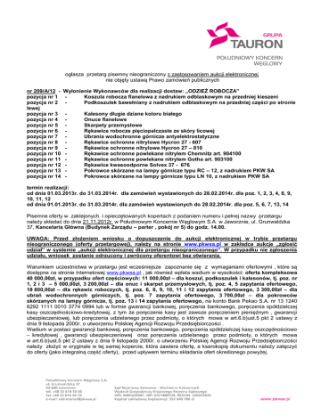 ogłasza przetarg pisemny nieograniczony z zastosowaniem aukcji elektronicznej nie objęty ustawą Prawo zamówień publicznych nr 209/A/12 pozycja nr 1 pozycja nr 2 lewej pozycja nr 3 pozycja nr 4 pozycja nr 5 pozycja nr 6 pozycja nr 7 pozycja nr 8 pozycja nr 9 pozycja nr 10 pozycja nr 11 pozycja nr 12 pozycja nr 13 pozycja nr 14 Wyłonienie Wykonawców dla realizacji dostaw: „ODZIEŻ ROBOCZA” Koszula robocza flanelowa z nadrukiem odblaskowym na przedniej kieszeni Podkoszulek bawełniany z nadrukiem odblaskowym na przedniej części po stronie - Kalesony długie dziane koloru białego Onuce flanelowe Skarpety przemysłowe Rękawice robocze pięciopalczaste ze skóry licowej Ubrania wodochronne górnicze antyelektrostatyczne Rękawice ochronne nitrylowe Hycron 27 - 607 Rękawice ochronne nitrylowe Hycron 27 – 810 Rękawice ochronne powlekane nitrylem Chemnitz art. 904100 Rękawice ochronne powlekane nitrylem Gotha art. 903100 Rękawice kwasoodporne Solvex 37 - 676 Pokrowce skórzane na lampy górnicze typu RC – 12, z nadrukiem PKW SA Pokrowce skórzane na lampy górnicze typu LN 10, z nadrukiem PKW SA termin realizacji: od dnia 01.03.2013r. do 31.03.2014r. dla zamówień wystawionych do 28.02.2014r. dla poz. 1, 2, 3, 4, 8, 9, 10, 11, 12 od dnia 01.01.2013r. do 31.03.2014r. dla zamówień wystawionych do 28.02.2014r. dla poz. 5, 6, 7, 13, 14 Pisemne oferty w zaklejonych i opieczętowanych kopertach z podaniem numeru i pełnej nazwy przetargu należy składać do dnia 21.11.2012r. w Południowym Koncernie Węglowym S.A. w Jaworznie, ul. Grunwaldzka 37, Kancelaria Główna (Budynek Zarządu – parter , pokój nr 5) do godz. 14.00. UWAGA: Przed złożeniem wniosku o dopuszczenie do aukcji elektronicznej w trybie przetargu nieograniczonego (oferty przetargowej), należy na stronie www.pkwsa.pl w zakładce aukcje „zgłosić udział” w systemie „aukcji elektronicznej dla przetargu nieograniczonego”. W przypadku nie zgłoszenia udziału, wniosek zostanie odrzucony i zwrócony oferentowi bez otwierania. Warunkiem uczestnictwa w przetargu jest wcześniejsze zapoznanie się z wymaganiami ofertowymi , które są dostępne na stronie internetowej www.pkwsa.pl , jak również wpłata wadium w wysokości: oferta kompleksowa 40 000,00zł, w przypadku ofert częściowych: 11 000,00zł – dla koszul, podkoszulek i kalesonów, tj. poz. nr 1, 2 i 3 – 5 000,00zł, 3 200,00zł – dla onuc i skarpet przemysłowych, tj. poz. 4, 5 zapytania ofertowego, 18 800,00zł – dla rękawic roboczych, tj. poz. 6, 8, 9, 10, 11 i 12 zapytania ofertowego, 3 300,00zł – dla ubrań wodochronnych górniczych, tj. poz. 7 zapytania ofertowego, 3 700,00zł – dla pokrowców skórzanych na lampy górnicze, tj. poz. 13 i 14 zapytania ofertowego, na konto Bank Pekao S.A. nr 13 1240 6292 1111 0010 3774 0994 lub w formie gwarancji bankowej, poręczenia bankowego, poręczenia spółdzielczej kasy oszczędnościowo-kredytowej, z tym że poręczenie kasy jest zawsze poręczeniem pieniężnym , gwarancji ubezpieczeniowej, lub poręczenia udzielanego przez podmioty, o których mowa w art.6.b)ust.5 pkt 2 ustawy z dnia 9 listopada 2000r. o utworzeniu Polskiej Agencji Rozwoju Przedsiębiorczości . Wadium w postaci gwarancji bankowej, poręczenia bankowego, poręczenia spółdzielczej kasy oszczędnościowo – kredytowej , gwarancji ubezpieczeniowej oraz poręczenia udzielanego przez podmioty, o których mowa w art.6.b)ust.5 pkt 2 ustawy z dnia 9 listopada 2000r. o utworzeniu Polskiej Agencji Rozwoju Przedsiębiorczości należy złożyć w oryginale w tej samej kopercie, która zawiera ofertę, a kserokopię dokumentu należy załączyć do oferty (jako integralną część oferty), przed upływem terminu składania ofert określonego powyżej. Strona 2 z 2 Ponadto dopuszczalne jest zaliczenie (przeksięgowanie) na poczet wadium, wymagalnych na dzień wniesienia wadium, zobowiązań Południowego Koncernu Węglowego SA wobec oferenta, na podstawie oświadczenia oferenta o wyborze tej formy wniesienia wadium. W przypadku pobrania wymagań ofertowych w wersji papierowej w Wydziale Umów , Budynek Centrali Telefonicznej – pok. nr 10 wymagany jest wykup wymagań ofertowych w kwocie 100zł płatne w Kasie Głównej Południowego Koncernu Węglowego S.A. czynnej codziennie od 11.00-14.00; w środę od 7.30-10.00 i 12.00-14.00 lub przelewem na konto j. w. Wzory materiałów przetargowych należy zdeponować do dnia 21.11.2012r. w zaklejonym opakowaniu w Magazynie Zakładu Górniczego Sobieski - Jaworzno, ul. Sulińskiego 2, który jest czynny od godz. 8.00 do godz. 13.00. Na opakowaniu należy umieścić: a) Nazwę i siedzibę oferenta b) Nazwę i siedzibę Zamawiającego c) Napis: „Nr przetargu: … ( wpisać numer)… W opakowaniu należy umieścić spis towarów zgodny z załączonymi wzorami. Komisyjne otwarcie ofert nastąpi w dniu 22.11.2012r. w Sali Narad –I piętro, Budynek Zarządu o godz. 10:40 Informacji udziela w sprawach: proceduralnych : Wydział Umów tel. (32) 618 51 08 /fax. (32) 618 5078/ technicznych: Remigiusz Małocha tel. ( 32 ) 627 05 03
