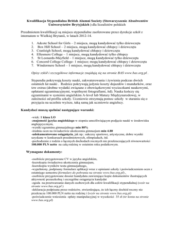 Kwalifikacja Stypendialna British Alumni Society (Stowarzyszenie Absolwentów Uniwersytetów Brytyjskich ) dla licealistów polskich Przedmiotem kwalifikacji są miejsca stypendialne zaoferowane przez dyrekcje szkół z internatem w Wielkiej Brytanii, w latach 2012-14. 1. 2. 3. 4. 5. 6. 7. Adcote School for Girls – 2 miejsca, mogą kandydować tylko dziewczęta Box Hill School – 2 miejsca, mogą kandydować chłopcy i dziewczęta Cranleigh School, mogą kandydować chłopcy i dziewczęta Ellesmere College – 1 miejsce, mogą kandydować tylko chłopcy St Leonards-Mayfield – 1 miejsce, mogą kandydować tylko dziewczęta Concord College College- 1 miejsce; mogą kandydować chłopcy i dziewczęta Windermere School – 1 miejsce, mogą kandydować chłopcy i dziewczęta Opisy szkół i szczegółowe informacje znajdują się na stronie BAS www.bas.org.pl . Stypendia pokrywają koszty nauki, zakwaterowania i żywienia podczas dwóch ostatnich lat nauki . Rodzice pokrywają jedynie koszty dojazdów i mundurków, oraz tzw extras (drobne wydatki związane z obowiązkowymi wycieczkami naukowymi, opłatami egzaminacyjnymi, wspólnymi fotografiami, itd). Nauka kończy się egzaminami w systemie angielskim A-level lub Matury Międzynarodowej, w zależności od profilu szkoły. Uczniowie otrzymają pomoc szkoły w staraniu się o przyjęcia na uczelnie wyższe, taką samą jak uczniowie angielscy. Kandydaci muszą spełniać następujące warunki: -wiek: 1 klasa LO -znajomość języka angielskiego w stopniu umożliwiającym podjęcie nauki w środowisku anglojęzycznym, -wyniki egzaminu gimnazjalnego min 80% -średnia ocen na świadectwie ukończenia gimnazjum min 4.80 -udokumentowane osiągnięcia, jak np.: sukcesy sportowe, artystyczne, dobre wyniki uzyskane w konkursach przedmiotowych, olimpiadach, itd. -pochodzenie z rodzin o łącznych dochodach rocznych nie przekraczających równowartości 100.000 PLN netto na całą rodzinę w ostatnim roku podatkowym. Wymagane dokumenty: -osobiście przygotowane CV w języku angielskim, -kserokopia świadectwa ukończenia gimnazjum, -kserokopia wyników testu gimnazjalnego, -wypełniony, podpisany formularz aplikacji wraz z opiniami szkoły i poświadczeniem ocen z ostatniego semestru (formularz do pobrania na stronie www.bas.org.pl) , -osobiście przygotowane dossier kandydata zawierające kopie dokumentów ilustrujących aktywność pozaszkolną i szczególne osiągnięcia kandydat -zgoda na przetwarzanie danych osobowych dla celów kwalifikacji stypendialnej (wzór na stronie www.bas.org.pl ) -deklaracja podpisana przez rodziców, stwierdzająca, że ich łączny dochód roczny nie przekracza 100.000 PLN netto na rodzinę i (wzór na stronie www.bas.org.pl) -poświadczenie wniesienia opłaty manipulacyjnej w wysokości 35 zł (nr konta na stronie www.bas.org.pl) Dokumenty należy przesyłać na adres: British Alumni Society Al. Jerozolimskie 59 00-697 Warszawa z dopiskiem na kopercie BAS Scholarships , do dnia 15 lutego 2012 Osoba kontaktowa: Marzena Reich, Scholarship Officer Kontakt: [email protected] Więcej informacji: www.bas.org.pl
