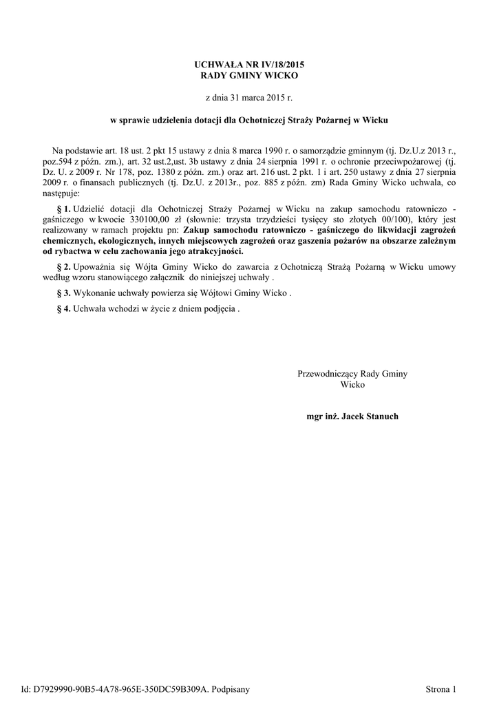 UCHWAŁA NR IV/18/2015 RADY GMINY WICKO z dnia 31 marca 2015 r. w sprawie udzielenia dotacji dla Ochotniczej Straży Pożarnej w Wicku Na podstawie art. 18 ust. 2 pkt 15 ustawy z dnia 8 marca 1990 r. o samorządzie gminnym (tj. Dz.U.z 2013 r., poz.594 z późn. zm.), art. 32 ust.2,ust. 3b ustawy z dnia 24 sierpnia 1991 r. o ochronie przeciwpożarowej (tj. Dz. U. z 2009 r. Nr 178, poz. 1380 z późn. zm.) oraz art. 216 ust. 2 pkt. 1 i art. 250 ustawy z dnia 27 sierpnia 2009 r. o finansach publicznych (tj. Dz.U. z 2013r., poz. 885 z późn. zm) Rada Gminy Wicko uchwala, co następuje: § 1. Udzielić dotacji dla Ochotniczej Straży Pożarnej w Wicku na zakup samochodu ratowniczo gaśniczego w kwocie 330100,00 zł (słownie: trzysta trzydzieści tysięcy sto złotych 00/100), który jest realizowany w ramach projektu pn: Zakup samochodu ratowniczo - gaśniczego do likwidacji zagrożeń chemicznych, ekologicznych, innych miejscowych zagrożeń oraz gaszenia pożarów na obszarze zależnym od rybactwa w celu zachowania jego atrakcyjności. § 2. Upoważnia się Wójta Gminy Wicko do zawarcia z Ochotniczą Strażą Pożarną w Wicku umowy według wzoru stanowiącego załącznik do niniejszej uchwały . § 3. Wykonanie uchwały powierza się Wójtowi Gminy Wicko . § 4. Uchwała wchodzi w życie z dniem podjęcia . Przewodniczący Rady Gminy Wicko mgr inż. Jacek Stanuch Id: D7929990-90B5-4A78-965E-350DC59B309A. Podpisany Strona 1 Załącznik do uchwały Nr IV/18/2015 Rady Gminy Wicko z dnia 31 marca 2015 r. Umowa nr ......./2015 Zawarta w dniu …………… 2015 r. w Wicku, pomiędzy: 1. Gminą Wicko, zwaną dalej Dotującym, reprezentowaną przez Wójta Gminy, w osobie Dariusza Waleśkiewicza przy kontrasygnacie Skarbnika Gminy Grażyny Pawelczyk oraz 2. Ochotniczą Strażą Pożarną w Wicku, zwaną dalej OSP, reprezentowaną przez: ………………………………..… - ………………………….…………… …………………………………. - …………………….………………… o następującej treści: § 1. 1. Na podstawie niniejszej umowy Dotujący udziela OSP pomocy finansowej w formie dotacji celowej w wysokości 330100,00 zł (słownie: trzysta trzydzieści tysięcy sto złotych 00/100) z przeznaczeniem na dofinansowanie zakupu samochodu ratowniczo - gaśniczego. 2. Kwota, o której jest mowa w ust. 1 zostanie przekazana na konto …………………………………… - w terminie 7 dni od daty otrzymania podpisanej umowy OSP nr 3. OSP nie może przeznaczyć kwoty, o której mowa w ust. 1 na realizację innych celów niż objętych niniejszą umową. § 2. OSP zobowiązuje się do terminowej realizacji zadania inwestycyjnego. § 3. 1. Dotacja celowa, o której mowa w § 1 może być wykorzystana w nieprzekraczalnym terminie do dnia 15 lipca 2015 roku. 2. W terminie 9 dni od daty wykorzystania środków z pomocy publicznej, OSP przedstawi Dotującemu rozliczenie przyznanych i wykorzystanych środków finansowych oraz zwróci niewykorzystaną część dotacji celowej na rachunek bankowy Urzędu Gminy Wicko nr …………………………………………. 3. Rozliczenie, o którym mowa w ust. 2 polegało będzie na przedłożeniu przez OSP uwierzytelnionych przez umocowane osoby kserokopii faktur, rachunków lub innych dowodów księgowych wraz z dokumentami przelewu. 4. Środki dotacji celowej wykorzystane niezgodnie z przeznaczeniem lub pobrane w nadmiernej wysokości podlegają zwrotowi do Dotującego wraz z odsetkami w wysokości określonej jak dla zaległości podatkowych w terminie do dnia 30 lipca 2015 r. na konto bankowe wskazane w ust. 2. 5. Odsetki, o których mowa w ust. 4 nalicza się w przypadku zwrotu dotacji wykorzystanej niezgodnie z przeznaczeniem od dnia przekazania dotacji na rachunek OSP do dnia zwrotu włącznie, a w przypadku stwierdzenia nienależnego pobrania dotacji od dnia tego stwierdzenia do dnia zwrotu włącznie. § 4. Gmina Wicko zastrzega sobie prawo kontroli w zakresie prawidłowości, zgodności i rzetelności realizacji dotowanego zadania, w tym dokumentów finansowych w terminie do 3 lat od dnia, w którym nastąpiło rozliczenie dotacji. § 5. Wszelkie zmiany umowy wymagają dla swej ważności formy pisemnej w formie aneksu. § 6. W sprawach nieuregulowanych niniejszą umową zastosowanie mieć będą przepisy ustawy o finansach publicznych, o samorządzie gminnym oraz przepisy pozostające w związku z niniejszą umową. Id: D7929990-90B5-4A78-965E-350DC59B309A. Podpisany Strona 1 § 7. Ewentualne spory wynikające z niniejszej umowy rozstrzygane będą przez strony w drodze wspólnych uzgodnień, a w przypadku nie osiągnięcia porozumienia, właściwym do rozstrzygania będzie Sąd Rejonowy w Lęborku. § 8. Umowa została sporządzona w 2 jednobrzmiących egzemplarzach po 1 egz. dla każdej ze stron. Gmina Wicko OSP w Wicku Id: D7929990-90B5-4A78-965E-350DC59B309A. Podpisany Strona 2 Uzasadnienie Położenie naturalne oraz zasoby środowiskowe w połączeniu z dynamicznym rozwojem gminy Wicko rodzą zagrożenia, które objawiają się w postaci konkretnych niebezpieczeństw. Materializacja tych niebezpieczeństw w formie pożarów, klęsk żywiołowych, wypadków i katastrof, czy sytuacji kryzysowych, zmusza do podejmowana doraźnych i długofalowych działań zapobiegawczych i odpowiedniego poziomu reagowania w przypadku ich wystąpienia. Według oceny Komendy Powiatowej PSP w Lęborku stan wyposażenia OPS Wicko, praktycznie cały park samochodowy jednostki kwalifikuje się do wymiany. Pojazdy są w znaczny stopniu wyeksploatowane, przestarzałe konstrukcyjnie, nie zapewniają niezawodności oraz zachowania standardów bezpieczeństwa eksploatacji. Wiek pojazdów powoduje, ze mimo dbałości o ich stan techniczny, duże nakłady pracy i kosztów bieżącego utrzymania sprawności powoduje, ze są to pojazdy o dużej awaryjności, nie dają gwarancji niezawodności sprzętu i bezpieczeństwa obsługują