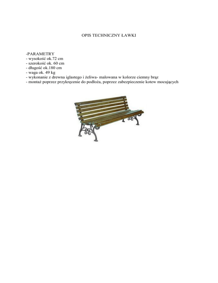 OPIS TECHNICZNY ŁAWKI -PARAMETRY - wysokość ok.72 cm - szerokość ok. 60 cm - długość ok.180 cm - waga ok. 49 kg - wykonanie z drewna iglastego i żeliwa- malowana w kolorze ciemny brąz - montaż poprzez przykręcenie do podłoża, poprzez zabezpieczenie kotew mocujących