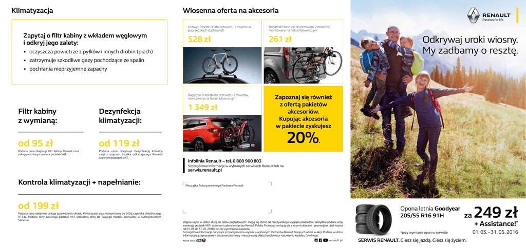 Klimatyzacja Wiosenna oferta na akcesoria Zapytaj o filtr kabiny z wkładem węglowym i odkryj jego zalety: Uchwyt Proride 80 do przewozu 1 roweru na poprzeczkach dachowych Bagażnik Hang-on do przewozu 2 rowerów, montowany na haku holowniczym 528 zł 261 zł Odkrywaj uroki wiosny. My zadbamy o resztę. • oczyszcza powietrze z pyłków i innych drobin (piach) • zatrzymuje szkodliwe gazy pochodzące ze spalin • pochłania nieprzyjemne zapachy Bagażnik Euroride do przewozu 3 rowerów, montowany na haku holowniczym Filtr kabiny z wymianą: Dezynfekcja klimatyzacji: od 95 zł od 119 zł Podana cena obejmuje filtr kabiny Renault oraz usługę wymiany i zawiera podatek VAT. Podana cena obejmuje dezynfekcję klimatyzacji z użyciem środka odkażającego Renault i zawiera podatek VAT. 1 349 zł Zapoznaj się również z ofertą pakietów akcesoriów. Kupując akcesoria w pakiecie zyskujesz 20% . Infolinia Renault – tel. 0 800 900 803 Szczegółowe informacje w wybranych serwisach Renault lub na serwis.renault.pl Kontrola klimatyzacji + napełnianie: Pieczątka Autoryzowanego Partnera Renault od 199 zł Podana cena obejmuje usługę sprawdzenia układu klimatyzacji oraz maksymalnie do 200g czynnika chłodniczego R134a. Podane ceny zawierają podatek VAT. Dokładną cenę do Twojego modelu skonsultuj w Autoryzowanym Serwisie. Opona letnia Goodyear 205/55 R16 91H Zdjęcia użyte w ulotce służą do celów poglądowych i mogą się różnić od rzeczywistego wyglądu produktów. Wszystkie podane ceny zawierają podatek VAT i są cenami zalecanymi przez Renault Polska. Promocja nie łączy się z innymi rabatami i promocjami i jest ważna od 01. 03. do 31. 05. 2016 r lub do wyczerpania zapasów. Szczegółowe informacje dotyczące promocji można uzyskać u wybranych Partnerów Renault biorących udział w akcji. Podane w ulotce informacje są zaproszeniem do zawarcia umowy i nie stanowią oferty handlowej w rozumieniu Kodeksu Cywilnego. Renault zaleca renault.pl za *przy wymianie opon w serwisie SERWIS RENAULT. Ciesz się jazdą. Ciesz się życiem. 249 zł + Assistance!* 01. 03. - 31. 05. 2016 Oferta promocyjna opon letnich Wiosenna oferta na hamulce i zawieszenie PREMIUM ECONOMY Model Rozmiar Marka Cena Marka Cena Modus 185/60 R15 84H Nokian 231 zł Fulda 199 zł Mégane III 205/55 R16 91H Goodyear 249 zł Sava 228 zł Clio III 165/65 R15 81T Goodyear 241 zł Uniroyal 203 zł Clio IV 195/55 R16 87H Nokian 316 zł Fulda 283 zł Scénic III 205/60 R16 92H Nokian 340 zł Sava 273 zł Klocki hamulcowe: Captur Mégane III, Scénic III, Fluence Kadjar Podane ceny dotyczą kompletu przednich klocków hamulcowych i zawierają podatek VAT. Dokładną cenę do Twojego modelu skonsultuj w Autoryzowanym Serwisie. ENZO B DEZENT TS NOWOŚĆ: FELGA HYBRYDOWA! rozmiar 14” – 19” rozmiar 14” – 17” rozmiar 15” rozmiar 15” – 16” od 339 zł od 362 zł 410 zł od 253 zł DEZENT TC DEZENT TX DEZENT TS DARK od 405 zł od 344 zł 467 zł rozmiar 16” – 17” rozmiar 14” – 18” rozmiar 15” Przy wymianie opon w Autoryzowanym Serwisie otrzymasz w prezencie usługę Assistance na okres 6 miesięcy oferującą bezpłatną pomoc w razie nieprzewidzianej awarii ogumienia. Podane ceny zawierają podatek VAT i dotyczą 1 sztuki. Prezent w postaci usługi Assistance na okres 6 miesięcy ma zastosowanie przy wymianie 4 opon w Autoryzowanym Serwisie. Szczegóły w Serwisach Renault. Nie znalazłeś swojego rozmiaru? Zapytaj w serwisie o ofertę dla Twojego samochodu! Czyszczenie klimatyzacji od 119 zł Amortyzatory przednie (para): Clio IV Kadjar DEZENT TD Poczuj wiosnę w pełni! 01. 03. - 31. 05. 2016 Mégane III, Scénic III, Fluence Promocja felg aluminiowych od 250 zł od 313 zł od 424 zł od 615 zł od 630 zł od 635 zł Podane ceny dotyczą 2 sztuk amortyzatorów przednich Renault i zawierają podatek VAT. Dokładną cenę do Twojego modelu skonsultuj w Autoryzowanym Serwisie. Komplet wycieraczek płaskich Renault Mégane III od 165 zł Podana cena dotyczy kompletu wycieraczek przednich typu flat blade i zawiera podatek VAT. Dokładną cenę do Twojego modelu skonsultuj w Autoryzowanym Serwisie. Aktualizacja map • Karta-zdrapka • Aktualizacja dla TomTom / TomTom live • Ważność – 12 miesięcy • 4 aktualizacje / 1 na kwartał Oferta nie dotyczy samochodów wyposażonych w system multimedialny R-Link. Cena 180 zł SERWIS RENAULT. Ciesz się jazdą. Ciesz się życiem.