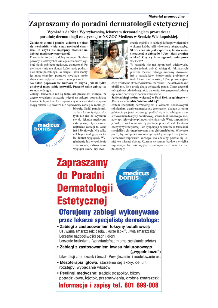 Materiał promocyjny Zapraszamy do poradni dermatologii estetycznej Wywiad z dr Niną Wyrzykowską, lekarzem dermatologiem prowadzącą poradnię dermatologii estetycznej w NS ZOZ Medicus w Środzie Wielkopolskiej. ED ICU S Za oknem zimno i ponuro, z domu nie chce czenie trądziku to zabiegi, które powinien móc się wychodzić, wielu z nas nachodzi chanwykonać każdy, jeśli tylko czuje taką potrzebę. dra. To chyba nie najlepszy moment na Skoro cena nie jest zaporowa, to kto może zabiegi medycyny estetycznej? skorzystać z zabiegów? Jest jakaś granica Przeciwnie, to bardzo dobry moment. Są dwa wieku? Czy są inne ograniczenia poza powody, dla których właśnie jesienią warto wywiekiem? brać się do gabinetu medycyny estetycznej. Po W zasadzie nie ma ograniczeń wiekowych, pierwsze – nie ma słońca, które może podrażtrzeba jednak dobrać zabieg do faktycznych niać skórę po zabiegu. Po drugie – jeśli mamy potrzeb. Pewne zabiegi możemy stosować jesienną chandrę, poprawa wyglądu może już u nastolatków, którzy mają problemy z zbawiennie wpłynąć na nasze samopoczucie. trądzikiem, inne u osób, które prewencyjnie Na takie poprawianie humoru to chyba jednak tylko chcą działać na skórę z oznakami starzenia. Chciałabym także celebryci mogą sobie pozwolić. Przecież takie zabiegi są obalić mit, że o urodę dbają wyłącznie panie. Coraz częściej strasznie drogie. mój gabinet odwiedzają także panowie, którym przeszkadzają Zabiegi faktycznie nie są tanie, ale proszę mi wierzyć, że np. coraz bardziej widoczne zmarszczki. często wydajemy znacznie więcej na zakupy poprawiające Jakie zabiegi można wykonać w Pani Doktor gabinecie w humor. Kolejna torebka dla pani, czy nowa wiertarka dla pana Medicus w Środzie Wielkopolskiej? mogą okazać się droższe niż pojedynczy zabieg w moim gaJestem specjalistą dermatologiem z wieloma dodatkowymi binecie. Nadal panuje mit, szkoleniami z zakresu medycyny estetycznej, dlatego w moim że bez kilku tysięcy złogabinecie pacjenci będą mogli poddać się m.in. zabiegom z zatych nie ma co wybierać stosowaniem toksyny botulinowej, kwasu hialuronowego, mesię do lekarza medycyny zoterapii igłowej czy pilingów chemicznych. Warto wspomnieć estetycznej, tymczasem jednak, że na terenie naszej placówki powstało całe Centrum najtańsze zabiegi to koszt Medycyny Estetycznej – do dyspozycji pacjentów są także inni już 150 złotych. Nie tylko specjaliści: chirurg plastyczny oraz chirurg flebolog. Wszystko celebryci zasługują na to, po to, by kompleksowo otoczyć opieką naszych pacjentów. by dobrze wyglądać. WySerdecznie zapraszam każdego, kto chciałby poczuć się legładzenie lub wypełnienie piej we własnej skórze. Czasem wystarczy bardzo niewielka M zmarszczek, odświeżanie ingerencja, nasz i samopoczucie znaczniePA Nsię NS ZOZ PA N TO NE - 3 1 2 PA N TON E-283 PAby N TON E - 3 1wygląd 3 B IE L B IE L TONE-3005 wyglądu skóry czy zwalpolepszyły. R A DIA L G R A DIE N T 5 0 % OPAC I T Y R ADI A PA N TO NE -3 1 2 PA NTO NE -2 S M U LT IPLY ICU Zapraszamy do Poradni Dermatologii Estetycznej R A DIA L G R A DIE N T ED R A D IA L G R A DIE N T 5 0 % OPAC IT Y C YJAN-100 NS ZOZ M Oferujemy zabiegi wykonywane przez lekarza specjalistę dermatologa: • Zabiegi z zastosowaniem toksyny botulinowej: Usuwania zmarszczek: czoła, „kurze łapki”, „lwia zmarszczka” Leczenie nadpotliwości pach i dłoni Leczenie bruksizmu (zgrzytanie/nadmierne zaciskanie zębów) • Zabiegi z zastosowaniem kwasu hialuronowego („wypełniacze”) Likwidacji zmarszczek i bruzd • Powiększenie i modelowanie ust • Mezoterapia igłowa: starzenie się skóry, cellulit, rozstępy, wypadanie włosów • Peelingi medyczne: trądzik pospolity, blizny potrądzikowe, łojotok, przebarwienia, drobne zmarszczki. Informacje i zapisy tel. 601 699-008 R A D I A L G R A D I E NT 5 0 % O PAC I