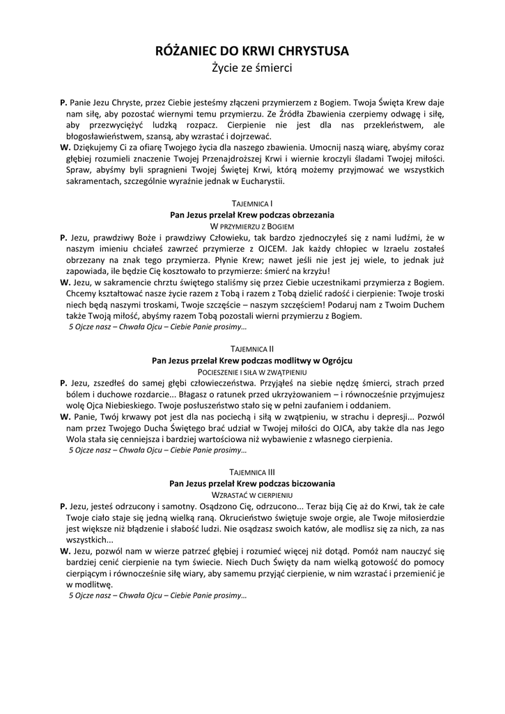 RÓŻANIEC DO KRWI CHRYSTUSA Życie ze śmierci P. Panie Jezu Chryste, przez Ciebie jesteśmy złączeni przymierzem z Bogiem. Twoja Święta Krew daje nam siłę, aby pozostad wiernymi temu przymierzu. Ze Źródła Zbawienia czerpiemy odwagę i siłę, aby przezwyciężyd ludzką rozpacz. Cierpienie nie jest dla nas przekleostwem, ale błogosławieostwem, szansą, aby wzrastad i dojrzewad. W. Dziękujemy Ci za ofiarę Twojego życia dla naszego zbawienia. Umocnij naszą wiarę, abyśmy coraz głębiej rozumieli znaczenie Twojej Przenajdroższej Krwi i wiernie kroczyli śladami Twojej miłości. Spraw, abyśmy byli spragnieni Twojej Świętej Krwi, którą możemy przyjmowad we wszystkich sakramentach, szczególnie wyraźnie jednak w Eucharystii. TAJEMNICA I Pan Jezus przelał Krew podczas obrzezania W PRZYMIERZU Z BOGIEM P. Jezu, prawdziwy Boże i prawdziwy Człowieku, tak bardzo zjednoczyłeś się z nami ludźmi, że w naszym imieniu chciałeś zawrzed przymierze z OJCEM. Jak każdy chłopiec w Izraelu zostałeś obrzezany na znak tego przymierza. Płynie Krew; nawet jeśli nie jest jej wiele, to jednak już zapowiada, ile będzie Cię kosztowało to przymierze: śmierd na krzyżu! W. Jezu, w sakramencie chrztu świętego staliśmy się przez Ciebie uczestnikami przymierza z Bogiem. Chcemy kształtowad nasze życie razem z Tobą i razem z Tobą dzielid radośd i cierpienie: Twoje troski niech będą naszymi troskami, Twoje szczęście – naszym szczęściem! Podaruj nam z Twoim Duchem także Twoją miłośd, abyśmy razem Tobą pozostali wierni przymierzu z Bogiem. 5 Ojcze nasz – Chwała Ojcu – Ciebie Panie prosimy… TAJEMNICA II Pan Jezus przelał Krew podczas modlitwy w Ogrójcu POCIESZENIE I SIŁA W ZWĄTPIENIU P. Jezu, zszedłeś do samej głębi człowieczeostwa. Przyjąłeś na siebie nędzę śmierci, strach przed bólem i duchowe rozdarcie... Błagasz o ratunek przed ukrzyżowaniem – i równocześnie przyjmujesz wolę Ojca Niebieskiego. Twoje posłuszeostwo stało się w pełni zaufaniem i oddaniem. W. Panie, Twój krwawy pot jest dla nas pociechą i siłą w zwątpieniu, w strachu i depresji... Pozwól nam przez Twojego Ducha Świętego brad udział w Twojej miłości do OJCA, aby także dla nas Jego Wola stała się cenniejsza i bardziej wartościowa niż wybawienie z własnego cierpienia. 5 Ojcze nasz – Chwała Ojcu – Ciebie Panie prosimy… TAJEMNICA III Pan Jezus przelał Krew podczas biczowania WZRASTAD W CIERPIENIU P. Jezu, jesteś odrzucony i samotny. Osądzono Cię, odrzucono... Teraz biją Cię aż do Krwi, tak że całe Twoje ciało staje się jedną wielką raną. Okrucieostwo świętuje swoje orgie, ale Twoje miłosierdzie jest większe niż błądzenie i słabośd ludzi. Nie osądzasz swoich katów, ale modlisz się za nich, za nas wszystkich... W. Jezu, pozwól nam w wierze patrzed głębiej i rozumied więcej niż dotąd. Pomóż nam nauczyd się bardziej cenid cierpienie na tym świecie. Niech Duch Święty da nam wielką gotowośd do pomocy cierpiącym i równocześnie siłę wiary, aby samemu przyjąd cierpienie, w nim wzrastad i przemienid je w modlitwę. 5 Ojcze nasz – Chwała Ojcu – Ciebie Panie prosimy… TAJEMNICA IV Pan Jezus przelał Krew podczas cierniem koronowania PRAWDZIWA SZLACHETNOŚD P. Jezu, pozwoliłeś, aby Cię wyśmiano, wyszydzono, a nawet ukoronowano cierniem, aby odpokutowad za nasz brak szacunku i czci. Ale prawdziwej szlachetności, która pochodzi od Boga, szydercy nie mogą zniszczyd. Twoje milczenie przezwycięża pełne nienawiści krzyki otoczenia. W. Panie, niech Krew korony cierniowej pozwoli nam wziąd udział w Twojej godności królewskiej. Jesteśmy przecież dziedmi tego samego OJCA! Podaruj nam pokój serca, który tylko Ty możesz dad, i pozwól nam błogosławid wszystkich, którzy chcą zniszczyd naszą godnośd. 5 Ojcze nasz – Chwała Ojcu – Ciebie Panie prosimy… TAJEMNICA V Pan Jezus przelał Krew na Drodze Krzyżowej KRWAWE ŚLADY MIŁOŚCI P. Jezu, Twoja droga krzyżowa jest pełna poniżenia, a jednak jest drogą zwycięstwa. Pozwalasz się pocieszyd i przyjmujesz pomoc, troszczysz się o tych, którzy płaczą... i nie wstydzisz się własnej słabości. Ciągle na nowo upadasz, ale mocniejsza od męki jest Twoja miłośd. Ona pozwala Ci wytrwad do kooca. W. Jezu, pozwól nam iśd za Tobą krwawymi śladami Twojej miłości. Niech one pomogą nam iśd pokornie i wytrwale – aż pod krzyż. W ten sposób chcemy razem z Tobą zwycięstwo wywalczyd, wycierpied, kochając do kooca... 5 Ojcze nasz – Chwała Ojcu – Ciebie Panie prosimy… TAJEMNICA VI Pan Jezus przelał Krew przy ukrzyżowaniu ZWYCIĘSTWO WEWNĘTRZNEJ WOLNOŚCI P. Jezu, przybito Cię do krzyża. Okrucieostwo chce zatriumfowad, ale to Twoja miłośd zwycięża, modląc się i błogosławiąc. Im bardziej Cię ranią i krzyżują, tym bardziej jesteś wewnętrznie wolny, ponieważ cierpisz z miłości – aby nas zbawid... W. Jezu, pozwól nam poznad i doświadczyd tej wolności, za którą Ty „zapłaciłeś” Krwią twoich ran. Ukaż nam tajemnicę prawdziwego i wiecznego szczęścia i wzbudź w nas tęsknotę za nim. 5 Ojcze nasz – Chwała Ojcu – Ciebie Panie prosimy… TAJEMNICA VII Pan Jezus przelał Krew i wodę przy otwarciu boku włócznią PRZYJĄD KREW CHRYSTUSA P. Jezu, pozwalasz się przebid, aby Twoja śmierd stała się widoczna dla wszystkich. Pozwalasz otworzyd swoje Serce, aby wszyscy znaleźli w nim prawdziwy dom, prawdziwe bezpieczeostwo, ochronę i źródło Bożej miłości już na tym świecie. W. Jezu, chcemy z głęboką czcią przyjmowad Twoje sakramenty, ponieważ w nich przyjmujemy Twoją Świętą Krew, która daje nam życie. To jest ta sama Krew co na Golgocie, chociaż w innej postaci. To Boska Krew, Boskie życie, które wypływa dla nas w sakramentach Kościoła. 3 Ojcze nasz – Chwała Ojcu – Ciebie Panie prosimy…