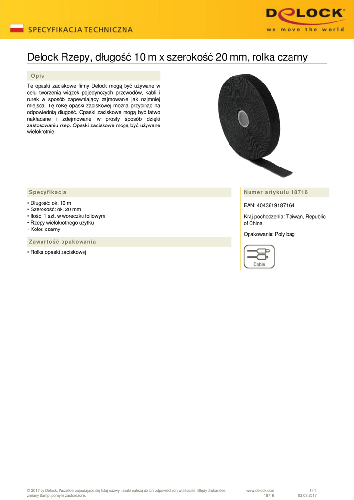 Delock Rzepy, długość 10 m x szerokość 20 mm, rolka czarny Opis Te opaski zaciskowe firmy Delock mogą być używane w celu tworzenia wiązek pojedynczych przewodów, kabli i rurek w sposób zapewniający zajmowanie jak najmniej miejsca. Tę rolkę opaski zaciskowej można przycinać na odpowiednią długość. Opaski zaciskowe mogą być łatwo nakładane i zdejmowane w prosty sposób dzięki zastosowaniu rzep. Opaski zaciskowe mogą być używane wielokrotnie. Specyfikacja • Długość: ok. 10 m • Szerokość: ok. 20 mm • Ilość: 1 szt. w woreczku foliowym • Rzepy wielokrotnego użytku • Kolor: czarny Numer artykułu 18716 EAN: 4043619187164 Kraj pochodzenia: Taiwan, Republic of China Opakowanie: Poly bag Zawartość opakowania • Rolka opaski zaciskowej © 2017 by Delock. Wszelkie pojawiające się tutaj nazwy i znaki należą do ich odpowiednich właścicieli. Błędy drukarskie, zmiany & pomyłki zastrzeżone. Powered by TCPDF (www.tcpdf.org) www.delock.com 18716 1/1 03.03.2017