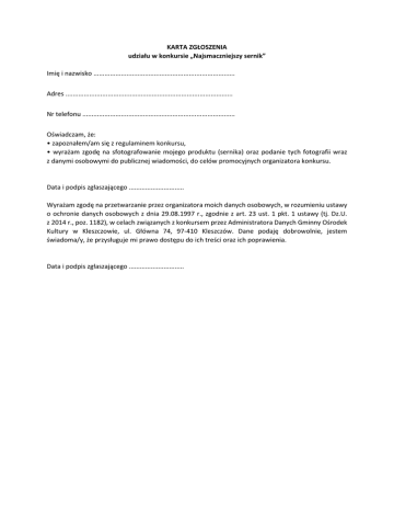 KARTA ZGŁOSZENIA udziału w konkursie „Najsmaczniejszy sernik” Imię i nazwisko ............................................................................. Adres ........................................................................................... Nr telefonu ................................................................................... Oświadczam, że: • zapoznałem/am się z regulaminem konkursu, • wyrażam zgodę na sfotografowanie mojego produktu (sernika) oraz podanie tych fotografii wraz z danymi osobowymi do publicznej wiadomości, do celów promocyjnych organizatora konkursu. Data i podpis zgłaszającego .............................. Wyrażam zgodę na przetwarzanie przez organizatora moich danych osobowych, w rozumieniu ustawy o ochronie danych osobowych z dnia 29.08.1997 r., zgodnie z art. 23 ust. 1 pkt. 1 ustawy (tj. Dz.U. z 2014 r., poz. 1182), w celach związanych z konkursem przez Administratora Danych Gminny Ośrodek Kultury w Kleszczowie, ul. Główna 74, 97-410 Kleszczów. Dane podaję dobrowolnie, jestem świadoma/y, że przysługuje mi prawo dostępu do ich treści oraz ich poprawienia. Data i podpis zgłaszającego ..............................