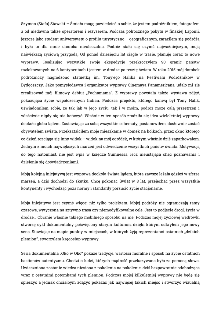 Szymon (Stafa) Stawski – Śmiało mogę powiedzieć o sobie, że jestem podróżnikiem, fotografem a od niedawna także operatorem i reżyserem. Podczas półrocznego pobytu w fińskiej Laponii, jeszcze jako student uniwersytetu o profilu turystyczno – geograficznym, zaraziłem się podróżą i była to dla mnie choroba nieuleczalna. Podróż stała się czymś najważniejszym, moją największą życiową przygodą. Od ponad dziesięciu lat ciągle w trasie, planuję coraz to nowe wyprawy. Realizując wszystkie swoje ekspedycje przekroczyłem 90 granic państw rozlokowanych na 6 kontynentach i jestem w drodze po resztę świata. W roku 2015 mój dorobek podróżniczy nagrodzono statuetką im. Tony’ego Halika na Festiwalu Podróżników w Bydgoszczy. Jako pomysłodawca i organizator wyprawy Cinemaya Panamericana, udało mi się zrealizować mój filmowy debiut „Pachamama”. Z wyprawy powstała także wystawa zdjęć, pokazująca życie współczesnych Indian. Podczas projektu, którego kanwą był Tony Halik, uświadomiłem sobie, że tak jak w jego życiu, tak i w moim, podróż może całą przestrzeń i właściwie nigdy się nie kończyć. Właśnie w ten sposób zrodziła się idea wieloletniej wyprawy dookoła globu lądem. Zostawiając za sobą wszystkie schematy, postanowiłem, dosłownie zostać obywatelem świata. Przekształciłem moje mieszkanie w domek na kółkach, przez okno którego co dzień rozciąga się inny widok – widok na mój ogródek, w którym właśnie dziś zaparkowałem. Jednym z moich największych marzeń jest odwiedzenie wszystkich państw świata. Motywacją do tego natomiast, nie jest wpis w księdze Guinnessa, lecz nieustająca chęć poznawania i dzielenia się doświadczeniami. Moją kolejną inicjatywą jest wyprawa dookoła świata lądem, która zawsze leżała gdzieś w sferze marzeń, a dziś dochodzi do skutku. Chcę pokonać Świat w 8 lat, przejechać przez wszystkie kontynenty i wychodząc poza normy i standardy porzucić życie stacjonarne. Moja inicjatywa jest czymś więcej niż tylko projektem. Mojej podróży nie ograniczają ramy czasowe, wytyczona na sztywno trasa czy niemodyfikowalne cele. Jest to podjęcie drogi, życia w drodze… Obranie właśnie takiego mobilnego sposobu na nie. Podczas mojej życiowej wędrówki stworzę cykl dokumentalny poświęcony starym kulturom, dzięki którym odkryłem jego nowy sens. Stawiając na mapie punkty w miejscach, w których żyją reprezentanci ostatnich „dzikich plemion”, stworzyłem kręgosłup wyprawy. Seria dokumentalna „Oko w Oko” pokaże tradycje, wartości moralne i sposób na życie ostatnich bastionów autentyzmu. Chodzi o ludzi, których mądrość przekazywana była za pomocą słowa. Uwieczniona zostanie wiedza niesiona z pokolenia na pokolenie, dziś bezpowrotnie odchodząca wraz z ostatnimi potomkami tych plemion. Podczas mojej kilkuletniej wyprawy nie będę się śpieszyć a jednak chciałbym zdążyć pokazać jak najwięcej takich miejsc i stworzyć wizualną encyklopedię rdzennych mieszkańców naszej planety. Dla mnie, jako człowieka całe życie poszukującego nowych horyzontów, będzie to doskonała nauka, podczas której pogłębię swoją wiedzę, o spojrzenie „starszyzny naszego świata”. Podczas wszystkich moich podróży – czy to w Polsce czy na „końcu świata” – spotykam ludzi z pasją. Pozostawiają oni we mnie iskrę, motywującą do działania, którą postanowiłem przekazać dalej. Właśnie dlatego, cykl „Oko w Oko z Pasją” będzie poświęcony osobom o wielkiej determinacji. Skupię się w nim na ludziach, którzy mimo trudności i długiej drogi, nie poddali się i żyją realizując swoje marzenia. Postrzegam siebie jako jedną z takich osób i chciałbym poprzez odcinki, motywować wszystkich do samorealizacji i siać ziarno aktywnego stylu życia. W serii filmowej pokażę prawdziwych pasjonatów: alpinistów, muzyków, nurków, mnichów, zbieraczy i innych ekscentrycznych – można by nawet powiedzieć – szalonych, a jednak mocno stąpających po świecie osób. Będą to historie zwyczajnych ludzi, żyjących w niezwyczajny sposób. Jako, że zawsze zdążę się gdzieś spóźnić, pośpiech będzie ostatnią wytyczną mobilizującą mnie do działania. Mam zamiar przestać posługiwać się czwartym wymiarem, jakim jest czas. Fakt ten doskonale komponuje się z procesem powstawania filmu dokumentalnego, który w takich warunkach będzie rozwijał się w miejscu i momencie, którego dotyczy. W ten sposób bohaterowie będą mieli aktywny wpływ na treści w nim zawarte. Poprzez film będę komunikować się ze światem z którego pochodzę, mając w ten sposób wpływ (mam nadzieję), na formowanie go. Moje filmy, a także inne treści edukacyjne, będę prezentować na wielkim ekranie mojego kina obwoźnego. Nie pójdzie w las doświadczenie zdobyte podczas projektu Cinemaya Panamericana. Ze wsparciem polskiego Ministerstwa Kultury podróżowałem ponad rok, aby Indian i Latynosów zapoznać z polską sztuką filmową. Pokonałem wtedy 60 tyś km, organizując kilkadziesiąt spotkań przed kinowym ekranem. Takie projekcje doskonale łączą się ze wszystkimi formami warsztatów, zabaw oraz innych event’ów interaktywnych. Moje kino nie będzie skupiać się jednak tylko wokół zabawy. Selektywnie dobrany materiał posłuży do edukacji lokalnych społeczności. Do poszerzania ich wiedzy na temat praw człowieka i niematerialnej wartości ziemi jako naszej matki.