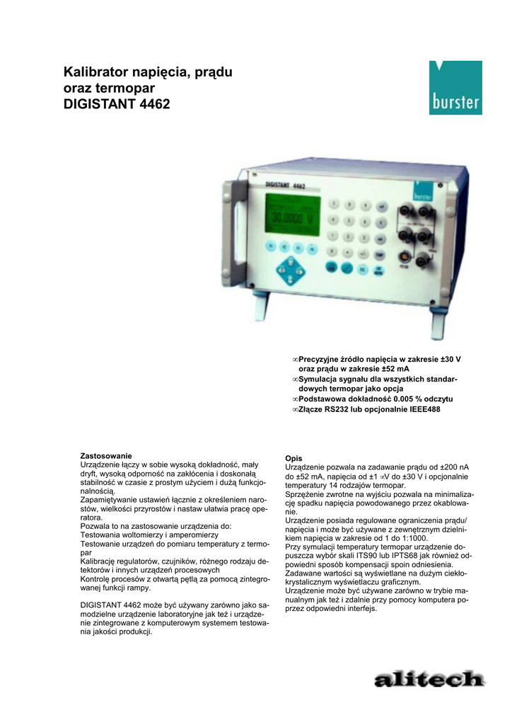 Kalibrator napięcia, prądu oraz termopar DIGISTANT 4462 • Precyzyjne źródło napięcia w zakresie ±30 V oraz prądu w zakresie ±52 mA • Symulacja sygnału dla wszystkich standardowych termopar jako opcja • Podstawowa dokładność 0.005 % odczytu • Złącze RS232 lub opcjonalnie IEEE488 Zastosowanie Urządzenie łączy w sobie wysoką dokładność, mały dryft, wysoką odporność na zakłócenia i doskonałą stabilność w czasie z prostym użyciem i dużą funkcjonalnością. Zapamiętywanie ustawień łącznie z określeniem narostów, wielkości przyrostów i nastaw ułatwia pracę operatora. Pozwala to na zastosowanie urządzenia do: Testowania woltomierzy i amperomierzy Testowanie urządzeń do pomiaru temperatury z termopar Kalibrację regulatorów, czujników, różnego rodzaju detektorów i innych urządzeń procesowych Kontrolę procesów z otwartą pętlą za pomocą zintegrowanej funkcji rampy. DIGISTANT 4462 może być używany zarówno jako samodzielne urządzenie laboratoryjne jak też i urządzenie zintegrowane z komputerowym systemem testowania jakości produkcji. Opis Urządzenie pozwala na zadawanie prądu od ±200 nA do ±52 mA, napięcia od ±1 µV do ±30 V i opcjonalnie temperatury 14 rodzajów termopar. Sprzężenie zwrotne na wyjściu pozwala na minimalizację spadku napięcia powodowanego przez okablowanie. Urządzenie posiada regulowane ograniczenia prądu/ napięcia i może być używane z zewnętrznym dzielnikiem napięcia w zakresie od 1 do 1:1000. Przy symulacji temperatury termopar urządzenie dopuszcza wybór skali ITS90 lub IPTS68 jak również odpowiedni sposób kompensacji spoin odniesienia. Zadawane wartości są wyświetlane na dużym ciekłokrystalicznym wyświetlaczu graficznym. Urządzenie może być używane zarówno w trybie manualnym jak też i zdalnie przy pomocy komputera poprzez odpowiedni interfejs. Główne menu urządzenia Współczynnik dzielnika dla dzielnika zewnętrznego. Wartość napięcia odpowiada wartości, która pojawia się na wyjściu. Tryb wyboru zakresu Czujnik zewnętrzny MAN Ograniczenie dla prądu OVER GR : 55mA 01 dx: 1.00000 V 30.0000 V Nowa wartość przyrostu może być wprowadzona dx POL+ STBY POL Aktualna wartość przyrostu Wartość zadawana Polaryzacja ujemna Polaryzacja dodatnia Tryb STANDBY Ostatnia zadana wartość jest zapamiętywana Przykłady ustawiania pracy Konfiguracja rampy nr 1 SEQUENZ: TRIANGEL REPETITIONS: 17 START-VAL.: 0.0 mV END-VAL.: 250.0 mV DELTA-VAL.: 25.0 mV DELTA_TIME.hh:mm:ss.s Funkcja rampy Rampa 1 – stałe wartości przyrostów i kroków czasowych Rampa 2 – zmienne wartości przyrostów i kroków czasowych. Funkcja rampy umożliwia zadawanie sygnałów w kształcie piły lub trójkąta. Ilość kroków może być ustawiana od 1 do 99 (0 oznacza sygnał stały). Wartości START, END i DELTA można wprowadzać w µV, mV, V, mA i °C. W ostatniej linii jest wyświetlany przyrost czasowy. RETU Ustawianie granicy prądu/napięcia LIMITATION U-LIMIT: Ograniczenie napięcia/prądu Jeśli zadana jest wartość napięcia lub temperatury, ograniczenie prądu włącza się automatycznie. Odpowiednio, jeśli zadawany jest prąd automatycznie włącza się ograniczenie napięcia. Napięcie jest ograniczone od 1 V do 32 V natomiast prąd od 1 mA do 55 mA. 20 V I – LIMIT: 10 mA 1 V > — < 32 V HOME RETU Menu dla termopar TC-TYPE: RJ-TYPE: RJ-TEMP: K Ustawianie odczytów Pt100 IPT68 EXTERN 300.00K TEMP.DIMENSION: SKALE: K IPTS68 HOME RETU A = 0.0039083 Ro = 100 B = -5.775E-07 C = -4.183E-12 DIN EN: 0.0039083 0.003 < — > 0.006 Exp EN HOME RETU Opcjonalnie można symulować temperaturę z termopar typu R, S, B, J, T, E, K, U, L, N, M, C, D oraz G2. Przy ustawianiu manualnym temperatury odniesienia na 0 °C dokładność zależy od rodzaju termopary i jest na poziomie od 0.1 °C. Temperatura zimnego złącza może być kompensowana przez zewnętrzny czujnik Pt100. Zadawanie napięcia Zakres ± Rozdzielczość Granica błędu w 23°C Współczynnik temperaturowy względem 23 °C 30 V 0.1 mV 0.003% odczytu + + 200 µV dla <±4.5 V +1.1 mV dla >±4.5 V 8ppm/K +10µV/K 3V 10 µV 0.003% odczytu + + 20 µV dla <±450 mV +110 µV dla >±450 mV 8ppm/K +1µV/K 300 mV 1 µV 0.003% odczytu + + 3 µV dla <±45 mV +11 µV dla >±45 mV 8ppm/K +0.35µV/K Zadawanie prądu Zakres ± 52 mA Rozdzielczość 200 nA Granica błędu w 23°C 0.007% odczytu+ + 0.6 µA dla <±7.5 mA + 3 µA dla >±7.5 mA Współczynnik temperaturowy względem 23 °C 10ppm/K +10nA/K Obciążenie: max. 30 V przy 52 mA Współczynnik ufności dla błędów: 95% (K=2). Opcja: Symulacja termopar Typ Zakres Błąd (±K) R +250 ...1768 °C 0.4 S +350 ...1768 °C 0.4 B +800 ...1820 °C 0.5 J -210 ...900 °C 0.2 T -170 ...400 °C 0.2 E -220 ...1000 °C 0.2 K -50 ...800 °C 0.1 U -100 ...600 °C 0.3 L -100 ...750 °C 0.2 N -120 ...1200 °C 0.2 M -50 ...900 °C 0.1 C +100 ...900 °C 0.2 D +300 ...1100 °C 0.2 G2 +300 ...2100 °C 0.3 Błędy zostały określone przy zewnętrznym złączu odniesienia w 0 °C. Przy użyciu zewnętrznego czujnika Pt100 do pomiaru temperatury złącza i wprowadzeniu jego wyników kalibracji dokładność pomiaru temperatury zimnego złącza jest lepsza niż 0.1 K przy temperaturze środowiskowej pomiędzy 15 a 35 °C Opcja: Pomiar temperatury z czujnika Pt100 Zakres Rozdzielczość Prąd (mA) Współczynnik temperaturowy -200 ... 850 °C 0.01 K 0.6 0.006% odczytu +0.045 K Rezystancja wewnętrzna: dla napięcia <10 mΩ dla prądu >500 MΩ Czas nagrzewania 30 min. Stabilność: dryft napięcia <20 ppm/rok+2µV/rok (300 mV) <20 ppm/rok+6µV/rok (3 V) <20 ppm/rok+10µV/rok (30 V) dryft prądu <70 ppm/rok+0.5µA/rok Zewnętrzny dzielnik 1 do 1010 Ograniczenie prądu dla U do 30V od 1 mA do 50 mA Ograniczenie napięcia dla I do 50 mA od 1 V do 30 V Wyświetlacz graficzny LCD podświetlany 56.3x38 mm, rozdz. 128x64 piksele Gniazda +WY, -WY, +Czujnik, Czujnik, GND 4mm pozlacane 6-pin LEMO do Pt100 (opcja) Obudowa 