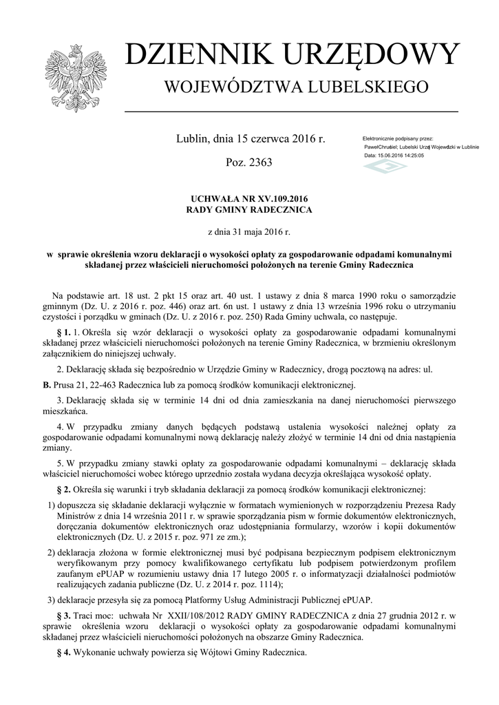 Uchwała Nr XV.109.2016 z dnia 31 maja 2016 r.