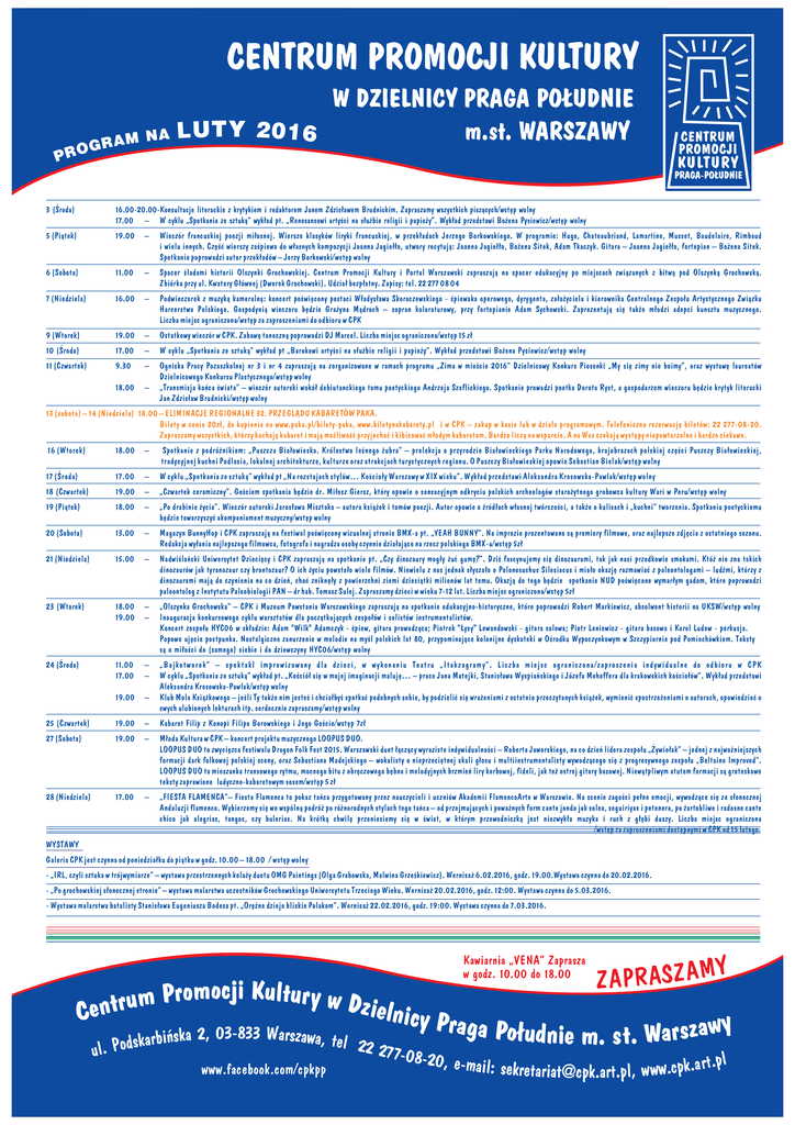 CENTRUM PROMOCJI KULTURY W DZIELNICY PRAGA POŁUDNIE m.st. WARSZAWY 3 (Środa) 16.00-20.00-Konsultacje literackie z krytykiem i redaktorem Janem Zdzisławem Brudnickim. Zapraszamy wszystkich piszących/wstęp wolny 17.00 – W cyklu „Spotkania ze sztuką” wykład pt. „Renesansowi artyści na służbie religii i papieży”. Wykład przedstawi Bożena Pysiewicz/wstęp wolny 5 (Piątek) 19.00 – Wieczór francuskiej poezji miłosnej. Wiersze klasyków liryki francuskiej, w przekładach Jerzego Borkowskiego. W programie: Hugo, Chateaubriand, Lamartine, Musset, Baudelaire, Rimbaud i wielu innych. Część wierszy zaśpiewa do własnych kompozycji Joanna Jagiełło, utwory recytują: Joanna Jagiełło, Bożena Sitek, Adam Tkaczyk. Gitara – Joanna Jagiełło, fortepian – Bożena Sitek. Spotkanie poprowadzi autor przekładów – Jerzy Borkowski/wstęp wolny 6 (Sobota) 11.00 – Spacer śladami historii Olszynki Grochowskiej. Centrum Promocji Kultury i Portal Warszawski zapraszają na spacer edukacyjny po miejscach związanych z bitwą pod Olszynką Grochowską. Zbiórka przy ul. Kwatery Głównej (Dworek Grochowski). Udział bezpłatny. Zapisy: tel. 22 277 08 04 7 (Niedziela) 16.00 – Podwieczorek z muzyką kameralną: koncert poświęcony postaci Władysława Skoraczewskiego - śpiewaka operowego, dyrygenta, założyciela i kierownika Centralnego Zespołu Artystycznego Związku Harcerstwa Polskiego. Gospodynią wieczoru będzie Grażyna Mądroch – sopran koloraturowy, przy fortepianie Adam Sychowski. Zaprezentują się także młodzi adepci kunsztu muzycznego. Liczba miejsc ograniczona/wstęp za zaproszeniami do odbioru w CPK 9 (Wtorek) 19.00 – Ostatkowy wieczór w CPK. Zabawę taneczną poprowadzi DJ Marcel. Liczba miejsc ograniczona/wstęp 15 zł 10 (Środa) 17.00 – W cyklu „Spotkania ze sztuką” wykład pt „Barokowi artyści na służbie religii i papieży”. Wykład przedstawi Bożena Pysiewicz/wstęp wolny 11 (Czwartek) 9.30 – 18.00 – Ogniska Pracy Pozaszkolnej nr 3 i nr 4 zapraszają na zorganizowane w ramach programu „Zima w mieście 2016” Dzielnicowy Konkurs Piosenki „My się zimy nie boimy”, oraz wystawę laureatów Dzielnicowego Konkursu Plastycznego/wstęp wolny „Transmisja końca świata” – wieczór autorski wokół debiutanckiego tomu poetyckiego Andrzeja Szaflickiego. Spotkanie prowadzi poetka Dorota Ryst, a gospodarzem wieczoru będzie krytyk literacki Jan Zdzisław Brudnicki/wstęp wolny 13 (sobota) – 14 (Niedziela) 18.00 – ELIMINACJE REGIONALNE 32. PRZEGLĄDU KABARETÓW PAKA. Bilety w cenie 20zł, do kupienia na www.paka.pl/bilety-paka, www.biletynakabarety.pl i w CPK – zakup w kasie lub w dziale programowym. Telefoniczna rezerwację biletów: 22 277-08-20. Zapraszamy wszystkich, którzy kochają kabaret i mają możliwość przyjechać i kibicować młodym kabaretom. Bardzo liczą na wsparcie. A na Was czekają występy niepowtarzalne i bardzo ciekawe. 16 (Wtorek) 18.00 – Spotkanie z podróżnikiem: „Puszcza Białowieska. Królestwo leśnego żubra” – prelekcja o przyrodzie Białowieskiego Parku Narodowego, krajobrazach polskiej części Puszczy Białowieskiej, tradycyjnej kuchni Podlasia, lokalnej architekturze, kulturze oraz atrakcjach turystycznych regionu. O Puszczy Białowieskiej opowie Sebastian Bielak/wstęp wolny 17 (Środa) 17.00 – W cyklu „Spotkania ze sztuką” wykład pt „Na rozstajach stylów… Kościoły Warszawy w XIX wieku”. Wykład przedstawi Aleksandra Kresowska-Pawlak/wstęp wolny 18 (Czwartek) 19.00 – „Czwartek ceramiczny”. Gościem spotkania będzie dr. Miłosz Giersz, który opowie o sensacyjnym odkryciu polskich archeologów starożytnego grobowca kultury Wari w Peru/wstęp wolny 19 (Piątek) 18.00 – „Po drabinie życia”. Wieczór autorski Jarosława Misztaka – autora książek i tomów poezji. Autor opowie o źródłach własnej twórczości, a także o kulisach i „kuchni” tworzenia. Spotkaniu poetyckiemu będzie towarzyszyć akompaniament muzyczny/wstęp wolny 20 (Sobota) 13.00 – Magazyn BunnyHop i CPK zapraszają na festiwal poświęcony wizualnej stronie BMX-a pt. „YEAH BUNNY”. Na imprezie prezentowane są premiery filmowe, oraz najlepsze zdjęcia z ostatniego sezonu. Redakcja wyłania najlepszego filmowca, fotografa i nagradza osoby czynnie działające na rzecz polskiego BMX-a/wstęp 5zł 21 (Niedziela) 15.00 – Nadwiślański Uniwersytet Dziecięcy i CPK zapraszają na spotkanie pt. „Czy dinozaury mogły żuć gumę?”. Dziś fascynujemy się dinozaurami, tak jak nasi przodkowie smokami. Któż nie zna takich dinozaurów jak tyranozaur czy brontozaur? O ich życiu powstało wiele filmów. Niewielu z nas jednak słyszało o Polonosuchus Silesiacus i miało okazję rozmawiać z paleontologami – ludźmi, którzy z dinozaurami mają do czynienia na co dzień, choć zniknęły z powierzchni ziemi dziesiątki milionów lat temu. Okazją do tego będzie spotkanie NUD poświęcone wymarłym gadom, które poprowadzi paleontolog z Instytutu Paleobiologii PAN – dr hab. Tomasz Sulej. Zapraszamy dzieci w wieku 7-12 lat. Liczba miejsc ograniczona/wstęp 5zł 23 (Wtorek) 18.00 19.00 – – „Olszynka Grochowska” – CPK i Muzeum Powstania Warszawskiego zapraszają na spotkanie edukacyjno-historyczne, które poprowadzi Robert Markiewicz, absolwent historii na UKSW/wstęp wolny Inauguracja konkursowego cyklu warsztatów dla początkujących zespołów i solistów instrumentalistów. Koncert zespołu HYC06 w składzie: Adam "Wilk" Adamczyk - śpiew, gitara prowadząca; Piotrek "Łysy" Lewandowski - gitara solowa; Piotr Leniewicz - gitara basowa i Karol Ludew - perkusja. Popowe ujęcie postpunka. Nostalgiczne zanurzenie w melodie na myśl polskich lat 80, przypominające kolonijne dyskoteki w Ośrodku Wypoczynkowym w Szczypiornie pod Pomiechówkiem. Teksty są o miłości do (samego) siebie i do dziewczyny HYC06/wstęp wolny 24 (Środa) 11.00 17.00 – – 19.00 
