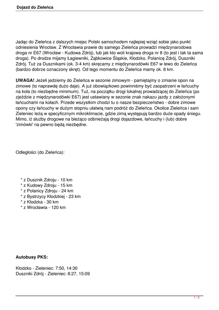 Dojazd do Zieleńca Jadąc do Zieleńca z dalszych miejsc Polski samochodem najlepiej wziąć sobie jako punkt odniesienia Wrocław. Z Wrocławia prawie do samego Zieleńca prowadzi międzynarodowa droga nr E67 (Wrocław - Kudowa Zdrój), lub jak kto woli krajowa droga nr 8 (to jest i tak ta sama droga). Po drodze mijamy Łagiewniki, Ząbkowice Śląskie, Kłodzko, Polanicę Zdrój, Duszniki Zdrój. Tuż za Dusznikami (ok. 3-4 km) skręcamy z międzynarodówki E67 w lewo do Zieleńca (bardzo dobrze oznaczony skręt). Od tego momentu do Zieleńca mamy ok. 8 km. UWAGA! Jeżeli jedziemy do Zieleńca w sezonie zimowym - pamiętajmy o zmianie opon na zimowe (to naprawdę dużo daje). A już obowiązkowo powinniśmy być zaopatrzeni w łańcuchy na koła (to niezbędne minimum). Tuż, na początku drogi lokalnej prowadzącej do Zieleńca (po zjeździe z międzynarodówki E67) jest ustawiany w sezonie znak nakazu jazdy z założonymi łańcuchami na kołach. Przede wszystkim chodzi tu o nasze bezpieczeństwo - dobre zimowe opony czy łańcuchy w dużym stopniu ułatwią nam podróż do Zieleńca. Okolice Zieleńca i sam Zieleniec leżą w specyficznym mikroklimacie, gdzie zimą występują bardzo duże opady śniegu. Mimo, iż służby drogowe na bieżąco odśnieżają drogi dojazdowe, łańcuchy i (lub) dobre 'zimówki' na pewno będą niezbędne. Odległości (do Zieleńca): * z Dusznik Zdroju - 10 km * z Kudowy Zdroju - 15 km * z Polanicy Zdroju - 24 km * z Bystrzycy Kłodzkiej - 23 km * z Kłodzka - 30 km * z Wrocławia - 120 km Autobusy PKS: Kłodzko - Zieleniec: 7:50, 14:30 Duszniki Zdrój - Zieleniec: 8:27, 15:09 1/2 Dojazd do Zieleńca * autobusy nie kursują 25 XII, I dzień Świąt Wielkanocnych Dojazd PKP: Jadąc pociągiem do Zieleńca z dowolnego miejsca w Polsce miejscowością docelową (na bilecie) są Duszniki Zdrój. Niestety kolej do Zieleńca nie dochodzi. Wiele większych miast np. Gdynia, Warszawa ma bezpośrednie połączenie kolejowe z Dusznikami (pociągi te docelowo jadą do Kudowy), więc nie ma problemu z przesiadkami. Jeżeli takie połączenia nie mamy kierujemy się tak samo jak samochodem: Wrocław (to pierwszy etap). Z Wrocławia szukamy połączeń do Kudowy Zdroju (wtedy jedziemy do samych Dusznik) lub Kłodzka (wtedy w Kłodzku przesiadka na pociąg do Kudowy). Rozklad PKP 2/2