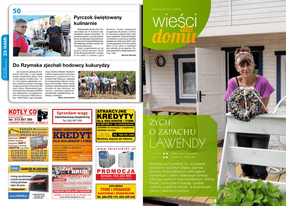 50 Pyrczok świętowany kulinarnie Wielkopolskie Święto Pyry Pyrczok odbyło się 13 września w Sędziwojewie (powiat wrzesiński). To przede wszystkim uczta dla podniebienia, bo ideą festynu jest prezentacja kulinarnych tradycji Wielkopolski. Obowiązkowy składnik potraw stanowi poznańska pyra. Festyn zorganizowało po raz czwarty Stowarzyszenie Kobiet Gminy Września „Wrzoski”, a wzięło w nim udział 17 sołectw z gmin ZA NAMI NR 10 (58) PA Ź D Z I E R N I K 2 0 1 5 LUDZIE październik 2015 Września i Pyzdry. Gospodynie przygotowały 30 potraw z ziemniaka - były placki, pierogi, kluski, frytki, zupy i zapiekanki. Długi stół biesiadny ustawiony na placu przy świetlicy wiejskiej nie mieścił wszystkich chętnych do degustacji. W sumie rozdano około 10 tys. porcji, a niektórych dań zabrakło już po godzinie. Pyrczok zgromadził w Sędziwojewie ok. 5 tys. osób. Marzena Zbierska Do Rzymska zjechali hodowcy kukurydzy Jak rozpoznać gotową do skoszenia kukurydzę, w jaki sposób zbadać kwasowość gleby, która z kolei wpływa na dobry plon - na te i inne pytania odpowiedzi znaleźli uczestnicy pokazu rolniczego zorganizowanego w Rzymsku BG w gm. Dobra. Organizatorem spotkania było biuro powiatowe WODR przy współpracy z przedstawicielami firm rolniczych: KWS Kukurydza i KWS Zboża, Agro Sznajder Claas, Nordkal i Biobakt. Spotkanie zostało zorganizowane na poletku pokazowym o powierzchni 4 ha, w dolinie rzeki Teleszyna, należącej do Uniejowskiego Obszaru Krajobrazu Chronionego. Pokaz cieszył się dużym zainteresowaniem wśród rolników nie tylko lokalnych, ale również z powiatów sąsiednich: sieradzkiego, poddębickiego, kaliskiego i kolskiego. Marta Jachimowska R E K L A M A Sprzedam wagę Inwentarzową stacjonarną Tel. 601 497 540 ATRAKCYJNE KREDYTY DLA ROLNIKÓW i FIRM do 500 000 zł - na oświadczenie LEASING na maszyny i urządzenia LEASING zwrotny Z opóźnieniami BIK, KRUS i PODATEK Tel. 798-751-849 Możliwy dojazd do klienta ŻYCIE O ZAPACHU LAWENDY tekst zdjęcia ANNA MALINOWSKI D O R O TA PA W L A K W Mlądzu pod numerem 15., w powiecie lwóweckim na Dolnym Śląsku, pachnie lawendą. Fiolet kwitnących roślin pięknie harmonizuje z białym drewnianym domem, z którego wychodzi moja rozmówczyni - Dorota Pawlak. Ubrana jest w koszulę, spodnie i kalosze, a jakże by inaczej - w lawendowym kolorze. Lawenda to jej życie. październik 2015 Wieści dla Domu 00 LUDZIE LUDZIE G dy na kolejnym z wielu zakrętów wąskiej dróżki widzę tablicę „Lawenda Izerska”, zastanawiam się, czy chodzi tu o nową odmianę tej rośliny. Okazuje się, że nie. To udana nazwa lawendowego gospodarstwa, która budzi ciekawość i nagradza tych, którzy je odwiedzą w tym szczególnym miejscu położonym na Pogórzu Izerskim. Mlądz liczy ok. 200 mieszkańców i stał się tym terytorium, które pani Dorota określa jako jej małą ojczyznę. Aby tu dotrzeć, potrzebowała wielu lat. Siedzimy w przytulnym pomieszczeniu, które łączy w sobie kuchnię i jadalnię. Na parapecie worek drobnych kwiatów suchej lawendy. Unosi się z niego przyjemny aromat, który wypełnia każdy zakątek domu i nozdrzy. Na ścianach zapachowe wianki i wrzeciona w różnych kolorach, a na stole nakrytym niebiesko-fioletowym obrusem pokaźny bukiet lawendy. Przez szybę w drzwiach prowadzących do ogrodu zaglądają dwa nowofundlandy: Marley i Robbie. Jest bardzo przytulnie, gustownie i lawendowo. Dorota Pawlak urodziła się w Szczecinie 58 lat temu. Studiowała na Akademii Sztuk Pięknych w Gdańsku, gdzie mogła się wyżyć artystycznie, do czasu gdy w połowie lat 80. wyjechała wraz z mężem i 4-letnią córką Giną (dziś ma 35 lat) do Los Angeles. Tam urodziła, dziś 22-letniego syna Alexa. Tam też wróciła do swojego umiłowania sztuki i podjęła naukę w colleg’u ze specjalnością informatyka. Połączyła umiejętności z ASP z informatycznymi i zajęła się grafiką komputerową. Do Polski wróciła 13 lat temu, ale nadal chętnie odwiedza Kalifornię, gdzie została jej córka. Syn kilka lat przemieszczał się między Polską a USA, aż wreszcie niedawno stwierdził, że polska wolność bardzo mu odpowiada, daje dużo możliwości rozwoju i został na Dolnym Śląsku. 10 lat temu poznała w Gdyni Tomka, arborystę, który stwierdził, że najpiękniej będzie im się żyło gdzieś w okolicach Cieplic, skąd pochodzi. Pani Dorota była tego samego zdania i w ten to sposób przywędrowali do powiatu lwóweckiego na Dolnym Śląsku, gdzie znaleźli dom z przyległymi do niego dwoma hektarami ziemi. Lekko pagórkowaty, nie za gęsto zaludniony teren pasował jak ulał do marzeń pani Doroty, która od długiego już czasu myślała o domu na wsi. To tutaj, w Mlądzu pod numerem 15., założyli „Lawendę Izerską”. Lawendowa miłość Pomysł na zajmowanie się lawendą powstał już podczas pobytu w Kalifornii. Znajomi zajmowali się uprawą tej rośliny zawodowo. To właśnie dzięki nim narodziła się u pani Doroty lawendowa miłość. W marcu 2006 roku przyprowadzili się do Mlądza, a już dwa miesiące później sadzili pierwszą lawendę. Zaczęli od przygotowania terenu pod uprawę, co nie było takie proste, gdyż wokół domu była łąka, a lawenda lubi ziemię zasadową. Należało więc zaorać teren i na ciężką, kleistą i kwaśną ziemię, nałożyć lekką, przepuszczalną, o odpowiednim pH, warstwę. W podniesieniu zasadowości gleby pomocny był dolomit, a w likwidacji wilgoci tworzenie pryzm, gdyż lawenda lubi suchy, piaszczysty teren i jest wrażliwa na grzyby. Podlewania potrzebuje tylko jako młoda sadzonka, a najlepszy nawóz to popiół z brunatnego węgla i kurzy obornik. Gatunków tej rośliny jest kilka, ale odmian ponad 250. Przy ich wyborze należy kierować się przede wszystkim klimatem. Obojętnie, jak piękne są odmiany śródziemnomorskie - w polskiej szerokości geograficznej radości z nich nie będzie. U państwa Pa