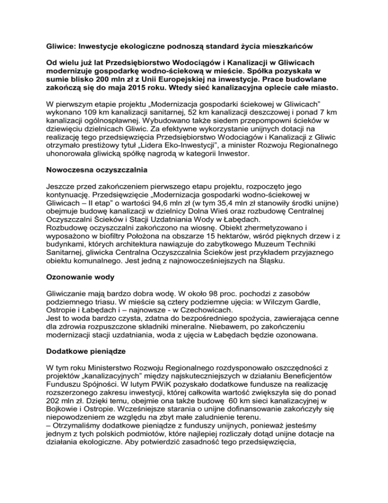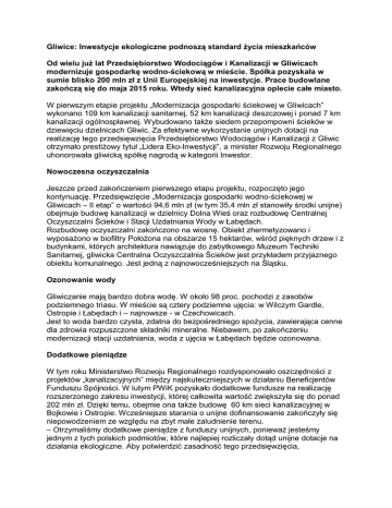 Gliwice: Inwestycje ekologiczne podnoszą standard życia mieszkańców Od wielu już lat Przedsiębiorstwo Wodociągów i Kanalizacji w Gliwicach modernizuje gospodarkę wodno-ściekową w mieście. Spółka pozyskała w sumie blisko 200 mln zł z Unii Europejskiej na inwestycje. Prace budowlane zakończą się do maja 2015 roku. Wtedy sieć kanalizacyjna oplecie całe miasto. W pierwszym etapie projektu „Modernizacja gospodarki ściekowej w Gliwicach” wykonano 109 km kanalizacji sanitarnej, 52 km kanalizacji deszczowej i ponad 7 km kanalizacji ogólnospławnej. Wybudowano także siedem przepompowni ścieków w dziewięciu dzielnicach Gliwic. Za efektywne wykorzystanie unijnych dotacji na realizację tego przedsięwzięcia Przedsiębiorstwo Wodociągów i Kanalizacji z Gliwic otrzymało prestiżowy tytuł „Lidera Eko-Inwestycji”, a minister Rozwoju Regionalnego uhonorowała gliwicką spółkę nagrodą w kategorii Inwestor. Nowoczesna oczyszczalnia Jeszcze przed zakończeniem pierwszego etapu projektu, rozpoczęto jego kontynuację. Przedsięwzięcie „Modernizacja gospodarki wodno-ściekowej w Gliwicach – II etap” o wartości 94,6 mln zł (w tym 35,4 mln zł stanowiły środki unijne) obejmuje budowę kanalizacji w dzielnicy Dolna Wieś oraz rozbudowę Centralnej Oczyszczalni Ścieków i Stacji Uzdatniania Wody w Łabędach. Rozbudowę oczyszczalni zakończono na wiosnę. Obiekt zhermetyzowano i wyposażono w biofiltry Położona na obszarze 15 hektarów, wśród pięknych drzew i z budynkami, których architektura nawiązuje do zabytkowego Muzeum Techniki Sanitarnej, gliwicka Centralna Oczyszczalnia Ścieków jest przykładem przyjaznego obiektu komunalnego. Jest jedną z najnowocześniejszych na Śląsku. Ozonowanie wody Gliwiczanie mają bardzo dobra wodę. W około 98 proc. pochodzi z zasobów podziemnego triasu. W mieście są cztery podziemne ujęcia: w Wilczym Gardle, Ostropie i Łabędach i – najnowsze - w Czechowicach. Jest to woda bardzo czysta, zdatna do bezpośredniego spożycia, zawierająca cenne dla zdrowia rozpuszczone składniki mineralne. Niebawem, po zakończeniu modernizacji stacji uzdatniania, woda z ujęcia w Łabędach będzie ozonowana. Dodatkowe pieniądze W tym roku Ministerstwo Rozwoju Regionalnego rozdysponowało oszczędności z projektów „kanalizacyjnych” między najskuteczniejszych w działaniu Beneficjentów Funduszu Spójności. W lutym PWiK pozyskało dodatkowe fundusze na realizację rozszerzonego zakresu inwestycji, której całkowita wartość zwiększyła się do ponad 202 mln zł. Dzięki temu, obejmie ona także budowę 60 km sieci kanalizacyjnej w Bojkowie i Ostropie. Wcześniejsze starania o unijne dofinansowanie zakończyły się niepowodzeniem ze względu na zbyt małe zaludnienie terenu. – Otrzymaliśmy dodatkowe pieniądze z funduszy unijnych, ponieważ jesteśmy jednym z tych polskich podmiotów, które najlepiej rozliczały dotąd unijne dotacje na działania ekologiczne. Aby potwierdzić zasadność tego przedsięwzięcia, przeprowadziliśmy też konsultacje wśród mieszkańców – podkreśla Henryk Błażusiak, prezes PWiK. Planowo prace budowlane zakończą się do maja 2015. Wówczas to skanalizowane zostanie blisko 100 proc. terenu obsługiwanego przez Przedsiębiorstwo Wodociągów i Kanalizacji z Gliwic. Niezwykle ważną sprawą jest chęć przyłączenia się mieszkańców do sieci. PWiK zrezygnuje z wielu formalności i opłat dotyczących przyłączenia się, a także służy swoją wiedzą i doświadczeniem. Warto podkreślić, że inwestycje w znaczący sposób poprawią komfort życia w Gliwicach. - Liczę na to, że już w 2015 roku, po ocenach formalnych, tysiące Gliwiczan będą cieszyć się z nowych standardów, a ja swój zawodowy projekt zakończę z sukcesem – akcentuje Henryk Błażusiak. Oprócz projektów typowo inwestycyjnych, gliwickie Wodociągi korzystają także z funduszy unijnych w zakresie wprowadzenia elektronicznego Biura Obsługi Klienta. Zadanie będzie kosztowało w sumie 1,6 mln złotych, z czego aż 1,1 zostanie dofinansowane w ramach Regionalnego Programu Operacyjnego Województwa Śląskiego. Spółka angażuje się także w międzynarodowe inicjatywy badawcze. Obecnie w mieście nad Kłodnicą realizowany jest projekt PREPARED, dotyczący dostosowania infrastruktury wodno-kanalizacyjnej do zmian klimatycznych. Jego efektem ma być m.in. stworzenie narzędzia prognostycznego, służącego do kontroli przepływów w sieci rurociągów podczas ponadnormatywnych opadów deszczu.