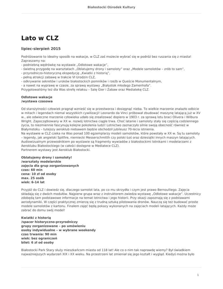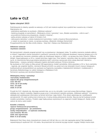 Białostocki Ośrodek Kultury Lato w CLZ lipiec-sierpień 2015 Podróżowanie to idealny sposób na wakacje, w CLZ zaś możecie wybrać się w podróż bez ruszania się z miasta! Zapraszamy na: - podniebną wędrówkę na wystawie „Odlotowe wakacje”, - świetną przygodę na warsztatach „Oblatujemy drony i samoloty” oraz „Modele samolotów – zrób to sam”, - przyrodniczo-historyczną ekspedycję „Kwiatki z historią”, - pełną atrakcji zabawę w trakcie VI Urodzin CLZ, - odkrywanie sekretów i uroków białostockich pomników i rzeźb w Queście Monumentalnym, - a nawet na wyprawę w czasie, za sprawą wystawy „Białystok młodego Zamenhofa”. Przygotowaliśmy też dla Was strefę relaksu – Salę Gier i Zabaw oraz Mediatekę CLZ. Odlotowe wakacje /wystawa czasowa Od starożytności człowiek pragnął wznieść się w przestworza i dosięgnąć nieba. To wielkie marzenie znalazło odbicie w mitach i legendach niemal wszystkich cywilizacji! Leonardo da Vinci próbował zbudować maszynę latającą już w XV w., ale odwieczne marzenie człowieka udało się zrealizować dopiero w 1903 r. za sprawą lotu braci Olivera i Wilbura Wright. Zapoczątkowany w XX w. rozwój lotnictwa ciągle trwa. Choć latanie i samoloty stały się częścią codziennego życia, to niezmiennie fascynują kolejne pokolenia ludzi! Lotnictwo zaznaczyło silnie swoją obecność również w Białymstoku – tutejszy aeroklub niebawem będzie obchodził jubileusz 70-lecia istnienia. Na wystawie w CLZ czeka na Was ponad 100 egzemplarzy modeli samolotów, które powstały w XX w. Są tu samoloty – legendy, jak angielski Spitfire, niemiecki Messerschmitth czy polski Łoś oraz dziesiątki innych maszyn latających. Audiowizualnym przewodnikiem po wystawie są fragmenty wywiadów z białostockimi lotnikami i modelarzami z Aeroklubu Białostockiego (w całości dostępne w Mediatece CLZ). Partnerem wystawy jest Aeroklub Białostocki. Oblatujemy drony i samoloty! /warsztaty modelarskie zajęcia dla grup zorganizowanych czas: 60 min cena: 10 zł od osoby max. 25 osób wiek: 6-14 lat Przyjdź do CLZ i dowiedz się, dlaczego samolot lata, po co mu skrzydła i czym jest prawo Bernoulliego. Zajęcia składają się z dwóch modułów. Najpierw grupa wraz z instruktorem zwiedza wystawę „Odlotowe wakacje”. Uczestnicy zdobędą tam podstawowe informacje na temat lotnictwa i jego historii. Przy okazji zapoznają się z podstawami aerodynamiki. W części praktycznej zmierzą się z trudną sztuką pilotowania dronów. Nauczą się też budować proste modele samolotów z kartonu. Finałem zajęć będą pokazy wykonanych na zajęciach modeli latających. Każdy może zabrać do domu swój model! Kwiatki z historią /spacer historyczno-przyrodniczy grupy zorganizowane – po umówieniu osoby indywidualne – w wybrane weekendy czas trwania: 90 min wiek: bez ograniczeń bilet: 6 zł od osoby Białostocki Park Stary służy mieszkańcom miasta od 118 lat! Ale co o nim tak naprawdę wiemy? Był świadkiem najważniejszych wydarzeń XIX i XX wieku. Na przestrzeni lat zmieniał się jego kształt i wygląd. Kiedyś można było 1 Białostocki Ośrodek Kultury zobaczyć tu egzotyczną agawę lub napić się kawy w kawiarni „Raj”. Teraz w upalne dni możemy schłodzić nogi w fontannie lub odpocząć w cieniu „Kompozycji”. Historyczno-przyrodniczy spacer organizowany przez CLZ to wędrówka w czasie, gra połączona z poznawaniem historii i przyrodniczych atrakcji parku, teatru oraz jego najbliższej okolicy. Czekają na Was fotograficzne puzzle, detektywistyczne zadania, teatralno-przyrodnicze łamigłówki i quiz, czyli – świetna zabawa. Strefa relaksu – Sala Gier i Zabaw czas trwania: 60 min cena: 6 zł od osoby wiek: 3-100 lat Do waszej dyspozycji są gry i zabawy zręcznościowe, np. tablica sprawnościowa, bulik, kulki edukacyjne, plaża, piegus, kulodrom, a także gry edukacyjne, w tym sprawdzające pamięć i spostrzegawczość klocki memory w wersji tradycyjnej i XXL oraz puzzle, które przedstawiają Białystok oraz najważniejsze postacie z nim związane. Ponadto: rysowanie po ścianach, teatrzyk, krzywe lustra i wiele innych. Strefa relaksu – Mediateka CLZ wstęp wolny W Pracowni Multimedialnej Mediateki CLZ czekają na Was setki opowieści o Białymstoku i Podlasiu. Chcecie dowiedzieć się, jak wyglądało nasze miasto przed wojną, albo poznać tradycje ślubne w różnych wyznaniach? A może macie ochotę zajrzeć do starego warsztatu? Lub posłuchać wojennych opowieści białostoczanina biorącego udział w Powstaniu Warszawskim? To wszystko odkryjecie w Mediatece CLZ. Quest Monumentalny – gra terenowa /książeczki z Questem wydawane są w godzinach pracy CLZ wstęp wolny To wyjątkowa gra terenowa, która odkryje przed Wami nieznane historie białostockich pomników, rzeźb, figur i posągów; doskonały sposób na poznawanie miasta, jego sekretów, okazja do świetnej zabawy dla dzieci i dorosłych. Gra może być rozgrywana w dowolnym czasie. Mogą w niej uczestniczyć mieszkańcy Białegostoku, którzy chcą sprawdzić lub pogłębić swoją wiedzę o lokalnej historii i sztuce, a także turyści, którzy dopiero rozpoczną poznawanie miasta. I każdy ma szansę na wygraną, czyli... skarb! VI urodziny CLZ – odlotowy festyn: samoloty, szybowce, drony termin: 19 lipca 2015 w godz. 10.00-16.00 wstęp wolny W tym roku CLZ kończy 6 lat! Z tej okazji zapraszamy wszystkich na wspólne świętowanie. Specjalnie dla Was rozwiniemy skrzydła tak szeroko jak się da, bowiem „gośćmi” specjalnymi tegorocznych Urodzin CLZ będą najróżniejsze maszyny latające. Przyjdź i zobacz, co potrafią drony. Spróbuj sam sztuki latania tym niezwykłym statkiem powietrznym. Dowiedz się, jak wyglądały samoloty w przeszłości. Zasiądź za sterami szybowca! Poznaj podstawy aerodynamiki i naucz się składać prawdziwy spadochron. Zbuduj własny samolot i sprawdź, jak lata. B