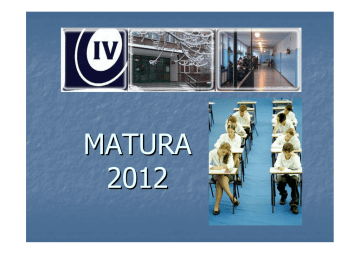 MATURA 2012 MATURA 2011/2012 Podstawa prawna – Rozporządzenie Ministra Edukacji Narodowej z dnia 30 kwietnia 2007 r. w sprawie warunków i sposobu oceniania, klasyfikowania i promowania uczniów i słuchaczy oraz przeprowadzania sprawdzianów i egzaminów w szkołach publicznych (Dz.U. Nr 83 poz.562 z późn. zmianami) DEKLARACJE Osoba, która zamierza przystąpić do egzaminu maturalnego składa przewodniczącemu szkolnego zespołu egzaminacyjnego deklarację przystąpienia do egzaminu: wstępną - w terminie do 30 września 2011 r., ostateczną - w terminie do 7 lutego 2012 r. W razie niezłoŜenia deklaracji ostatecznej, deklaracja wstępna staje się deklaracją ostateczną. Do deklaracji zdający dołącza oświadczenie, o wyraŜeniu zgody lub braku zgody na przetwarzanie danych osobowych dla potrzeb rekrutacji na studia. DOSTOSOWANIE WARUNKÓW I FORMY EGZAMINU MATURALNEGO Zdający, który ubiega się o prawo przystąpienia do egzaminu maturalnego w warunkach i formie dostosowanych do indywidualnych potrzeb psychofizycznych i edukacyjnych, jest obowiązany dołączyć do deklaracji składanej dyrektorowi szkoły wniosek o dostosowanie warunków i formy egzaminu wraz z opinią wydaną przez poradnię psychologiczno-pedagogiczną. Opinia poradni PP powinna być wydana nie wcześniej niŜ 4 lata przed terminem egzaminu i nie później niŜ do 30 września roku szkolnego, w którym odbywa się egzamin maturalny. Termin składania wniosków wraz z opinią do 30 września 2011 r. w sekretariacie szkoły DOSTOSOWANIE WARUNKÓW I FORMY EGZAMINU MATURALNEGO (cd) Zdający, który przedłoŜył opinię poradni psychologicznopedagogicznej, ma prawo do oceny arkuszy egzaminacyjnych według dostosowanych kryteriów oceniania, a w przypadku gdy głębokość zaburzenia grafii uniemoŜliwia odczytanie i ocenienie arkusza egzaminacyjnego, ma prawo do pisania rozwiązań na komputerze lub maszynie do pisania. Nie ma moŜliwości wydłuŜenia czasu egzaminu dla osób z dysleksją na egzaminie maturalnym. Szczegółowa informacja dotycząca sposobu dostosowania warunków i formy egzaminu maturalnego znajduje się na stronie CKE (www.cke.edu.pl) i u szkolnego psychologa. Zdający, który jest chory, moŜe podczas egzaminu korzystać z leków i sprzętu medycznego (na podstawie zaświadczenia lekarskiego). STRUKTURA EGZAMINU MATURALNEGO w 2012 r. PRZEDMIOTY OBOWIĄZKOWE (przystępują wszyscy) Język polski Poziom podstawowy pisemny Język obcy nowoŜytny pisemny ustny (nie określa się poziomu egzaminu) angielski, niemiecki, rosyjski, francuski, hiszpański, włoski Matematyka pisemny STRUKTURA EGZAMINU MATURALNEGO w 2012 r. PRZEDMIOTY DODATKOWE - jeden, dwa lub trzy w danej sesji (przystępują chętni) Język polski Poziom rozszerzony Matematyka (zdawany w części obowiązkowej) pisemny Poziom podstawowy lub rozszerzony Język obcy nowoŜytny pisemny pisemny biologia, chemia, filozofia, fizyka i astronomia, geografia, historia, historia muzyki, historia sztuki, informatyka, język łaciński i kultura antyczna, WOS, wiedza o tańcu język obcy nowoŜytny (inny niŜ zdawany w części obowiązkowej), język mniejszości etnicznej, język mniejszości narodowej, język regionalny – język kaszubski EGZAMIN W TERMINIE DODATKOWYM Czasowo niesprawni i chorzy Przypadki losowe śmierć osoby bliskiej, wypadek w rodzinie, poŜar, powódź, awarie komunikacyjne udokumentowane przez odpowiednie organy Udokumentowany wniosek zdającego lub jego rodziców złoŜony najpóźniej w dniu egzaminu Dyrektor szkoły Dyrektor OKE Przesłanie najpóźniej następnego dnia Decyzja w ciągu 2 dni od otrzymania wniosku Termin dodatkowy egzaminu: 5 – 21 czerwca TERMINARZ EGZAMINÓW EGZAMINY USTNE – od 4 do 25 maja 2012r. (zgodnie z harmonogramem szkoły) EGZAMINY PISEMNE – 4 maja – JĘZYK POLSKI (PP – 9.00) 7 maja – JĘZYK POLSKI (PR – 9.00) 8 maja – MATEMATYKA (PP – 9.00) 9 maja – MATEMATYKA (PR – 9.00) 10 maja – J. ANGIELSKI (PP – 9.00, PR – 14.00) POZOSTAŁE PRZEDMIOTY OD 4-25 maja SZCZEGÓŁOWY HARMONOGRAM NA STRONIE OKE POZNAŃ KAśDY UCZEŃ IV LO OTRZYMUJE SZCZEGÓŁOWY HARMONOGRAM EGZAMINÓW, KTÓRE ZDAJE Przekazanie wyników do szkół – 29 czerwca 2012r. WYNIKI EGZAMINU Wyniki egzaminu ustnego i pisemnego wyraŜone są w skali procentowej. Zdający zda egzamin maturalny, jeŜeli w części ustnej i części pisemnej z kaŜdego przedmiotu obowiązkowego otrzyma co najmniej 30% punktów moŜliwych do uzyskania z egzaminu z danego przedmiotu. Maturzyści, którzy przystąpili do wszystkich przedmiotów obowiązkowych w części ustnej i pisemnej i nie uzyskają 30% punktów tylko z jednego przedmiotu zdawanego jako obowiązkowy, mogą przystąpić do egzaminu „poprawkowego” z tego przedmiotu na tym samym poziomie, w sierpniu tego samego roku. Termin egzaminu ustala Dyrektor CKE. ŚWIADECTWO DOJRZAŁOŚCI Absolwent, który zdał egzamin maturalny otrzymuje świadectwo dojrzałości wydane przez okręgową komisję egzaminacyjną. Zdający, który podwyŜszył wynik egzaminu bądź zdał egzamin z przedmiotów dodatkowych otrzymuje aneks do świadectwa dojrzałości wydany przez okręgową komisję egzaminacyjną. Na świadectwie dojrzałości odnotowane są wyniki uzyskane z egzaminów z kaŜdego przedmiotu zdawanego w części ustnej oraz w części pisemnej. Wyniki egzaminu z przedmiotów dodatkowych nie mają wpływu na zdanie egzaminu maturalnego, ale są odnotowywane na świadectwie dojrzałości. W przypadku uniewaŜnienia egzaminu maturalnego w części ustnej lub części pisemnej egzaminu z danego przedmiotu zdający otrzymuje wynik „0%”. ODBIÓR W SZKOLE 29 CZERWCA OSOBIŚCIE LUB PRZEZ OSOBĘ POSIADAJĄCĄ UPOWAśNIENIE UNIEWAśNIENIE EGZMINU UniewaŜnienie egzaminu moŜe nastąpić w przypadku: stwierdzenia niesamodzielnej pracy zdającego lub zakłócania przez niego przebiegu egzaminu, stwierdzenia naruszenia przepisów dotyczących przebiegu egzaminu, na skutek 