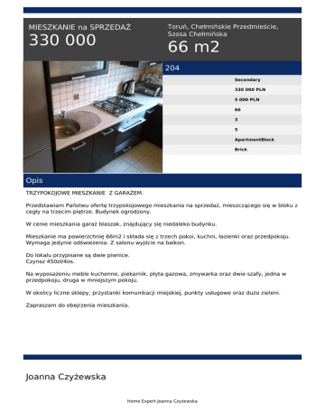 MIESZKANIE na SPRZEDAŻ 330 000 Toruń, Chełmińskie Przedmieście, Szosa Chełmińska 66 m2 204 Secondary 330 000 PLN 5 000 PLN 66 3 5 ApartmentBlock Brick Opis TRZYPOKOJOWE MIESZKANIE Z GARAŻEM. Przedstawiam Państwu ofertę trzypokojowego mieszkania na sprzedaż, mieszczącego się w bloku z cegły na trzecim piętrze. Budynek ogrodzony. W cenie mieszkania garaż blaszak, znajdujący się niedaleko budynku. Mieszkanie ma powierzchnię 66m2 i składa się z trzech pokoi, kuchni, łazienki oraz przedpokoju. Wymaga jedynie odświeżenia. Z salonu wyjście na balkon. Do lokalu przypisane są dwie piwnice. Czynsz 450zł/4os. Na wyposażeniu meble kuchenne, piekarnik, płyta gazowa, zmywarka oraz dwie szafy, jedna w przedpokoju, druga w mniejszym pokoju. W okolicy liczne sklepy, przystanki komunikacji miejskiej, punkty usługowe oraz dużo zieleni. Zapraszam do obejrzenia mieszkania. Joanna Czyżewska Home Expert Joanna Czyżewska tel. 507 175 611 email: [email protected] Home Expert Joanna Czyżewska Powered by TCPDF (www.tcpdf.org)