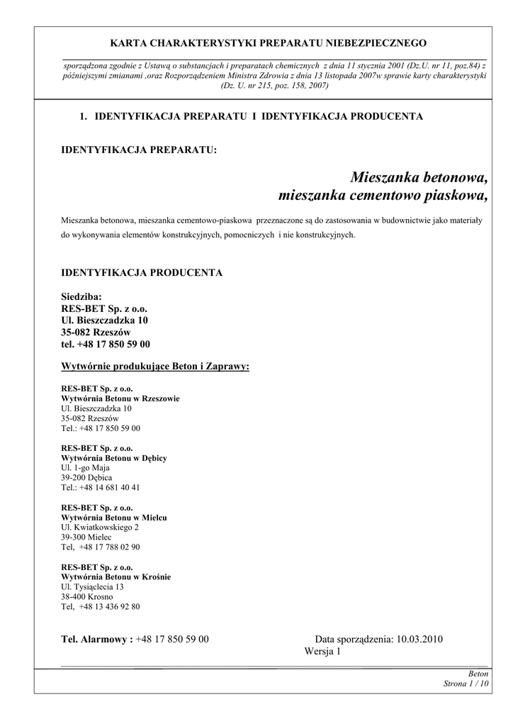 KARTA CHARAKTERYSTYKI PREPARATU NIEBEZPIECZNEGO __________________________________________________________________________________ sporządzona zgodnie z Ustawą o substancjach i preparatach chemicznych z dnia 11 stycznia 2001 (Dz.U. nr 11, poz.84) z późniejszymi zmianami ,oraz Rozporządzeniem Ministra Zdrowia z dnia 13 listopada 2007w sprawie karty charakterystyki (Dz. U. nr 215, poz. 158, 2007) 1. IDENTYFIKACJA PREPARATU I IDENTYFIKACJA PRODUCENTA IDENTYFIKACJA PREPARATU: Mieszanka betonowa, mieszanka cementowo piaskowa, Mieszanka betonowa, mieszanka cementowo-piaskowa przeznaczone są do zastosowania w budownictwie jako materiały do wykonywania elementów konstrukcyjnych, pomocniczych i nie konstrukcyjnych. IDENTYFIKACJA PRODUCENTA Siedziba: RES-BET Sp. z o.o. Ul. Bieszczadzka 10 35-082 Rzeszów tel. +48 17 850 59 00 Wytwórnie produkujące Beton i Zaprawy: RES-BET Sp. z o.o. Wytwórnia Betonu w Rzeszowie Ul. Bieszczadzka 10 35-082 Rzeszów Tel.: +48 17 850 59 00 RES-BET Sp. z o.o. Wytwórnia Betonu w Dębicy Ul. 1-go Maja 39-200 Dębica Tel.: +48 14 681 40 41 RES-BET Sp. z o.o. Wytwórnia Betonu w Mielcu Ul. Kwiatkowskiego 2 39-300 Mielec Tel, +48 17 788 02 90 RES-BET Sp. z o.o. Wytwórnia Betonu w Krośnie Ul. Tysiąclecia 13 38-400 Krosno Tel, +48 13 436 92 80 Tel. Alarmowy : +48 17 850 59 00 Data sporządzenia: 10.03.2010 Wersja 1 ___________________________________________________________________________________________________ Beton Strona 1 / 10 KARTA CHARAKTERYSTYKI PREPARATU NIEBEZPIECZNEGO __________________________________________________________________________________ sporządzona zgodnie z Ustawą o substancjach i preparatach chemicznych z dnia 11 stycznia 2001 (Dz.U. nr 11, poz.84) z późniejszymi zmianami ,oraz Rozporządzeniem Ministra Zdrowia z dnia 13 listopada 2007w sprawie karty charakterystyki (Dz. U. nr 215, poz. 158, 2007) 2. IDENTYFIKACJA ZAGROśEŃ Produkt draŜniący (Xi). MoŜe powodować uczulenie w kontakcie ze skórą (R 43). Ryzyko powaŜnego uszkodzenia oczu (R 41). Działa draŜniąco na skórę (R 38). Działa draŜniąco na oczy (R 36). Objawy i skutki: Oczy: MoŜe powodować pieczenie, zaczerwienienie oczu, zapalenie spojówek. Kontakt z preparatem (ze względu na odczyn zasadowy) moŜe powodować uszkodzenie rogówki. U osób uczulonych moŜe wystąpić silna reakcja alergiczna nawet na bardzo małe ilości produktu. Skóra: Kontakt ze skórą moŜe wywoływać swędzenie, miejscowe zaczerwienie, a w przypadku długotrwałego kontaktu – wysuszanie, łuszczenie się skóry, pękanie, owrzodzenia, pierwotne i ropne zapalenia skóry, wypryski, oparzenia chemiczne. U osób uczulonych moŜe wystąpić silna reakcja alergiczna nawet na bardzo małe ilości produktu. Połknięcie: Po spoŜyciu moŜe dojść do oparzeń, uszkodzenia śluzówki przewodu pokarmowego, wymiotów i biegunki. __________________________________________________________________________________________________ 3. SKŁAD I INFORMACJE O SKŁADNIKACH Substancja Nr CAS Nr WE Cement portlandzki 65997-15-1 266-043-4 Zawartość % masowy 5 – 25 Symbol Zwroty R Xi 37/38-41-43 __________________________________________________________________________________________________ 4. PIERWSZA POMOC Instrukcje postępowania w zaleŜności od drogi naraŜenia: - po styczności z oczami: Natychmiast płukać duŜą ilością roztworu soli fizjologicznej lub bieŜącą wodą z instalacji sanitarnej, co najmniej 15 minut. Usunąć szkła kontaktowe jeśli są. Unikać silnego strumienia wody ze względu na ryzyko mechanicznego uszkodzenia rogówki. Po udzieleniu pierwszej pomocy, naleŜy skonsultować się z lekarzem- okulistą. - po styczności ze skórą: Natychmiast miejsca kontaktu ze skórą spłukać duŜą ilością wody, w przypadku zabrudzenia odzieŜy, obuwia natychmiast zdjąć je a skórę zmyć duŜą ilością wody z mydłem. JeŜeli wystąpią jakiekolwiek podraŜnienia skontaktować się z lekarzem. Beton Strona 2 / 10 KARTA CHARAKTERYSTYKI PREPARATU NIEBEZPIECZNEGO __________________________________________________________________________________ sporządzona zgodnie z Ustawą o substancjach i preparatach chemicznych z dnia 11 stycznia 2001 (Dz.U. nr 11, poz.84) z późniejszymi zmianami ,oraz Rozporządzeniem Ministra Zdrowia z dnia 13 listopada 2007w sprawie karty charakterystyki (Dz. U. nr 215, poz. 158, 2007) - po spoŜyciu: JeŜeli nastąpiło połknięcie, nie powodować wymiotów. Podać do wypicia duŜą ilość wody. Skontaktować się z lekarzem. - po wdychaniu: Preparat jest w postaci płynnej masy nie pylący, brak moŜliwości wdychania Ogólne zalecenia: Powinny być przestrzegane zwykłe środki ostroŜności jak przy pracy z chemikaliami. JeŜeli wystąpią jakiekolwiek niepokojące objawy, wezwać lekarza. __________________________________________________________________________________________________ 5. POSTĘPOWANIE W PRZYPADKU POśARU Produkt niepalny - Zalecane środki gaśnicze: W przypadku poŜaru w sąsiedztwie preparatu moŜna stosować wszystkie środki gaśnicze. - Specjalne wyposaŜenie ochronne Nie jest wymagane - Specyficzne zagroŜenia: Brak ___________________________________________________________________________________________________ 6. POSTĘPOWANIE W PRZYPADKU NIEZAMIERZONEGO UWOLNIENIA DO ŚRODOWISKA - ZagroŜenia dla ludzi i środki ochrony ludzi: Stosować środki ochrony indywidualnej, rękawice ochronne i okulary. Unikać bezpośredniego kontaktu z preparatem. Nie pić, nie jeść i nie palić podczas kontaktu z preparatem - Środki ochrony środowiska; Zabrania się pod kaŜdą postacią wprowadzania preparatu do kanalizacji, wód powierzchniowych i gruntowych oraz gleby bezpośrednio w stanie gęstej masy lub przez rozcieńczanie. - Metoda oczyszczania; Zebrać mechanicznie do pojemnika i pozostawić do stwardnienia. Pozostałość spłukać duŜą ilością wody. Stwardniała masę moŜna traktować jako gruz budowlany, przekaza