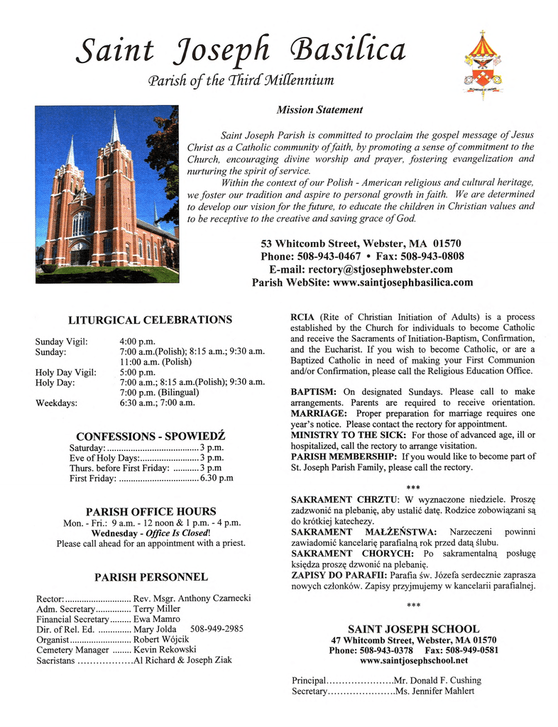 Saint Joseph cBasi(ica Paris/i of tile ¶ThircfMi((ennium Mission Statement Saint Joseph Parish is committed to proclaim the gospel message of Jesus Christ as a Catholic community offaith, by promoting a sense of commitment to the Church, encouraging divine worship and prayer, fostering evangelization and nurturing the spirit of service. Within the context of our Polish - American religious and cultural heritage, we foster our tradition and aspire to personal growth in faith. We are determined to develop our vision for the future, to educate the children in Christian values and to be receptive to the creative and saving grace of God. 53 Whitcomb Street, Webster, MA 01570 Phone: 508-943-0467 • Fax: 508-943-0808 E-mail: [email protected] Parish WebSite: www.saintjosephbasilica.com LITURGICAL CELEBRATIONS Sunday Vigil: Sunday: Holy Day Vigil: Holy Day: Weekdays: 4:00 p.m. 7:00 a.m.(Polish); 8:15 a.m.; 9:30 a.m. 11:00 a.m. (Polish) 5:00 p.m. 7:00 a.m.; 8:15 a.m.(Polish); 9:30 a.m. 7:00 p.m. (Bilingual) 6:30 a.m.; 7:00 a.m. CONFESSIONS SPOWIEDZ - Saturday: ....................................... 3p.m. Eve of Holy Days: ......................... 3 p.m. Thurs. before First Friday: ...........3 p.m First Friday: ..................................6.30 p.m PARISH OFFICE HOURS Mon. - Fri.: 9 a.m. - 12 noon & 1 p.m. - 4 p.m. Wednesday - Office Is Closed! Please call ahead for an appointment with a priest. PARISH PERSONNEL Rector: ............................ Rev. Msgr. Anthony Czarnecki Adm. Secretary............... Terry Miller Financial Secretary......... Ewa Mamro 508-949-2985 Dir. of Rel. Ed . .............. Mary Jolda Organist.......................... Robert Wójcik Cemetery Manager ........ Kevin Rekowski Sacristans .................. Al Richard & Joseph Ziak RCIA (Rite of Christian Initiation of Adults) is a process established by the Church for individuals to become Catholic and receive the Sacraments of Initiation-Baptism, Confirmation, and the Eucharist. If you wish to become Catholic, or are a Baptized Catholic in need of making your First Communion and/or Confirmation, please call the Religious Education Office. BAPTISM: On designated Sundays. Please call to make arrangements. Parents are required to receive orientation. MARRIAGE: Proper preparation for marriage requires one year's notice. Please contact the rectory for appointment. MP1STRY TO THE SICK: For those of advanced age, ill or hospitalized, call the rectory to arrange visitation. PARISH MEMBERSHIP: If you would like to become part of St. Joseph Parish Family, please call the rectory. SAKRAMENT CHRZTU: W wyznaczone niedziele. Proszç zadzwonió na plebaniç, aby ustaliC date. Rodzice zobowizani sa do krótkiej katechezy. SAKRAMENT MALZENSTWA: Narzeczeni powinni zawiadomié kancelarie paraflalna rok przed datq glubu. SAKRAMIENT CHORYCH: Po sakramentaln, poslugç ksiçdza proszç dzwonié na plebaniç. ZAPISY DO PARAF11: Parafia w. Józefa serdecznie zaprasza nowych czlonkow. Zapisy przyjmujemy w kancelarii parafialnej. SAINT JOSEPH SCHOOL 47 Whitcomb Street, Webster, MA 01570 Phone: 508-943-0378 Fax: 508-949-0581 www.saintjosephschool.net Principal......................Mr. Donald F. Cushing Secretary......................Ms. Jennifer Mahlert October 4, 2009 - 4 pazdziemik 2009 r. Page 2 Masses for the week Msze Sw, Podczas Tygodnia Sunday Vigil-October 3 r.s. Raymond S. Noga (lst ann.)-int. wife Eleanor & farn. Sunday-October 4 Za parafian 7:00 For the deceased members of the Holy Rosary Sodality 8:15 r.s. Stanislaw T. Baldyga -mt. family 9:30 s.p. Stanislaw i Anna Lepkowski i. syn Marek 11:00 Monday-October 5 - Solemnity 4:00 12I Anniversary of Consecration of Church and Altar of St. Joseph Church 6:30 7:00 Za wypominki r.s. Katarzyna i JozefPlewa -mt. Teresa Plewa Tuesday-October 6 r.s. Stanley Kaliszewski -mt. Ron & Marcia Zablocki Christopher Heights Wednesday-October 7 6:30 r.s. Joseph and Mary Baczek -mt. daughter Madeline and family r.s. Theresa E. Dembkoski -mt. Josephine Barrington 7:00 6:30 2 pm Thursday-October 8 6:30 r.s.Pauline Wajer -mt. Holy Rosary Sodality Friday-October 9 6:30 7:00 s.p. Stanislawa i JozefWysacki i. corki Marianna r.s. Felix E. Miller -mt. Ed and Barbara Zdrok Saturday-October 10 7:00 r.s. Jay Zmetra -mt. parents Sunday Vigil 4:00 r.s. deceased members of Kujawski and Kozlowski families - mt. family Sunday-October 11 ?Solemnity of Elevation of Church to Status of Basilical? 7:00 8:15 9:30 11:00 Zaparafian r.s. Tessie Lenkiewicz (15th ann.) -mt. son and daughters r.s. Richard D. Zack -mt. wife and family s.p. Kurpiel, Kudron, Plewa rodziny i Agnieszka Brzegowska -mt. Anna i Edward Kudron Baptism of Jordyn Lynne Poplawski and Nina Jean Poplawski 3p.m. Wedding Heather Duclos and Michael Laughlin TWENTY-SEVENTH SUNDAY IN ORDINARY TIME October 4, 2009 Let the children come to me; do not prevent them, for the kingdom of God belongs to such as these. -Mark 10:14 He Embraced Them and Blessed Them. Today Jesus stresses how children embody the reign of God. They are trusting and loving and have hearts that are open to love. They are joyful when they are made aware of God's love for them, and are eager to return that love. This is the model Jesus holds out to us if we want to welcome the reign of God. We need to have open, loving hearts. We must drop our defenses, however we came by them, and welcome Christ's love for us with joy. This is impossible for us on our own. Only the grace of God will enable us to do this, which is freely and generously given. We have only to accept it. The second collection this weekend is for the Diocesan Obligations Next weekend the collection is design ated for Phase III THE MONTH OF OCTOBER - ROSARY MONTH Rosary devotions are deeply routed in the history of the Catholic Church but especially in Polish tradition. The month of October is dedicated to the prayers of the rosary. In the rosary we reflect on the mystery of life, death and resurrection of Jesus / Christ. All the p