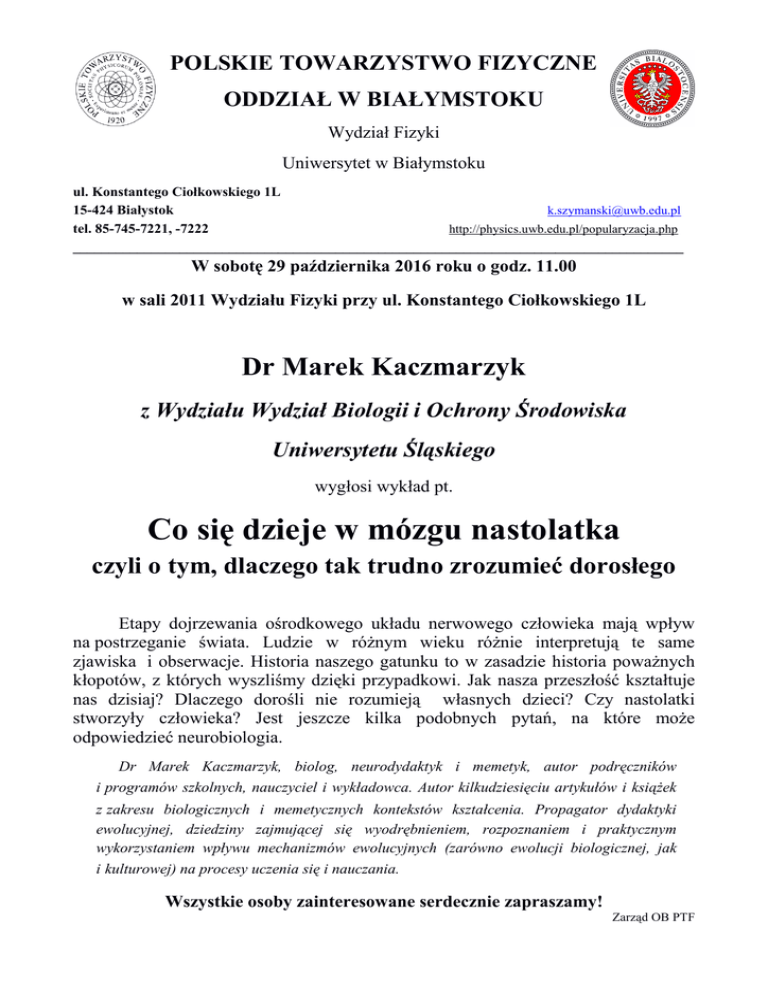 POLSKIE TOWARZYSTWO FIZYCZNE ODDZIAŁ W BIAŁYMSTOKU Wydział Fizyki Uniwersytet w Białymstoku ul. Konstantego Ciołkowskiego 1L 15-424 Białystok [email protected] tel. 85-745-7221, -7222 http://physics.uwb.edu.pl/popularyzacja.php ______________________________________________________________________________________ W sobotę 29 października 2016 roku o godz. 11.00 w sali 2011 Wydziału Fizyki przy ul. Konstantego Ciołkowskiego 1L Drr Marek Kaczmarzyk z Wydziału Wydział Biologii i Ochrony Środowiska rodowiska Uniwersytet Śląskiego Uniwersytetu wygłosi wykład pt. Co sięę dzieje w mózgu nastolatka czyli o tym, dlaczego tak trudno zrozumieć zrozumie dorosłego Etapy dojrzewania ośrodkowego ośrodkowego układu nerwowego człowieka maj mają wpływ na postrzeganie świata. wiata. Ludzie w róŜnym ró wieku róŜnie nie interpretuj interpretują te same zjawiska i obserwacje. Historia naszego gatunku to w zasadzie historia powaŜnych powa kłopotów, z których wyszliśmy wyszliś dzięki ki przypadkowi. Jak nasza przeszłość przeszło kształtuje nas dzisiaj? Dlaczego dorośli doroś nie rozumieją własnych dzieci? Czy nastolatki stworzyły człowieka? Jest jeszcze kilka podobnych pytań, pytań, na które moŜe mo odpowiedzieć neurobiologia. Dr Marek Kaczmarzyk, Kaczmarzyk biolog, iolog, neurodydaktyk i memetyk, autor podręczników podr i programów szkolnych, nauczyciel i wykładowca. Autor kilkudziesięciu kilkudziesi ciu artykułów i ksiąŜek ksi z zakresu biologicznych i memetycznych memety kontekstów kształcenia. Propagator dydaktyki ewolucyjnej, dziedziny ziny zajmującej zajmuj się wyodrębnieniem, bnieniem, rozpoznaniem i praktycznym pra wykorzystaniem wpływu mechanizmów ewolucyjnych (zarówno ewolucji biologicznej, jak i kulturowej) na procesy uczenia się si i nauczania. Wszystkie osoby zainteresowane serdecznie zapraszamy! Zarząd OB PTF