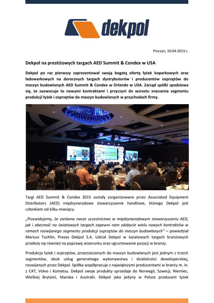 Pinczyn, 10.04.2015 r. Dekpol na prestiżowych targach AED Summit & Condex w USA Dekpol po raz pierwszy zaprezentował swoją bogatą ofertę łyżek koparkowych oraz ładowarkowych na dorocznych targach dystrybutorów i producentów osprzętów do maszyn budowlanych AED Summit & Condex w Orlando w USA. Zarząd spółki spodziewa się, że zaowocuje to nowymi kontraktami i przyczyni do wzrostu znaczenia segmentu produkcji łyżek i osprzętów do maszyn budowlanych w przychodach firmy. Targi AED Summit & Condex 2015 zostały zorganizowane przez Associated Equipment Distributors (AED) międzynarodowe stowarzyszenie handlowe, którego Dekpol jest członkiem od kilku miesięcy. „Przewidujemy, że zarówno nasze uczestnictwo w międzynarodowym stowarzyszeniu AED, jak i obecność na światowych targach zapewni nam zdobycie wielu nowych kontraktów w ramach rozwijanego segmentu produkcji osprzętów do maszyn budowlanych” – powiedział Mariusz Tuchlin, Prezes Dekpol S.A. Udział Dekpol w światowych targach branżowych przełoży się również na poprawę wizerunku oraz ugruntowanie pozycji w branży. Produkcja łyżek i osprzętów, przeznaczonych do maszyn budowlanych jest jednym z trzech segmentów, obok usług generalnego wykonawstwa i działalności deweloperskiej, rozwijanych przez Dekpol. Spółka współpracuje z największymi producentami w branży m. in. z CAT, Volvo i Komatsu. Dekpol swoje produkty sprzedaje do Norwegii, Szwecji, Niemiec, Wielkiej Brytanii, Maroka i Australii. Dekpol jako jedyny w Polsce producent łyżek koparkowych i ładowarkowych może się poszczycić prestiżowym certyfikatem szwedzkiej firmy SSAB „Hardox in my body”. Świadczy to o zastosowaniu w swoich produktach stali o najwyższej wytrzymałości na ścieranie jak również spełnieniu najwyższych wymogów dotyczących procesu spawania i obróbki skrawania. Od lewej: Andrzej Kuchtyk – Członek Zarządu Dekpol S.A., Małgorzata Gołaszewska – Kierownik Działu Sprzedaży i Eksportu, Tomasz Jeschke – Manager Produktu i Sprzedaży *** Więcej informacji na www.dekpol.pl Dekpol jest dynamicznie rozwijającą się firmą w branży budowlanej. Firma powstała w 1993 r. Posiada nowoczesny park maszynowy oraz wysoko wykwalifikowaną kadrę pracowniczą. Od początku swojej działalności zyskała miano rzetelnej, wzorowo zorganizowanej firmy, profesjonalnie realizującej powierzone zadania z zastosowaniem nowoczesnych technologii opartych o normę ISO 9001:2008. Działalność Dekpol opiera się na trzech głównych segmentach. Największy udział w przychodach zapewniają usługi w zakresie Generalnego Wykonawstwa. Oferta obejmuje bardzo szeroki zakres działania. Firma posiada bardzo duże doświadczenie w realizacji obiektów przemysłowych, użyteczności publicznej, sportowych i rekreacyjnych, czy też obiektów ochrony środowiska. Prowadzi też roboty drogowe, sanitarne i hydrotechniczne. Dekpol jest również producentem łyżek i osprzętów przeznaczonych do maszyn budowlanych. Współpracuje m.in. z CAT, Volvo i Komatsu. Produkty sprzedawane są do Norwegii, Szwecji, Niemiec i Wielkiej Brytanii, a nawet do Maroka i Australii. Trzecim dynamicznie rozwijanym segmentem Dekpol S.A. jest działalność deweloperska. Firma posiada ugruntowaną pozycji w Polsce Północnej. Oferuje mieszkania, apartamenty oraz lokale handlowe. Dodatkowych informacji udzielają: Mariusz Skowronek, Tauber Promotion Tel. (22) 833 35 02, 698 612 866 e-mail: [email protected] Andrzej Kazimierczak, Tauber Promotion Tel. (22) 833 23 88, 691 507 173 e-mail: [email protected]