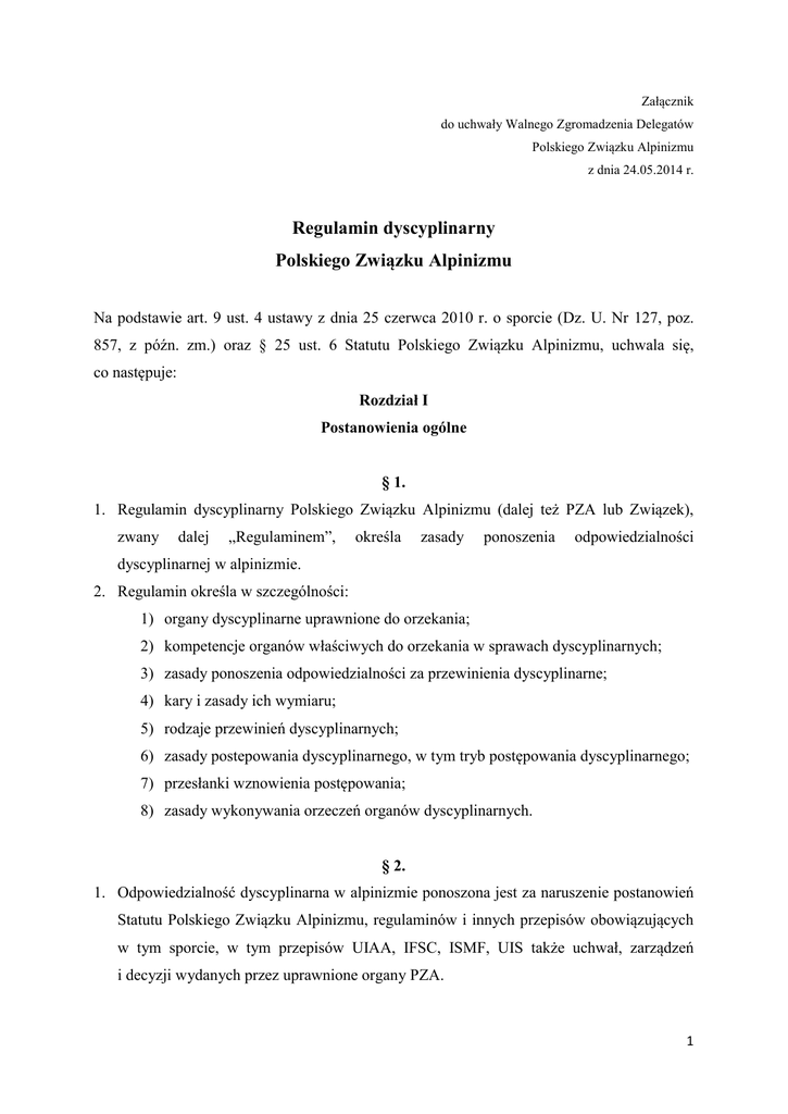 Załącznik do uchwały Walnego Zgromadzenia Delegatów Polskiego Związku Alpinizmu z dnia 24.05.2014 r. Regulamin dyscyplinarny Polskiego Związku Alpinizmu Na podstawie art. 9 ust. 4 ustawy z dnia 25 czerwca 2010 r. o sporcie (Dz. U. Nr 127, poz. 857, z późn. zm.) oraz § 25 ust. 6 Statutu Polskiego Związku Alpinizmu, uchwala się, co następuje: Rozdział I Postanowienia ogólne § 1. 1. Regulamin dyscyplinarny Polskiego Związku Alpinizmu (dalej też PZA lub Związek), zwany dalej „Regulaminem”, określa zasady ponoszenia odpowiedzialności dyscyplinarnej w alpinizmie. 2. Regulamin określa w szczególności: 1) organy dyscyplinarne uprawnione do orzekania; 2) kompetencje organów właściwych do orzekania w sprawach dyscyplinarnych; 3) zasady ponoszenia odpowiedzialności za przewinienia dyscyplinarne; 4) kary i zasady ich wymiaru; 5) rodzaje przewinień dyscyplinarnych; 6) zasady postepowania dyscyplinarnego, w tym tryb postępowania dyscyplinarnego; 7) przesłanki wznowienia postępowania; 8) zasady wykonywania orzeczeń organów dyscyplinarnych. § 2. 1. Odpowiedzialność dyscyplinarna w alpinizmie ponoszona jest za naruszenie postanowień Statutu Polskiego Związku Alpinizmu, regulaminów i innych przepisów obowiązujących w tym sporcie, w tym przepisów UIAA, IFSC, ISMF, UIS także uchwał, zarządzeń i decyzji wydanych przez uprawnione organy PZA. 1 2. Odpowiedzialność dyscyplinarna w alpinizmie ponoszona jest ponadto za naruszenie zasad etyki taternickiej lub zasad dobrej praktyki taternickiej. 3. Odpowiedzialność dyscyplinarna w alpinizmie ponoszona jest również za stosowanie dopingu w sporcie. 4. Naruszenie przepisów, o których mowa w ust. 1 - 3 stanowi przewinienie dyscyplinarne. § 3. 1. Odpowiedzialność dyscyplinarna w alpinizmie za stosowanie dopingu w sporcie ponoszona jest przede wszystkim na zasadach określonych przepisami: 1) rozdziału 9 ustawy z dnia 25 czerwca 2010 r. o sporcie; 2) Modelowych Reguł Antydopingowych opracowanych przez Komisję do Zwalczania Dopingu w Sporcie (KdZDwS). 2. Do postępowań dyscyplinarnych związanych ze stosowaniem dopingu w sporcie przepisy niniejszego Regulaminu stosuje się jedynie odpowiednio. W przypadku sprzeczności postanowień Regulaminu z przepisami, o których mowa w ust. 1, stosuje się postanowienia tych przepisów. § 4. Postanowieniami niniejszego Regulaminu nie są objęte sprawy regulaminowe związane z technicznym przebiegiem współzawodnictwa sportowego, rozstrzygane na podstawie regulaminów sportowych PZA. § 5. Odpowiedzialności dyscyplinarnej w alpinizmie za naruszenie przepisów, o których mowa w § 2 ust. 1 - 3 podlegają: 1) członkowie zwyczajni, w tym kluby sportowe oraz członkowie honorowi PZA; 2) członkowie klubów; 3) zawodnicy, w tym członkowie kadry narodowej; 4) trenerzy, instruktorzy i sędziowie, 5) działacze sportowi, w tym członkowie władz; 6) inne osoby biorące udział we współzawodnictwie sportowym organizowanym lub prowadzonym przez PZA. 2 Rozdział II Organy właściwe do orzekania w sprawach dyscyplinarnych (organy dyscyplinarne) § 6. Organami właściwymi do orzekania w sprawach dyscyplinarnych (organami dyscyplinarnymi PZA) są: 1) organy dyscyplinarne członków zwyczajnych PZA; 2) kierownicy wypraw, zgrupowań i kursów pozatatrzańskich; 3) kierownicy zgrupowań i kursów krajowych i tatrzańskich; 4) Sąd Koleżeński PZA; 5) Zarząd PZA; 6) Walne Zgromadzenie Delegatów. § 7. Organy dyscyplinarne członków zwyczajnych PZA powoływane są i funkcjonują według zasad określonych przepisami wewnętrznymi członków zwyczajnych PZA. § 8. 1. Sąd Koleżeński PZA jest głównym organem dyscyplinarnym PZA. 2. Sąd Koleżeński PZA składa się z 5 osób wybieranych przez Walne Zgromadzenie Delegatów Związku na okres 3-letniej kadencji. 3. Kadencja Sądu Koleżeńskiego PZA jest równa kadencji Zarządu Związku. 4. Sąd Koleżeński PZA konstytuuje się na pierwszym posiedzeniu i wybiera ze swego grona Przewodniczącego i jego dwóch zastępców. § 9. 1. Członkostwo w Sądzie Koleżeńskim PZA wygasa w przypadku: 1) zrzeczenia się funkcji; 2) skazania prawomocnym wyrokiem za ścigane z oskarżenia publicznego umyślne przestępstwo lub umyślne przestępstwo skarbowe; 3) ograniczenia albo utraty zdolności do czynności prawnych; 4) odwołania; 5) śmierci. 3 2. Odwołanie członka Sądu Koleżeńskiego PZA może nastąpić w przypadku: 1) choroby powodującej trwałą niezdolność do wykonywania funkcji; 2) uchybienia godności funkcji członka Sądu Koleżeńskiego PZA, w szczególności z powodu rażącego naruszenia postanowień Statutu PZA. 3. Odwołanie członka Sądu Koleżeńskiego PZA może nastąpić wyłącznie w drodze uchwały Walnego Zgromadzenia Delegatów, podjętej bezwzględną większością głosów. 4. W razie wygaśnięcia członkostwa w Sądzie Koleżeńskim PZA, za wyjątkiem przypadku określonego w ust. 1 pkt 5, Sąd Koleżeński PZA ma prawo dokooptować do swojego składu nowe osoby spośród tych, którzy w wyborach do Sądu Koleżeńskiego PZA uzyskali kolejno najwyższą liczbę głosów, na okres do końca kadencji. 5. Liczba dokooptowanych członków Sądu Koleżeńskiego PZA danej kadencji nie może przekraczać 1/3 ogólnej liczby członków pochodzących z wyboru. 6. W przypadku odwołania członka Sądu Koleżeńskiego PZA Walne Zgromadzenie Delegatów dokonuje powołania uzupełniającego na okres do końca kadencji. § 10. Pracami Sądu Koleżeńskiego PZA kieruje Przewodniczący, podejmując wszelkie działania i czynności konieczne do zapewnienia prawidłowego wykonywania zadań Sądu Koleżeńskiego oraz reprezentuje Sąd Koleżeński na zewnątrz. § 11. 1. Organy dyscyplinarne członków zwyczajnych PZA orzekają, jako organy pierwszej instancji we wszystkich sprawach dyscyplinarnych, z wyjątkiem spraw przekazanych Regulaminem do właściwości innego organu dyscyplinarnego. 2. Organy dyscyplinarne 