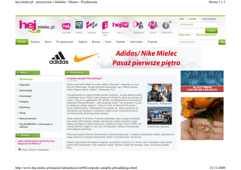 hej.mielec.pl - pozytywnie i lokalnie / Miasto / Wydarzenia Strona 1 z 3 start kontakt mapa serwisu [Użytkownik] hej radio Miasto Kultura Sport Menu Wydarzenia Reportaż Samorządy Inwestycje Polityka Edukacja Drogi Nieruchomości Hej.24 MIASTO - Informacje w skrócie Ankieta Jakie miejscowości powinny być włączone do Mielca? Wola, Złotniki i Chorzelów hejfon Po godzinach Galeria hej bank Katalog firm Biznes Dom hej Tv Deptak Ogłoszenia Informator Forum Dodaj info Pogoda zaloguj! Załóż konto Nie pamiętam hasła Szukana fraza... Prześ Wydarzenia Torpedy zatopiły Piłsudskiego? 17-09-2009 Polscy nurkowie dotarli do wraku statku „Piłsudski”, leżącego na dnie Morza Północnego. Grupą dowodził wywodzący się z Mielca prezes Klubu Płetwonurków „Waleń”, Aleksander Fox. Przygotowania do zejścia trwały siedem miesięcy. Grupie płetwonurków z polskiego klubu "Waleń" jako pierwszym Polakom udało się dotrzeć do wraku. Leży on na głębokości 30 metrów, 50 kilometrów od wschodnich wybrzeży Wielkiej Brytanii. - Jest strasznie wielki. Tak za jednym nurem to ciężko go całego opłynąć - mówi w tvn24.pl Sławomir Kruzolek z Klubu Płetwonurków. Aleksander Fox dodaje, że ślady wskazują, że potwierdza się hipoteza o zatopieniu statku przez wystrzelone przez niemiecką łódź podwodną dwie torpedy. Okręt zatonął 70 lat temu. Podczas ostatniego rejsu na jego pokładzie było około 200 Polaków. Statek miał płynąć wzdłuż wybrzeży Anglii między brzegiem a polem minowym, później do Cape Town w RPA i do Nowej Zelandii. Nagle o 5.36 rano 26 listopada, statkiem wstrząsnęły dwie potężne eksplozje. Mielczanin, Aleksander... Członkowie wyprawy. Wówczas kapitan Mamert Stankiewicz rozkazał ewakuację. Z pokładu zszedł jako ostatni, zabrakło dla niego miejsca w szalupie ratunkowej. Zmarł z wycieńczenia i hipotermii. Statek miał ponad 160 metrów długości, szerokość to ponad 21,5 metra. Na 7 pokładów mógł zabrać prawie 800 pasażerów i 350 członków załogi. Pływał z Gdyni do Nowego Jorku, był dumą polskiej floty. http://www.hej.mielec.pl/miasto2/aktualnosci/art962,torpedy-zatopily-pilsudskiego.html 21/11/2009 hej.mielec.pl - pozytywnie i lokalnie / Miasto / Wydarzenia Strona 2 z 3 Wola i Złotniki Wola i Chorzelów Złotniki i Chorzelów Nurkowie od lipca chcieli zejść do wraku okrętu. Najpierw przeszkodziła im awaria ich łodzi, później akcję blokowała pogoda. Ekspedycja powiodła się 11 września. Tylko Wola Mielecka Tylko Chorzelów Tylko Złotniki Kalendarium Żadne Inne miejscowości głosuj LISTOPAD zobacz wyniki Pn Wt poprzedni | następny Śr Cz Pt So Nd 01 02 03 04 05 06 07 08 09 10 11 12 13 14 15 16 17 18 19 20 21 22 23 24 25 26 27 28 29 30 hej Klang (szanty), Promyczki Dobra (piosenka religijna) - koncert z okazji Dni Hufca ZHP Mielec 22-11-2009 wstecz 27-11-2009 Komentarze dodaj komentarz Hej SIEĆ Koncert FRONTSIDE Dyskusyjny Klub Książki "GOMORRA" Roberta Saviano 27-11-2009 28-11-2009 Go Rock Stalowa Wola - III dzień wyczaj corobie sfora http://www.hej.mielec.pl/miasto2/aktualnosci/art962,torpedy-zatopily-pilsudskiego.html blip wykop elefanta 03-12-2009 RAZ DWA TRZY - koncert 06-12-2009 Paulla - Koncert 10-12-2009 VIII PRZEGLĄD DZIECIĘCYCH I MŁODZIEŻOWYCH ZESPOŁÓW TANECZNYCH PASIKONIK - 2009 21/11/2009 hej.mielec.pl - pozytywnie i lokalnie / Miasto / Wydarzenia Strona 3 z 3 twitter delicious Wiecej... 12-12-2009 Jarmark Świąteczny 13-12-2009 OGÓLNOPOLSKI HALOWY TURNIEJ PIŁKI NOŻNEJ ''ORZECH CUP 2009'' o zobacz wszystkie Newsletter Chcesz byś powiadamiany o nowościach w serwisie? Zapisz się na nasz newsletter. Twój adres e-mail Księgarnia Portal: Informator Kalendarium Galeria Katalog firm Ogłoszenia O nas Współpraca Reklama Kontakt Polityka Prywatności Copyright hej.mielec.pl 2007-2009 Wszystkie prawa zastrzeżone Realizacja: ideo Forum Powered by: Edito CMS http://www.hej.mielec.pl/miasto2/aktualnosci/art962,torpedy-zatopily-pilsudskiego.html hej bank hej radio wyślij Dodaj info hej spot Outsourcing bymediaSens.pl mediaSens.pl Outsourcing by 21/11/2009