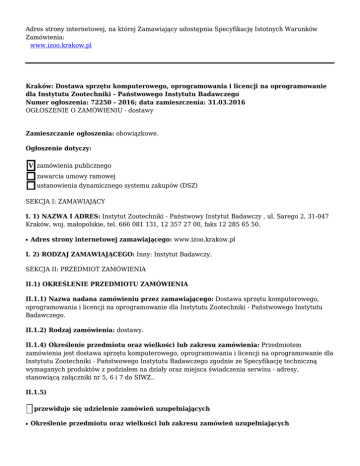 Adres strony internetowej, na której Zamawiający udostępnia Specyfikację Istotnych Warunków Zamówienia: www.izoo.krakow.pl Kraków: Dostawa sprzętu komputerowego, oprogramowania i licencji na oprogramowanie dla Instytutu Zootechniki - Państwowego Instytutu Badawczego Numer ogłoszenia: 72250 - 2016; data zamieszczenia: 31.03.2016 OGŁOSZENIE O ZAMÓWIENIU - dostawy Zamieszczanie ogłoszenia: obowiązkowe. Ogłoszenie dotyczy: V zamówienia publicznego zawarcia umowy ramowej ustanowienia dynamicznego systemu zakupów (DSZ) SEKCJA I: ZAMAWIAJĄCY I. 1) NAZWA I ADRES: Instytut Zootechniki - Państwowy Instytut Badawczy , ul. Sarego 2, 31-047 Kraków, woj. małopolskie, tel. 666 081 131, 12 357 27 00, faks 12 285 65 50. ● Adres strony internetowej zamawiającego: www.izoo.krakow.pl I. 2) RODZAJ ZAMAWIAJĄCEGO: Inny: Instytut Badawczy. SEKCJA II: PRZEDMIOT ZAMÓWIENIA II.1) OKREŚLENIE PRZEDMIOTU ZAMÓWIENIA II.1.1) Nazwa nadana zamówieniu przez zamawiającego: Dostawa sprzętu komputerowego, oprogramowania i licencji na oprogramowanie dla Instytutu Zootechniki - Państwowego Instytutu Badawczego. II.1.2) Rodzaj zamówienia: dostawy. II.1.4) Określenie przedmiotu oraz wielkości lub zakresu zamówienia: Przedmiotem zamówienia jest dostawa sprzętu komputerowego, oprogramowania i licencji na oprogramowanie dla Instytutu Zootechniki - Państwowego Instytutu Badawczego zgodnie ze Specyfikację techniczną wymaganych produktów z podziałem na działy oraz miejsca świadczenia serwisu - adresy, stanowiącą załączniki nr 5, 6 i 7 do SIWZ.. II.1.5) przewiduje się udzielenie zamówień uzupełniających ● Określenie przedmiotu oraz wielkości lub zakresu zamówień uzupełniających II.1.6) Wspólny Słownik Zamówień (CPV): 30.23.10.00-7, 30.23.13.00-0, 48.90.00.00-7. II.1.7) Czy dopuszcza się złożenie oferty częściowej: nie. II.1.8) Czy dopuszcza się złożenie oferty wariantowej: nie. II.2) CZAS TRWANIA ZAMÓWIENIA LUB TERMIN WYKONANIA: Okres w dniach: 21. SEKCJA III: INFORMACJE O CHARAKTERZE PRAWNYM, EKONOMICZNYM, FINANSOWYM I TECHNICZNYM III.1) WADIUM Informacja na temat wadium: Zamawiający nie wymaga wpłacenia wadium. III.2) ZALICZKI III.4) INFORMACJA O OŚWIADCZENIACH LUB DOKUMENTACH, JAKIE MAJĄ DOSTARCZYĆ WYKONAWCY W CELU POTWIERDZENIA SPEŁNIANIA WARUNKÓW UDZIAŁU W POSTĘPOWANIU ORAZ NIEPODLEGANIA WYKLUCZENIU NA PODSTAWIE ART. 24 UST. 1 USTAWY III.4.1) W zakresie wykazania spełniania przez wykonawcę warunków, o których mowa w art. 22 ust. 1 ustawy, oprócz oświadczenia o spełnianiu warunków udziału w postępowaniu należy przedłożyć: III.4.2) W zakresie potwierdzenia niepodlegania wykluczeniu na podstawie art. 24 ust. 1 ustawy, należy przedłożyć: ● ● oświadczenie o braku podstaw do wykluczenia; aktualny odpis z właściwego rejestru lub z centralnej ewidencji i informacji o działalności gospodarczej, jeżeli odrębne przepisy wymagają wpisu do rejestru lub ewidencji, w celu wykazania braku podstaw do wykluczenia w oparciu o art. 24 ust. 1 pkt 2 ustawy, wystawiony nie wcześniej niż 6 miesięcy przed upływem terminu składania wniosków o dopuszczenie do udziału w postępowaniu o udzielenie zamówienia albo składania ofert; III.4.3) Dokumenty podmiotów zagranicznych Jeżeli wykonawca ma siedzibę lub miejsce zamieszkania poza terytorium Rzeczypospolitej Polskiej, przedkłada: III.4.3.1) dokument wystawiony w kraju, w którym ma siedzibę lub miejsce zamieszkania potwierdzający, że: ● nie otwarto jego likwidacji ani nie ogłoszono upadłości - wystawiony nie wcześniej niż 6 miesięcy przed upływem terminu składania wniosków o dopuszczenie do udziału w postępowaniu o udzielenie zamówienia albo składania ofert; III.4.4) Dokumenty dotyczące przynależności do tej samej grupy kapitałowej ● lista podmiotów należących do tej samej grupy kapitałowej w rozumieniu ustawy z dnia 16 lutego 2007 r. o ochronie konkurencji i konsumentów albo informacji o tym, że nie należy do grupy kapitałowej; III.6) INNE DOKUMENTY Inne dokumenty niewymienione w pkt III.4) albo w pkt III.5) a) Wypełniony Formularz oferty zgodnie z załącznikiem nr 1 do SIWZ. b) Wypełniony Formularz szczegółowe wyliczenie ceny, zgodnie załącznikiem nr 8 do SIWZ c) Informacje, o których mowa w pkt. 3.14 SIWZ (oferta równoważna). SEKCJA IV: PROCEDURA IV.1) TRYB UDZIELENIA ZAMÓWIENIA IV.1.1) Tryb udzielenia zamówienia: przetarg nieograniczony. IV.2) KRYTERIA OCENY OFERT IV.2.1) Kryteria oceny ofert: cena oraz inne kryteria związane z przedmiotem zamówienia: ● ● 1 - Cena - 97 2 - Termin dostawy - 3 IV.2.2) przeprowadzona będzie aukcja elektroniczna, adres strony, na której będzie prowadzona: IV.3) ZMIANA UMOWY przewiduje się istotne zmiany postanowień zawartej umowy w stosunku do treści oferty, na podstawie której dokonano wyboru wykonawcy: Dopuszczalne zmiany postanowień umowy oraz określenie warunków zmian 1. Wszelkie zmiany postanowień niniejszej umowy pod rygorem nieważności wymagają zachowania formy pisemnej. 2. Strony dopuszczają możliwość wprowadzenia, za obopólną zgodą, zmian w umowie w przypadku gdy konieczność zmian wynika z obowiązujących przepisów prawa (w szczególności zmianie uległy stawki podatku VAT, co powinno znaleźć odzwierciedlenie w umowie) lub z powodu zaistnienia okoliczności niemożliwych do przewidzenia w chwili zawarcia umowy, w szczególności zmiany danych identyfikacyjnych Wykonawcy lub Zamawiającego (adres siedziby, numerów: REGON, NIP, rachunku bankowego). 3. Strony dopuszczają również możliwość zmiany umowy w przypadku dostarczeniu innego sprzętu komputerowego, niż wskazany w załączniku nr 1, jednak posiadającego funkcjonalność i parametry nie gorsze niż wymagane, wyłącznie w przypadku udokumentowania, iż zaoferowany sprzęt komputerowy został wycofany z rynku. IV.4) INFORMACJE ADMINISTRACYJNE IV.4.1) Adres strony internetowej, na której jest dostępna spe