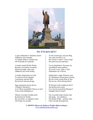 TO TYLKO SEN? A gdy odchodził w chmurny dzień Najlepszy Syn Narodu, To zgasło Słońce! Nastał cień, Od wschodu do zachodu! To On rozstrzyga, niczym Bóg, Ten spór toczony o to, Kto razem z nami? A kto wróg? Kto prawym jest patriotą? A kiedy umarł Wielki Wódz, Kazano wszystkim wioskom, Stawiać posągi, Ŝeby móc Oddawać mu cześć boską. Tu się zbudziłem! Zrywam się I przebłysk mam nadziei, śe to nie u nas, tylko w śnie Znalazłem się w Korei. A kiedy minął pierwszy ból, To stał się równy Bogom I zaczął go otaczać kult, Bo kroczył słuszną drogą. Oddycham z ulgą! Straszny sen! W zdumieniu trwam przez chwilę, Bo nie wiem czemu Kim Ir Sen Śni mi się z Kim Dzong Ilem? Jego imieniem nazwą skwer, I Stadion Narodowy. A ty? Bierz przykład! Chwyć za ster! Ćwicz krok defiladowy! W historii wiele trudnych chwil Zna polityczna scena. Czy zawsze musi Kim Dzong Il Zastąpić Kim Ir Sena? Musisz rozwijać światłą myśl, Kontynuować dzieło, Bo wszystko, co najlepsze dziś, Od Niego się zaczęło. Nie wszystko kupi ciemny lud, Jak grają – nie zatańczy. Nie kaŜdy Polak – próŜny trud – Chce Ŝyć jak Koreańczyk. © MKWD (Muzyczny Kabaret Wojtka Dąbrowskiego) www.spotkaniazpiosenka.org
