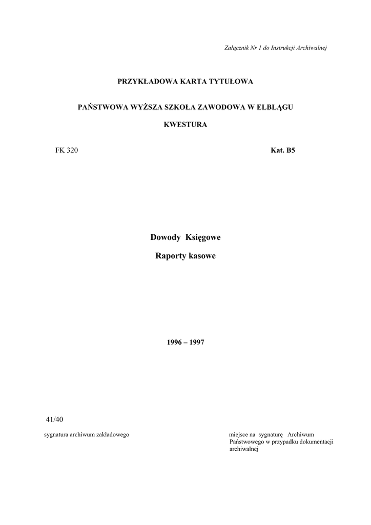 Załącznik Nr 1 do Instrukcji Archiwalnej PRZYKŁADOWA KARTA TYTUŁOWA PAŃSTWOWA WYśSZA SZKOŁA ZAWODOWA W ELBLĄGU KWESTURA FK 320 Kat. B5 Dowody Księgowe Raporty kasowe 1996 – 1997 41/40 sygnatura archiwum zakładowego miejsce na sygnaturę Archiwum Państwowego w przypadku dokumentacji archiwalnej Załącznik Nr 2 do Instrukcji Archiwalnej Nazwa zakładu pracy i symbol jednostki SPIS ZDAWCZO-ODBIORCZY AKT NR.......... Lp. Znak teczki Tytuł teczki (tomu akt) Daty skrajne Kat. akt Liczba teczek Miejsce przechowywania akt w archiwum 1 2 3 4 5 6 7 Data zniszczenia lub przekazania do archiwum 8 Załącznik Nr 3 do Instrukcji Archiwalnej Wykaz spisów zdawczo - odbiorczych Nr spisu Data przyjęcia akt Nazwa komórki przekazującej akta 1 2 3 Liczba poz. spisu 4 Uwagi teczek 5 6 Załącznik Nr 4 do Instrukcji Archiwalnej Nazwa zakładu pracy i symbol jednostki Do Archiwum Państwowego w……………………………………………… …………………………… ( podpis ) Data…………………. Załączników………… ---------------------------------------------------------------------------------------------------------------------Nazwa zakładu pracy i symbol jednostki Protokół Brakowania Akt Komisja w składzie………………………………………………………………………………. …………………………………………………………………………………………………….. …………………………………………………………………………………………………….. ( imiona i nazwiska, stanowiska słuŜbowe członków komisji ) przeprowadziła w dniu ………………………brakowanie akt i zakwalifikowała do zniszczenia akta kategorii B wymienione w spisie podpisanym i załączonym do niniejszego protokołu i zawierającym pozycji ………………….. w tym teczek ( tomów- paczek )……………………….. w ilości około …………….mb. Komisja prosi o przedstawienie niniejszego protokołu właściwej władzy do zatwierdzenia. Zał. kart spisu …………… …………………………………………….. …………………………………………….. …………………………………………….. ( podpisy członków komisji ) Załącznik Nr 5 do Instrukcji Archiwalnej SPIS DOKUMENTACJI NIEARCHIWALNEJ / AKTOWEJ PRZEZNACZONEJ NA MAKULATURĘ / ZNISZCZENIE Lp. Nr i lp. spisu zdawczo odbiorczego 1 2 Symbol z wykazu Tytuł teczki Daty skrajne Symbol kategorii archiwalnej Liczba teczek Uwagi 3 4 5 6 7 8 Załącznik Nr 6 do Instrukcji Archiwalnej Nazwa zakładu pracy i symbol jednostki SPIS MATERIAŁÓW ARCHIWALNYCH PRZEKAZYWANYCH DO ARCHIWUM PAŃSTWOWEGO Lp. 1 Znak teczki 2 Tytuł teczki ( tomu akt ) 3 Daty skrajne 4 Uwagi 5 Załącznik Nr 7 do Instrukcji Archiwalnej KARTA UDOSTĘPNIANIA AKT Nr……………**) nazwa jednostki organizacyjnej (pieczątka) **) **) Data…………………..200…..r. Termin zwrotu akt ----------------------------------------------------------------------------------------------------------------Proszę o udostępnienie*)-wypoŜyczenie*) akt powstałych w jednostce organizacyjnej ………………………………………………………………………………………………… z lat……………………………o znakach………………………………..i upowaŜniam do ich wykorzystania *) Ob……………………………………………………………………… ( imię i nazwisko ) …………………………………….. (podpis kierownika jednostki organizacyjnej) ---------------------------------------------------------------------------------------------------------------------------------------- Zezwalam na udostępnienie wymienionych wyŜej akt ……………………………. ( data i podpis ) *) zbędne skreślić **) wypełnia archiwum zakładowe ( druga strona ) POTWIERDZAM ODBIÓR WYMIENIONYCH NA ODWROCIE Akt-Tomów…………….. Kart……………….. Data…………………20…….r. …………………….. ( podpis ) ----------------------------------------------------------------------------------------------------------------Adnotacje o zwrocie akt: ………………………………………………………………………………………………… ………………………………………………………………………………………………… Akta zwrócono do archiwum zakładowego Dnia ……………………..200…...r. ……………… (podpis oddającego) Załącznik Nr 8 do Instrukcji Archiwalnej PROTOKÓŁ O ZAGINIĘCIU, USZKODZENIU LUB BRAKU DOKUMENTACJI sporządzony dnia ………………………20……. roku w sprawie: zaginięcia, uszkodzenia, braku* udostępnionych akt archiwum zakładowego. Akta nr………………………. tom ( teczka ) …………………….. z roku………………. wypoŜyczona z archiwum dnia ……………………………………..przez: ……………………………………………………………………………………………… 1/ zaginęły 2/ uległy zniszczeniu , a mianowicie ………………………………………………………………………………………………. ………………………………………………………………………………………………. ………………………………………………………………………………………………. 3/ mają niŜej wskazane braki, stwierdzone przy odbiorze akt: ………………………………………………………………………………………………. ……………………………………………………………………………………………… ………………………………………………………………………………………………. ……………………... …….. (podpis osoby wypoŜyczającej akta ) ………