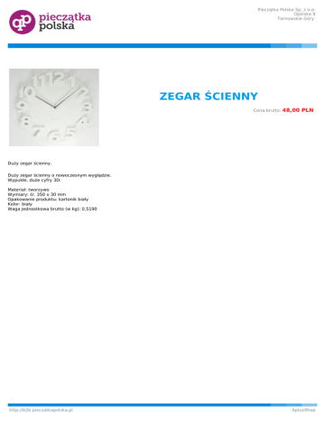 Pieczątka Polska Sp. z o.o. Opolska 8 Tarnowskie Góry ZEGAR ŚCIENNY Cena brutto: 48,00 PLN Duży zegar ścienny. Duży zegar ścienny o nowoczesnym wyglądzie. Wypukłe, duże cyfry 3D. Materiał: tworzywo Wymiary: śr. 350 x 30 mm Opakowanie produktu: kartonik biały Kolor: biały Waga jednostkowa brutto (w kg): 0.5190 http://b2b.pieczatkapolska.pl AptusShop