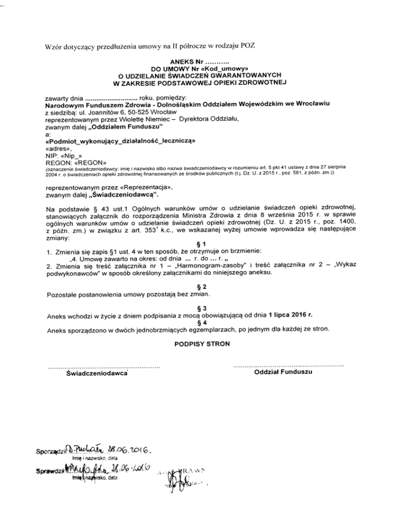 umowy na II półrocze w rodzajuPoZ Wzór dotyczqcy przedłuzenia A N E K SN r . . . . . . . . . . . DO UMOWY Nr <Kod-umowyD o UDZIELAN|EŚW|ADczEŃ GWARANToWANYGH W ZAKRESIE PODSTAWOWEJOPIEKIZOROWOTNEJ roku,pomiędzy: dnia ..........' zawar1y oddziałemWojewódzkimwe Wrocławiu NarodówymFunduszemZdrowia. Dolnoś|ąskim z siedzibą:u|.Joannitów6, 50-525Wrocław oddziału, przezWiolettęNiemiec- Dyrektora reprezentowanym Funduszu'' zwanymdalej,,oddziałem a: iczą> <Podmiot-wykonujący_działalność-|eczn <<adres>, N I P :< N i p _ > REGON:(REGON) 27 sierpnia w rozumieniuart' 5 pkt41 ustawyz dnia imię i nazwiskoa|bonazwa świadczeniodawcy (oznaczenieśWiadczeniodawcy: opiekizdrowotnejfinansowanychze środkówpub|icznych(t.j.Dz' U. z2015 r', poz. 581' zpóŹn. zm.)) zooą,' o świadczeniach D, anymprzez<Reprezentacja reprezentow zwanymdalej,,Swiadczeniodawcą''. Na podstawie$ 43 ust.1 ogó|nych warunkówumów o udzielanieświadczeńopieki zdrowotnej, ziłącznikdo rolpoiządzeniaMinistraZdrowiaz dnia 8 wrzeŚnia 2015 r. w sprawie stanowiących opiekizdrowotnej(Dz' U' z 2015 r', poz' 1400, ogó|nycńWarunkówumóWo udzie|anieświadczeń z-póŹn'zm.) w związkuz ań. 3531k.c'' we wskazanejwyżejumowiewprowadzasię następujące zmiany: s1 on brzmienie: 1. Zmieniasię zapis$1 ust.4 w ten sposob,żeotrzymuje ,,4'Umowęzawartona okres:od dnia ... r' do..'I,,, i treśÓzałącznikanr 2 _ ,,Wykaz 2' Zmienia się treśćzałącznikanr 1 - ,,Harmono9ram.zasoby'. aneksu, do niniejszego podwykonawców'' w sposóbokreŚlonyzałącznikami s2 umowypozostająbez zmian, Pozostałepostanowienia s3 od dnia 1 |ipca 2016r. z mocąobowiązującą Anekswchodziw życiez dniempodpisania s4 po jednymd|akażdejzestron. egzemp|arzach, w dwochjednobrzmiących Aneks sporządzono PODPISYSTRON Świadczeniodawca 28D6.Lot6. lmięinazwisko' tuta $prardził K ob,/dtb oddziałFunduszu