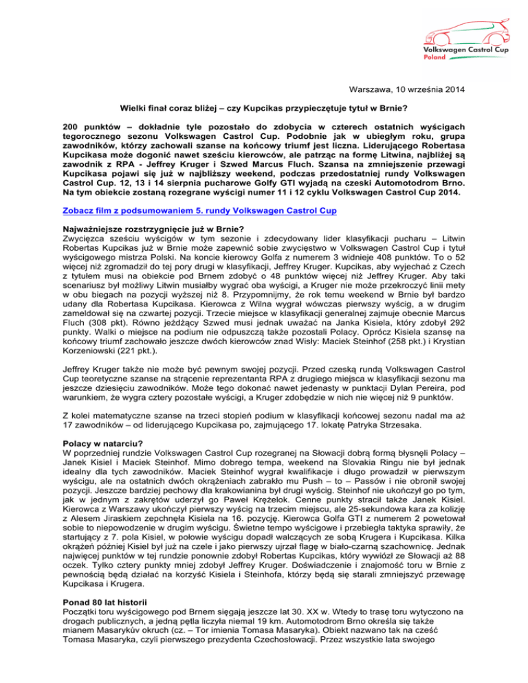 Warszawa, 10 września 2014 Wielki finał coraz bliżej – czy Kupcikas przypieczętuje tytuł w Brnie? 200 punktów – dokładnie tyle pozostało do zdobycia w czterech ostatnich wyścigach tegorocznego sezonu Volkswagen Castrol Cup. Podobnie jak w ubiegłym roku, grupa zawodników, którzy zachowali szanse na końcowy triumf jest liczna. Liderującego Robertasa Kupcikasa może dogonić nawet sześciu kierowców, ale patrząc na formę Litwina, najbliżej są zawodnik z RPA - Jeffrey Kruger i Szwed Marcus Fluch. Szansa na zmniejszenie przewagi Kupcikasa pojawi się już w najbliższy weekend, podczas przedostatniej rundy Volkswagen Castrol Cup. 12, 13 i 14 sierpnia pucharowe Golfy GTI wyjadą na czeski Automotodrom Brno. Na tym obiekcie zostaną rozegrane wyścigi numer 11 i 12 cyklu Volkswagen Castrol Cup 2014. Zobacz film z podsumowaniem 5. rundy Volkswagen Castrol Cup Najważniejsze rozstrzygnięcie już w Brnie? Zwycięzca sześciu wyścigów w tym sezonie i zdecydowany lider klasyfikacji pucharu – Litwin Robertas Kupcikas już w Brnie może zapewnić sobie zwycięstwo w Volkswagen Castrol Cup i tytuł wyścigowego mistrza Polski. Na koncie kierowcy Golfa z numerem 3 widnieje 408 punktów. To o 52 więcej niż zgromadził do tej pory drugi w klasyfikacji, Jeffrey Kruger. Kupcikas, aby wyjechać z Czech z tytułem musi na obiekcie pod Brnem zdobyć o 48 punktów więcej niż Jeffrey Kruger. Aby taki scenariusz był możliwy Litwin musiałby wygrać oba wyścigi, a Kruger nie może przekroczyć linii mety w obu biegach na pozycji wyższej niż 8. Przypomnijmy, że rok temu weekend w Brnie był bardzo udany dla Robertasa Kupcikasa. Kierowca z Wilna wygrał wówczas pierwszy wyścig, a w drugim zameldował się na czwartej pozycji. Trzecie miejsce w klasyfikacji generalnej zajmuje obecnie Marcus Fluch (308 pkt). Równo jeżdżący Szwed musi jednak uważać na Janka Kisiela, który zdobył 292 punkty. Walki o miejsce na podium nie odpuszczą także pozostali Polacy. Oprócz Kisiela szansę na końcowy triumf zachowało jeszcze dwóch kierowców znad Wisły: Maciek Steinhof (258 pkt.) i Krystian Korzeniowski (221 pkt.). Jeffrey Kruger także nie może być pewnym swojej pozycji. Przed czeską rundą Volkswagen Castrol Cup teoretyczne szanse na strącenie reprezentanta RPA z drugiego miejsca w klasyfikacji sezonu ma jeszcze dziesięciu zawodników. Może tego dokonać nawet jedenasty w punktacji Dylan Pereira, pod warunkiem, że wygra cztery pozostałe wyścigi, a Kruger zdobędzie w nich nie więcej niż 9 punktów. Z kolei matematyczne szanse na trzeci stopień podium w klasyfikacji końcowej sezonu nadal ma aż 17 zawodników – od liderującego Kupcikasa po, zajmującego 17. lokatę Patryka Strzesaka. Polacy w natarciu? W poprzedniej rundzie Volkswagen Castrol Cup rozegranej na Słowacji dobrą formą błysnęli Polacy – Janek Kisiel i Maciek Steinhof. Mimo dobrego tempa, weekend na Slovakia Ringu nie był jednak idealny dla tych zawodników. Maciek Steinhof wygrał kwalifikacje i długo prowadził w pierwszym wyścigu, ale na ostatnich dwóch okrążeniach zabrakło mu Push – to – Passów i nie obronił swojej pozycji. Jeszcze bardziej pechowy dla krakowianina był drugi wyścig. Steinhof nie ukończył go po tym, jak w jednym z zakrętów uderzył go Paweł Krężelok. Cenne punkty stracił także Janek Kisiel. Kierowca z Warszawy ukończył pierwszy wyścig na trzecim miejscu, ale 25-sekundowa kara za kolizję z Alesem Jiraskiem zepchnęła Kisiela na 16. pozycję. Kierowca Golfa GTI z numerem 2 powetował sobie to niepowodzenie w drugim wyścigu. Świetne tempo wyścigowe i przebiegła taktyka sprawiły, że startujący z 7. pola Kisiel, w połowie wyścigu dopadł walczących ze sobą Krugera i Kupcikasa. Kilka okrążeń później Kisiel był już na czele i jako pierwszy ujrzał flagę w biało-czarną szachownicę. Jednak najwięcej punktów w tej rundzie ponownie zdobył Robertas Kupcikas, który wywiózł ze Słowacji aż 88 oczek. Tylko cztery punkty mniej zdobył Jeffrey Kruger. Doświadczenie i znajomość toru w Brnie z pewnością będą działać na korzyść Kisiela i Steinhofa, którzy będą się starali zmniejszyć przewagę Kupcikasa i Krugera. Ponad 80 lat historii Początki toru wyścigowego pod Brnem sięgają jeszcze lat 30. XX w. Wtedy to trasę toru wytyczono na drogach publicznych, a jedną pętla liczyła niemal 19 km. Automotodrom Brno określa się także mianem Masarykův okruch (cz. – Tor imienia Tomasa Masaryka). Obiekt nazwano tak na cześć Tomasa Masaryka, czyli pierwszego prezydenta Czechosłowacji. Przez wszystkie lata swojego istnienia Automotodrom Brno przechodził liczne modyfikacje, aż w końcu podjęto decyzję o budowie zamkniętego obiektu dedykowanego sportom motorowym. 5,4-kilometrową pętlę otwarto w 1987 r. Od tego czasu tor gościł tak znane serie wyścigowe jak WTCC, Formuła 2, GT1, a także motocyklowe Moto GP i Superbike World Championship. Najdłuższa prosta liczy 637 m, a do przejechania jest łącznie 14 zakrętów (6 lewych i 8 prawych). Rekordzistą jest Luca Filippi, który w 2010 roku, podczas wyścigów Auto GP, samochodem Lola B05/52 osiągnął czas 1:43:260 min. W ubiegłym sezonie, w kwalifikacjach najlepszy czas uzyskał startujący wówczas gościnnie Jonas Gelzinis. Litwin pokonał jedno okrążenie Automotodromu Brno w czasie 2:20.196 s. ze średnią prędkością 138,8 km/h Początek w piątek Pierwszy z dwóch 30-minutowych treningów, zaplanowano na piątek, 12 września, na godzinę 13:00. Zgodnie z regulaminem pucharu, podczas pierwszej sesji treningowej zawodnicy będą mogli korzystać z systemu Push – to – Pass. W drugim treningu, zaplanowanym także na piątek, na godzinę 17:10, ten układ będzie wyłączony. W sobotę, 13 września, wyścigowe Golfy GTI pojawią się na torze dwukrotnie. Po raz pierwszy – o godzinie 10:00 – zawodnicy wyjadą na kwalifikacje by walczyć o jak na