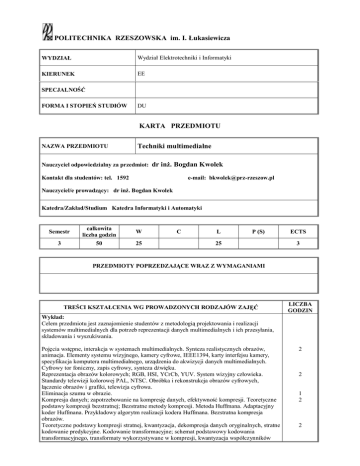 POLITECHNIKA RZESZOWSKA im. I. Łukasiewicza WYDZIAŁ Wydział Elektrotechniki i Informatyki KIERUNEK EE SPECJALNOŚĆ FORMA I STOPIEŃ STUDIÓW DU KARTA PRZEDMIOTU NAZWA PRZEDMIOTU Techniki multimedialne Nauczyciel odpowiedzialny za przedmiot: dr inż. Bogdan Kwolek Kontakt dla studentów: tel. 1592 e-mail: [email protected] Nauczyciel/e prowadzący: dr inż. Bogdan Kwolek Katedra/Zakład/Studium Katedra Informatyki i Automatyki Semestr całkowita liczba godzin W 3 50 25 C L P (S) 25 ECTS 3 PRZEDMIOTY POPRZEDZAJĄCE WRAZ Z WYMAGANIAMI TREŚCI KSZTAŁCENIA WG PROWADZONYCH RODZAJÓW ZAJĘĆ LICZBA GODZIN Wykład: Celem przedmiotu jest zaznajomienie studentów z metodologią projektowania i realizacji systemów multimedialnych dla potrzeb reprezentacji danych multimedialnych i ich przesyłania, składowania i wyszukiwania. Pojęcia wstępne, interakcja w systemach multimedialnych. Synteza realistycznych obrazów, animacja. Elementy systemu wizyjnego, kamery cyfrowe, IEEE1394, karty interfejsu kamery, specyfikacja komputera multimedialnego, urządzenia do akwizycji danych multimedialnych. Cyfrowy tor foniczny, zapis cyfrowy, synteza dźwięku. Reprezentacja obrazów kolorowych; RGB, HSI, YCrCb, YUV. System wizyjny człowieka. Standardy telewizji kolorowej PAL, NTSC. Obróbka i rekonstrukcja obrazów cyfrowych, łączenie obrazów i grafiki, telewizja cyfrowa. Eliminacja szumu w obrazie. Kompresja danych; zapotrzebowanie na kompresję danych, efektywność kompresji. Teoretyczne podstawy kompresji bezstratnej; Bezstratne metody kompresji. Metoda Huffmana. Adaptacyjny koder Huffmana. Przykładowy algorytm realizacji kodera Huffmana. Bezstratna kompresja obrazów. Teoretyczne podstawy kompresji stratnej, kwantyzacja, dekompresja danych oryginalnych, stratne kodowanie predykcyjne. Kodowanie transformacyjne; schemat podstawowy kodowania transformacyjnego, transformaty wykorzystywane w kompresji, kwantyzacja współczynników 2 2 1 2 2 transformat, redukcja efektów blokowych. Standardy kompresji obiektów multimedialnych. Standard JPEG. Standard MPEG-2; redukcja nadmiarowości międzyobrazowych, estymacja ruchu, kompensacja ruchu. Format plików AVI. Montaż nieliniowy filmów. Przegląd nowych standardów i algorytmów. Interakcja człowiek-komputer; systemy wielomodalne, techniki rozpoznawania mowy. Segmentacja obrazów kolorowych; identyfikacja skóry, metody detekcji i rozpoznawania twarzy, sylwetki człowieka, śledzenia twarzy i głowy, zastosowania technik analizy i rozpoznawania obrazów kolorowych w algorytmach MPEG, multimedialnych bazach danych. Standardy indeksowania obiektów multimedialnych. Systemy wyszukiwania obiektów multimedialnych. Standardy MPEG-4, MPEG-7, MPEG21 Systemy transmisji obiektów multimedialnych. Systemy wideokonferencyjne w komputerowych sieciach korporacyjnych. Problem śledzenia twarzy w systemie telekonferencyjnym. Transmisja dźwięku i obrazu w sieci Internet, multimedia w sieci LAN i WAN. Synchronizacja obrazu i dźwięku; język SMIL, Protokoły RTP, multicast. Transmisja multimedialna, standardy H-xxx (standardy H-263, H-264). Technologie tele... (telelerning, telekonferencje, telemedycyna, telezakupy). Serwery wideo- , rozwiązania programowe i sprzętowe. Technologie on-demand (video on-demand, wiadomości on-demand itp.) Sztuczna rzeczywistość, VRML. Platformy satelitarne DB. Transmisja strumieni medialnych dla urządzeń mobilnych. Zastosowanie systemu Windows w aplikacjach multimedialnych; VfW, MCI. Przetwarzanie strumieni multimedialnych za pomocą DirectX. Technologie i narzędzia realizacji systemów multimedialnych. Pakiet Java Media Framework. Pakiety Java2D, Java3D, JavaSound. 4 4 4 2 2 Ćwiczenia: Laboratorium: 25 Pakiety Java Media Framework, Java 2D, Java3D, JavaSound, JavaTelephony. Dyżury dydaktyczne (konsultacje): w terminach podanych w harmonogramie pracy jednostki EFEKTY KSZTAŁCENIA - UMIEJĘTNOŚCI KSZTAŁCENIA FORMA I WARUNKI ZALICZENIA PRZEDMIOTU (RODZAJU ZAJĘĆ) Laboratorium: przygotowanie programu WYKAZ LITERATURY PODSTAWOWEJ 1. B. Kwolek; Adaptive real-time image processing in human-computer-interaction. In: Human-Computer Interaction, I-Tech Vienna, Austria 2008, pg. 150-175. 2. B. Kwolek. Tracking of facial regions using active shape models and adaptive skin color modeling. Vision Systems. Scene Reconstruction, Pose Estimation and Tracking, R. Stolkin [ed.], ARS Publication, Vienna, Austria 2007, 331–350. 3. B. Kwolek. A real-time head tracker supporting human computer interaction. In Int. Conf. on Computer Recognition Systems, Advances in Soft Computing, Springer, 2005, pg. 693–700. 4. B. Kwolek. Detail-preserving regularization based removal of impulse noise from highly corrupted images. Lecture Notes in Computer Science, vol. 4431, Springer, 2007, pg. II:599–605. 5. B. Kwolek. Face tracking for H.264 encoded video sequences. In IEEE Int. Conf. on Image Processing, IEEE Press, Piscataway, NJ 2005, pg. III:449–452. 6. J. Schmidt, J. Fritsch, and B. Kwolek. Kernel particle filter for real-time 3D body tracking in monocular color images. In IEEE Int. Conf. on Face and Gesture Rec., Southampton, UK, IEEE Computer Society Press, 2006, 567–572. 7. Skarbek W.; Multimedia; Wyd. PWNTZ, 1999. WYKAZ LITERATURY UZUPEŁNIAJĄCEJ 1. B. Kwolek; Adaptive Real-Time Image Processing for Cognitive Vision Systems. Oficyna Wyd. Politechniki Rzeszowskiej, 2007. Podpis nauczyciela odpowiedzialnego za przedmiot Podpis kierownika (zakładu/studium) katedry Data i podpis dziekana właściwego wydziału