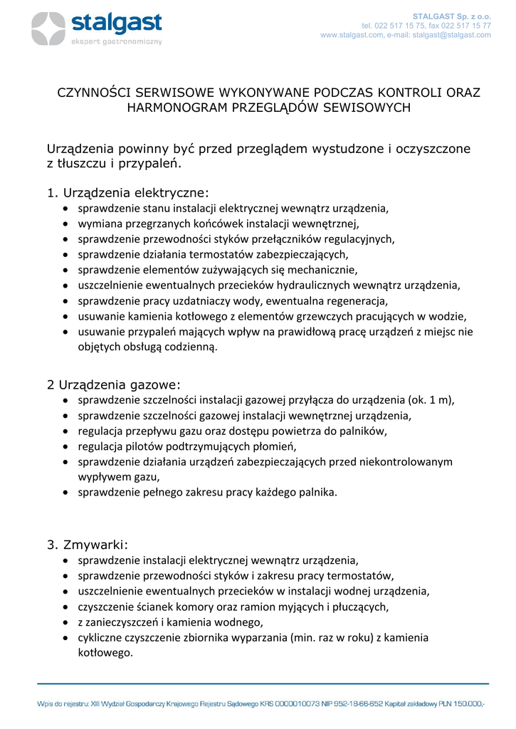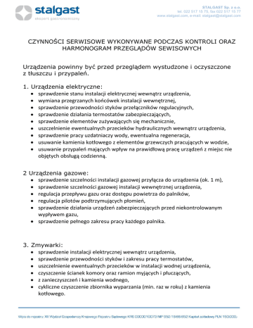 STALGAST Sp. z o.o. tel. 022 517 15 75, fax 022 517 15 77 www.stalgast.com, e-mail: [email protected] CZYNNOŚCI SERWISOWE WYKONYWANE PODCZAS KONTROLI ORAZ HARMONOGRAM PRZEGLĄDÓW SEWISOWYCH Urządzenia powinny być przed przeglądem wystudzone i oczyszczone z tłuszczu i przypaleń. 1. Urządzenia elektryczne: sprawdzenie stanu instalacji elektrycznej wewnątrz urządzenia, wymiana przegrzanych końcówek instalacji wewnętrznej, sprawdzenie przewodności styków przełączników regulacyjnych, sprawdzenie działania termostatów zabezpieczających, sprawdzenie elementów zużywających się mechanicznie, uszczelnienie ewentualnych przecieków hydraulicznych wewnątrz urządzenia, sprawdzenie pracy uzdatniaczy wody, ewentualna regeneracja, usuwanie kamienia kotłowego z elementów grzewczych pracujących w wodzie, usuwanie przypaleń mających wpływ na prawidłową pracę urządzeń z miejsc nie objętych obsługą codzienną. 2 Urządzenia gazowe: sprawdzenie szczelności instalacji gazowej przyłącza do urządzenia (ok. 1 m), sprawdzenie szczelności gazowej instalacji wewnętrznej urządzenia, regulacja przepływu gazu oraz dostępu powietrza do palników, regulacja pilotów podtrzymujących płomień, sprawdzenie działania urządzeń zabezpieczających przed niekontrolowanym wypływem gazu, sprawdzenie pełnego zakresu pracy każdego palnika. 3. Zmywarki: sprawdzenie instalacji elektrycznej wewnątrz urządzenia, sprawdzenie przewodności styków i zakresu pracy termostatów, uszczelnienie ewentualnych przecieków w instalacji wodnej urządzenia, czyszczenie ścianek komory oraz ramion myjących i płuczących, z zanieczyszczeń i kamienia wodnego, cykliczne czyszczenie zbiornika wyparzania (min. raz w roku) z kamienia kotłowego. STALGAST Sp. z o.o. tel. 022 517 15 75, fax 022 517 15 77 www.stalgast.com, e-mail: [email protected] 4. Chłodnie: sprawdzenie stanu instalacji elektrycznej wewnątrz urządzenia i ewentualne usunięcie przegrzanych końcówek instalacji wewnętrznej, sprawdzenie szczelności uszczelek, regulacja zawiasów w drzwiach, sprawdzenie elementów zużywających się mechanicznie, sprawdzenie i oczyszczenie skraplaczy, kontrola prawidłowości działania grzałek i drożności odpływu skroplin, kontrola temperatury nastawionej i faktycznej, sprawdzenie pracy wentylatora, sprawdzenie szczelności układu chłodniczego. 5. Kostkarki: sprawdzenie stanu instalacji elektrycznej wewnątrz urządzenia i ewentualne usunięcie przegrzanych końcówek instalacji wewnętrznej, sprawdzenie elementów zużywających się mechanicznie, sprawdzenie i oczyszczenie skraplaczy, kontrola temperatury, sprawdzenie pracy wentylatora, 6. System indywidualnego uzdatniania wody: wymiana wkładów dla urządzeń tego wymagających w danym kwartale, urządzenia objęte tym zakresem: piece konwekcyjno-parowe, zmywarki do szkła. STALGAST Sp. z o.o. tel. 022 517 15 75, fax 022 517 15 77 www.stalgast.com, e-mail: [email protected] Protokół konserwacji Firma................ stwierdza niniejszym dokonanie, zgodnie z umową Nr ............, przeglądu technicznego Nr ........... niżej wymienionych urządzeń zainstalowanych w dniu: …………. w budynku: ………………………………………………………………………..................... 1. A/ Ocena urządzeń, uwagi, zalecenia: ............................................................................................... ............................................................ ....................................................................................................................................................................... ....................................................................................................................................................................... ....................................................................................................................................................................... ....................................................................................................................................................................... ....................................................................................................................................................................... ....................................................................................................................................................................... ....................................................................................................................................................................... ....................................................................................................................................................................... ....................................................................................................................................................................... ....................................................................................................................................................................... B/ Wykaz użytych części i materiałów: ............................................................................................... ............................................................ ....................................................................................................................................................................... ....................................................................................................................................................................... ....................................................................................................................................................................... ..................................................................................................