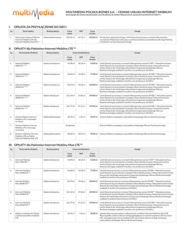 MULTIMEDIA POLSKA BIZNES S.A. – CENNIK USŁUGI INTERNET MOBILNY obowiązuje dla Umów Abonenckich oraz Aneksów do Umów Abonenckich zawartych od dnia 01.01.2017 r. I. Lp. 1. OPŁATA ZAPRZYŁĄCZENIE DOSIECI Tytuł opłaty Rodzaj opłaty Aktywacja Usługi wPakiecie Internet Mobilny LTE lub Internet Mobilny Max LTE 1), 2) Opłata jednorazowa Cena netto VAT 203,25 zł 46,75 zł Cena brutto 250,00 zł Uwagi Wmiesiącu aktywacji Usługi, Limit Danych przyznany wramach Abonamentu zawybrany Pakiet jest naliczany wpełnej wysokości przewidzianej dla tego Pakietu, niezależnie oddnia aktywacji Usługi. II. OPŁATY dla Pakietów Internet Mobilny LTE 15) Lp. Tytuł opłaty (Pakiet) Rodzaj opłaty Cena standardowa Cena netto VAT Uwagi Cena brutto 1. Internet Mobilny 5GB LTE 17), 18) Opłata miesięczna 43,90 zł 10,10 zł 54,00 zł Limit Danych przyznany wramach Abonamentu wynosi 5GB 16). Niewykorzystany Limit Danych nie przechodzi nakolejny Okres Rozliczeniowy. Odprzekroczenia Limitu Danych dochwili jego odnowienia (rozpoczęcia kolejnego Okresu Rozliczeniowego) szybkość transferu nie przekracza 32 kbit/s. 2. Internet Mobilny 10GB LTE 17), 18) Opłata miesięczna 62,60 zł 14,40 zł 77,00 zł Limit Danych przyznany wramach Abonamentu wynosi 10 GB 16). Niewykorzystany Limit Danych nie przechodzi nakolejny Okres Rozliczeniowy. Odprzekroczenia Limitu Danych dochwili jego odnowienia (rozpoczęcia kolejnego Okresu Rozliczeniowego) szybkość transferu nie przekracza 32 kbit/s. 3. Internet Mobilny 20GB LTE 17), 18) Opłata miesięczna 83,74 zł 19,26 zł 103,00 zł Limit Danych przyznany wramach Abonamentu wynosi 20 GB 16). Niewykorzystany Limit Danych nie przechodzi nakolejny Okres Rozliczeniowy. Odprzekroczenia Limitu Danych dochwili jego odnowienia (rozpoczęcia kolejnego Okresu Rozliczeniowego) szybkość transferu nie przekracza 32 kbit/s. 4. Internet Mobilny 30GB LTE 17), 18) Opłata miesięczna 121,14 zł 27,86 zł 149,00 zł Limit Danych przyznany wramach Abonamentu wynosi 30 GB 16). Niewykorzystany Limit Danych nie przechodzi nakolejny Okres Rozliczeniowy. Odprzekroczenia Limitu Danych dochwili jego odnowienia (rozpoczęcia kolejnego Okresu Rozliczeniowego) szybkość transferu nie przekracza 32 kbit/s. 5. Internet Mobilny 60GB LTE 17), 18) Opłata miesięczna 161,79 zł 37,21 zł 199,00 zł Limit Danych przyznany wramach Abonamentu wynosi 60 GB 16). Niewykorzystany Limit Danych nie przechodzi nakolejny Okres Rozliczeniowy. Odprzekroczenia Limitu Danych dochwili jego odnowienia (rozpoczęcia kolejnego Okresu Rozliczeniowego) szybkość transferu nie przekracza 32 kbit/s. 6. Zmiana Pakietu Internet Mobilny LTE zwyższego naniższy Opłata jednorazowa 20,32 zł 4,67 zł 24,99 zł 7. Zmiana Pakietu Internet Mobilny LTE zniższego nawyższy 8. Zmiana zPakietu Internet Mobilny LTE naPakiet InternetMobilny Max LTE bezpłatnie Opłata jednorazowa 80,49 zł Zmiana Pakietu następuje zpoczątkiem kolejnego Okresu Rozliczeniowego. Zmiana Pakietu następuje zpoczątkiem kolejnego Okresu Rozliczeniowego. 99,00 zł 18,51 zł Zmiana Pakietu następuje zpoczątkiem kolejnego Okresu Rozliczeniowego. III. OPŁATY dla Pakietów Internet Mobilny Max LTE 15) Lp. Tytuł opłaty (Pakiet) Rodzaj opłaty Cena standardowa Cena netto VAT Uwagi Cena brutto 1. Internet Mobilny Max 5GB LTE 17) Opłata miesięczna 43,90 zł 10,10 zł 54,00 zł Limit Danych przyznany wramach Abonamentu wynosi 5GB 16). Niewykorzystany Limit Danych nie przechodzi nakolejny Okres Rozliczeniowy. Odprzekroczenia Limitu Danych dochwili jego odnowienia (rozpoczęcia kolejnego Okresu Rozliczeniowego) szybkość transferu nie przekracza 32 kbit/s. 2. Internet Mobilny Max 10GB LTE 17) Opłata miesięczna 62,60 zł 14,40 zł 77,00 zł Limit Danych przyznany wramach Abonamentu wynosi 10 GB 16). Niewykorzystany Limit Danych nie przechodzi nakolejny Okres Rozliczeniowy. Odprzekroczenia Limitu Danych dochwili jego odnowienia (rozpoczęcia kolejnego Okresu Rozliczeniowego) szybkość transferu nie przekracza 32 kbit/s. 3. Internet Mobilny Max 20GB LTE 17) Opłata miesięczna 83,74 zł 19,26 zł 103,00 zł Limit Danych przyznany wramach Abonamentu wynosi 20 GB 16). Niewykorzystany Limit Danych nie przechodzi nakolejny Okres Rozliczeniowy. Odprzekroczenia Limitu Danych dochwili jego odnowienia (rozpoczęcia kolejnego Okresu Rozliczeniowego) szybkość transferu nie przekracza 32 kbit/s. 4. Internet Mobilny Max 30GB LTE 17) Opłata miesięczna 121,14 zł 27,86 zł 149,00 zł Limit Danych przyznany wramach Abonamentu wynosi 30 GB 16). Niewykorzystany Limit Danych nie przechodzi nakolejny Okres Rozliczeniowy. Odprzekroczenia Limitu Danych dochwili jego odnowienia (rozpoczęcia kolejnego Okresu Rozliczeniowego) szybkość transferu nie przekracza 32 kbit/s. 5. Internet Mobilny Max 60GB LTE 17) Opłata miesięczna 161,79 zł 37,21 zł 199,00 zł Limit Danych przyznany wramach Abonamentu wynosi 60 GB 16). Niewykorzystany Limit Danych nie przechodzi nakolejny Okres Rozliczeniowy. Odprzekroczenia Limitu Danych dochwili jego odnowienia (rozpoczęcia kolejnego Okresu Rozliczeniowego) szybkość transferu nie przekracza 32 kbit/s. 6. Opłata zadostęp doUsługi zwykorzystaniem modemu LTE Opłata miesięczna 24,39 zł 5,61 zł 30,00 zł Opłata doliczana doopłaty zaAbonament zaPakiet Internet Mobilny Max LTE. Wprzypadku zmiany zakresu Usługi polegającej nazmianie modemu LTE narouter LTE, wymagany jest zwrot modemu LTE zaś zmiana zakresu Usługi następuje zpoczątkiem kolejnego Okresu Rozliczeniowego. Lp. Tytuł opłaty (Pakiet) Rodzaj opłaty Cena standardowa Cena netto VAT Uwagi Cena brutto 7. Opłata zadostęp doUsługi zwykorzystaniem routera LTE Opłata miesięczna 40,65 zł 9,35 zł 50,00 zł Opłata doliczana doopłaty zaAbonament zaPakiet Internet Mobilny Max LTE. Wprzypadku zmiany zakresu Usługi polegającej nazmianie routera LTE namodem LTE, wymagany jest zwrot routera LTE zaś zmiana zakresu Usługi następuje zpoczątkiem kolejnego Okresu Rozliczeni