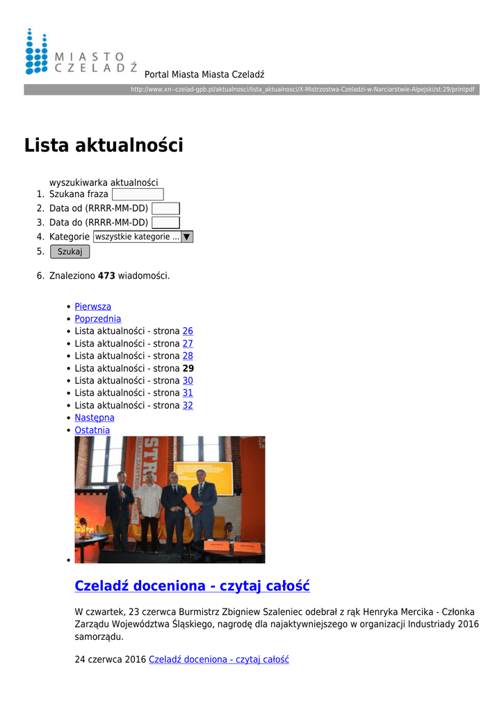 Portal Miasta Miasta Czeladź http://www.xn--czelad-gpb.pl/aktualnosci/lista_aktualnosci/X-Mistrzostwa-Czeladzi-w-Narciarstwie-Alpejski/st:29/printpdf Lista aktualności wyszukiwarka aktualności 1. Szukana fraza 2. Data od (RRRR-MM-DD) 3. Data do (RRRR-MM-DD) 4. Kategorie wszystkie kategorie ... ▼ 5. Szukaj 6. Znaleziono 473 wiadomości. Pierwsza Poprzednia Lista aktualności - strona 26 Lista aktualności - strona 27 Lista aktualności - strona 28 Lista aktualności - strona 29 Lista aktualności - strona 30 Lista aktualności - strona 31 Lista aktualności - strona 32 Następna Ostatnia Czeladź doceniona - czytaj całość W czwartek, 23 czerwca Burmistrz Zbigniew Szaleniec odebrał z rąk Henryka Mercika - Członka Zarządu Województwa Śląskiego, nagrodę dla najaktywniejszego w organizacji Industriady 2016 samorządu. 24 czerwca 2016 Czeladź doceniona - czytaj całość INFORMACJA O PRZEBIEGU KONSULTACJI SPOŁECZNYCH DOTYCZĄCYCH PROJEKTU UCHWAŁY WS. ZASAD WYZNACZANIA SKŁADU ORAZ ZASADY DZIAŁANIA KOMITETU REWITALIZACJI. - czytaj całość Osoby zainteresowane tematyką objętą zakresem konsultacji miały możliwość składać uwagi do ww. dokumentu w terminie od 04.05.2016 roku do 04.06.2016 roku: 24 czerwca 2016 INFORMACJA O PRZEBIEGU KONSULTACJI SPOŁECZNYCH DOTYCZĄCYCH PROJEKTU UCHWAŁY WS. ZASAD WYZNACZANIA SKŁADU ORAZ ZASADY DZIAŁANIA KOMITETU REWITALIZACJI. - czytaj całość Witajcie Wakacje! Festyn Rodzinny - czytaj całość Witajcie wakacje! Jak powitać tegoroczne wakacje? Proponujemy „Festyn Rodzinny”, który odbędzie się na odnowionym placu zabaw w parku przy ul. Mickiewicza. W programie, m.in. atrakcje i zabawy, ukochane przez dzieci dmuchańce. Start imprezy już w ten piątek 24.06.2016 o godz. 17.00. Zapraszamy mieszkańców naszego miasta! 23 czerwca 2016 Witajcie Wakacje! Festyn Rodzinny - czytaj całość Seniorzy Seniorom - czytaj całość Czeladzka grupa nieformalna „Seniorzy Seniorom”, działająca przy Klubie Seniora „Aktywna Jesień Życia” we współpracy z Zabrzańskim Stowarzyszeniem Kobiet i Ich Rodzin realizuje projekt pt: Życie zaczyna się na emeryturze. 22 czerwca 2016 Seniorzy Seniorom - czytaj całość Turniej w Bule - czytaj całość W czwartek 16 czerwca przed halą Miejskiego Ośrodka Sportu i Rekreacji w Czeladź rozegrano Turniej w Bule. 22 czerwca 2016 Turniej w Bule - czytaj całość Świętowaliśmy jubileusze współpracy - czytaj całość W tym roku przypada czterdziestolecie wymiany młodzieży między Czeladzią i Auby oraz dziesięciolecie nawiązania współpracy zagranicznej z Viesite. 21 czerwca 2016 Świętowaliśmy jubileusze współpracy - czytaj całość Amatorski Turniej Piłki Siatkowej - czytaj całość W sobotę 18 czerwca w hali Miejskiego Ośrodka Sportu i Rekreacji w Czeladzi odbył się Amatorski Turniej Piłki Siatkowej w ramach Dni Czeladzi 2016. 21 czerwca 2016 Amatorski Turniej Piłki Siatkowej - czytaj całość Konkurs „Zdobądź szalik i kibicuj biało-czerwonym” czytaj całość Już dzisiaj kolejna szansa na zdobycie biało-czerwonego szalika w konkursie organizowanym przez Miejski Ośrodek Sportu i Rekreacji i Miasto Czeladź. 21 czerwca 2016 Konkurs „Zdobądź szalik i kibicuj biało-czerwonym” - czytaj całość Stań Pod Murem Vol.11 / Graffiti Jam - czytaj całość 25 czerwca na terenie Parku Grabek odbędzie się impreza "Stań Pod Murem Vol.11 / Graffiti Jam". 21 czerwca 2016 Stań Pod Murem Vol.11 / Graffiti Jam - czytaj całość Festyn Rodzinny „Powitanie Lata” w MOPSie - czytaj całość Miejski Ośrodek Pomocy Społecznej w Czeladzi serdecznie zaprasza na Festyn Rodzinny „Powitanie Lata”, który odbędzie się w dniu 25 czerwca 2016 roku o godzinie 11:00 na terenie ogrodu MOPS w Czeladzi przy ul. 17 Lipca 27. 21 czerwca 2016 Festyn Rodzinny „Powitanie Lata” w MOPSie - czytaj całość Pierwsza Poprzednia Lista aktualności - strona 26 Lista aktualności - strona 27 Lista aktualności - strona 28 Lista aktualności - strona 29 Lista aktualności - strona 30 Lista aktualności - strona 31 Lista aktualności - strona 32 Następna Ostatnia