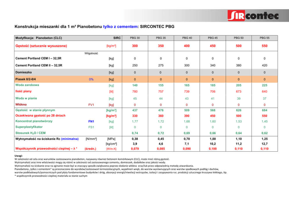 Konstrukcja mieszanki dla 1 m³ Pianobetonu tylko z cementem: SIRCONTEC PBG Modyfikacja: Pianobeton (CLC) SIRC PBG 30 PBG 35 PBG 40 PBG 45 PBG 50 PBG 55 [kg/m³] 300 350 400 450 500 550 Cement Portland CEM I – 32,5R [kg] 0 0 0 0 0 0 Cement Portland CEM II – 32,5R [kg] 250 275 300 340 380 420 Domieszka [kg] 0 0 0 0 0 0 [kg] 0 0 0 0 0 0 Woda zarobowa [kg] 140 155 165 185 205 225 Ilość piany [lit] 780 757 739 706 673 640 Woda w pianie [kg] 45 44 43 41 39 37 [kg] 0 0 0 0 0 0 Gęstość w stanie płynnym [kg/m³] 437 476 509 568 626 684 Oczekiwana gęstość po 28 dniach [kg/m³] 330 360 390 450 500 550 Gęstość (sztucznie wysuszone) Wilgotność Piasek 0/2-0/4 Włókno 0% FV1 Koncentrat pianotwórczy FN1 [kg] 1,77 1,72 1,68 1,60 1,53 1,45 Superplastyfikator FS1 [lit] 0 0 0 0 0 0 0,74 0,72 0,69 0,66 0,64 0,62 Stosunek H₂O / CEM Wytrzymałość na ściskanie Rc (minimalna) Współczynnik przewodności cieplnej – λ * [N/mm²] (średn.) [MPa] 0,38 0,45 0,70 1,00 1,10 1,25 [kg/cm²] 3,9 4,6 7,1 10,2 11,2 12,7 [W/m.K] 0,079 0,085 0,090 0,100 0,110 0,110 Uwagi: W zależności od celu oraz warunków zastosowania pianobeton, nazywany również betonem komórkowym (CLC), może mieć różną gęstość. Wytrzymałość oraz inne właściwości mogą się różnić w zależności od zastosowanego cementu, domieszek, dodatków oraz jakości wody. Wytrzymałość na ściskanie oraz na zginanie może być w znaczący sposób zwiększona poprzez dodanie włókna oraz/lub przez odpowiednią metodę utwardzania. Pianobetony „tylko z cementem“ są przeznaczone do wyrobów/zastosowań termoizolacyjnych, wypełnień wnęk, do warstw wyrównujących oraz warstw spadkowych podłóg i dachów, warstw podkładowych/pomocniczych pod płyty fundamentowe budynków i dróg, absorpcji energii/niwelacji wstrząsów, izolacji i zasypywania rur, produkcji sztucznego kruszywa lekkiego, itp. * współczynnik przewodności cieplnej materiału w stanie suchym Konstrukcja mieszanki dla 1 m³ Pianobetonu z piaskiem oraz z cementem: SIRCONTEC PBG Modyfikacja: Pianobeton (CLC) SIRC PBG 60 PBG 70 PBG 80 PBG 90 PBG 100 PBG 120 PBG 140 PBG 160 [kg/m³] 600 700 800 900 1 000 1 200 1 400 1 600 Cement Portland CEM I – 32,5R [kg] 300 310 315 330 345 355 375 400 Cement Portland CEM II – 32,5R [kg] 0 0 0 0 0 0 0 0 Domieszka [kg] 0 0 0 0 0 0 0 0 [kg] 220 315 410 490 627 760 945 1 110 Woda zarobowa [kg] 116 117 118 126 134 145 158 169 Ilość piany [lit] 703 662 624 581 516 452 362 281 Woda w pianie [kg] 41 38 36 34 30 26 21 16 Gęstość (sztucznie wysuszone) Wilgotność Piasek 0/2-0/4 Włókno 0% [kg] 0 0 0 0 0 0 0 0 Gęstość w stanie płynnym FV1 [kg/m³] 680 783 882 983 1 139 1 289 1 502 1 698 Oczekiwana gęstość po 28 dniach [kg/m³] 610 720 820 930 1 090 1 240 1 450 1 650 Koncentrat pianotwórczy FN1 [kg] 1,60 1,51 1,42 1,32 1,17 1,03 0,82 0,64 Superplastyfikator FS1 [lit] 1,2 1,4 1,6 1,7 1,8 2,0 2,1 2,3 0,52 0,50 0,49 0,48 0,48 0,48 0,48 0,46 [MPa] 1,4-2* 2-2,5* 2,1-3* 3-4* 3,5-5* 5,5-8* 10-12* 13-17* [kg/cm²] 14,3-20,4* 20,4-25,5* 21,4-30,6* 30,6-40,8* 35,7-51* 56,1-81,5* 101,9-122,3* 132,5-173,3* [W/m.K] 0,170 0,190 0,200 0,260 0,310 0,410 0,455 0,540 Stosunek H₂O / CEM Wytrzymałość na ściskanie Rc Współczynnik przewodności cieplnej – λ ** [N/mm²] (średn.) Uwagi: Osiągnięte wytrzymałości mogą się różnić w zależności od zastosowanego cementu, piasku, domieszek, dodatków, włókna oraz od metody utwardzania, jak również od jakości wody. * maksymalna wytrzymałość na ściskanie była osiągnięta poprzez zastosowanie wybranego cementu, piasku oraz superplastyfikatora (domieszka zmniejszająca ilość wody w betonie). ** współczynnik przewodności cieplnej materiału w stanie suchym Pianobeton w zależności od celu i przeznaczenia (wymaganej wytrzymałości i przewodności cieplnej) moze mieć różne gęstości: do 800 kg/m3 przeznaczony jest głównie dla wyrobów do izolacji, wypełniacze, niwelacji i spadkowe warstwy, warstwy podkładowe pod płyty fundamentowe, do produkcji kruszywa lekkiego, itd. 600-1200 kg/m3 dla termoizolacyjnych materiałów budowlanych (cegły, płyty, prefabrykaty, ściany, itp.) 1000-1600 kg/m3 dla termoizolacyjnych materiałów budowlanych (panele, prefabrykaty, płyty, zalewanie ścian budynków, itp.) Konstrukcja mieszanki dla 1 m³ Styropian-pianobetonu: SIRCONTEC PBG-S Modyfikacja: EPS-pianobeton (EPS-CLC) SIRC PBG-S V25 PBG-S V30 PBG-S V35 PBG-S V40 PBG-S 25 PBG-S 30 PBG-S 35 PBG-S 40 [kg/m³] 270 300 350 400 270 300 350 400 Cement Portland CEM I – 32,5R [kg] 220 250 290 330 0 0 0 0 Cement Portland CEM II – 32,5R [kg] 0 0 0 0 220 250 290 330 Piasek 0/2-0/4 [kg] 0 0 0 0 0 0 0 0 Recyklowany EPS, zgnieciony * [lit] 0 0 0 0 500 500 500 500 Gęstość (sztucznie wysuszone) EPS V perly * [lit] 500 500 500 500 0 0 0 0 Woda zarobowa [kg] 110 120 140 160 110 125 145 165 Ilość piany ** [lit] 461 441 408 375 501 476 443 410 Woda w pianie [kg] 27 26 24 22 29 28 26 24 Gęstość w stanie płynnym [kg/m³] 363 402 460 518 367 410 468 526 Oczekiwana gęstość po 28 dniach [kg/m³] 300 340 390 440 300 340 390 440 Koncentrat pianotwórczy FN1 [kg] 1,05 1,00 0,93 0,85 1,14 1,08 1,01 0,93 Domieszka spulchniająca do PsB FP1 [lit] 0 0 0 0 0 0 0 0 0,62 0,58 0,56 0,55 0,63 0,61 0,59 0,57 [MPa] 0,88 1,08 1,47 1,86 0,25*** 0,30*** 0,36*** 0,40*** [kg/cm²] 9,0 11,0 15,0 19,0 2,5*** 3,1*** 3,7*** 4,1*** [W/m.K] 0,076 0,080 0,087 0,099 0,083 0,087 0,096 0,106 Stosunek H₂O / CEM Wytrzymałość na ściskanie Rc [N/mm²] Współczynnik przewodności cieplnej – λ **** (średn.) Uwagi: Sztywność oraz inne właściwości są osiągnięte poprzez optymalny cement, granulat styropianowy oraz pianę techniczną. Styropian – pianobeton (EPS-pianobeton) w zależności od celu i wykorzystania może mieć różną wagę objętościową , właściwości oraz skład. PBG-S V25-V40 to lekki beton , który jest uzyskiwany poprzez zmieszanie okrągłych granulek styro