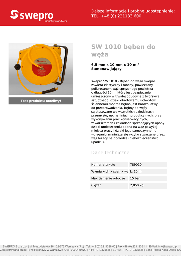 Dalsze informacje i próbne udostępnienie: TEL: +48 (0) 221133 600 SW 1010 bęben do węża 6,5 mm x 10 mm x 10 m / Samonawijający Test produktu możliwy! swepro SW 1010 - Bęben do węża swepro zawiera elastyczny i mocny, powleczony poliuretanem wąż sprężonego powietrza o długości 10 m, który jest bezpiecznie umieszczony w trwałej obudowie z tworzywa sztucznego. dzięki obrotowemu uchwytowi ściennemu montaż bębna jest bardzo łatwy do przeprowadzenia. Bębny do węży są stosowane we wszystkich dziedzinach przemysłu, np. na liniach produkcyjnych, przy wykonywaniu prac konserwacyjnych, w warsztatach i zakładach sprzedających opony. dzięki umieszczeniu bębna na wąż powyżej miejsca pracy i dzięki jego samoczynnemu wciąganiu zmniejsza się ryzyko stwarzane przez wąż leżący na podłodze (niebezpieczeństwo upadku). Dane techniczne Numer artykułu 789010 Wymiary dł. x szer. x wys.L: 10 m Max ciśnienie robocze 15 bar Ciężar 2,850 kg SWEPRO Sp. z o.o. | ul. Muszkieterów 28 | 02-273 Warszawa (PL) | Tel. +48 (0) 2211336 00 | Fax +48 (0) 2211336 11 | E-Mail: [email protected] Zarejestrowana przez: S?d Rejonowy w Warszawie KRS: 0000460422 | NIP: 7010375828 | EU VAT: PL7010375828 | Bank Polska Kasa Opieki SA Powered by TCPDF (www.tcpdf.org)