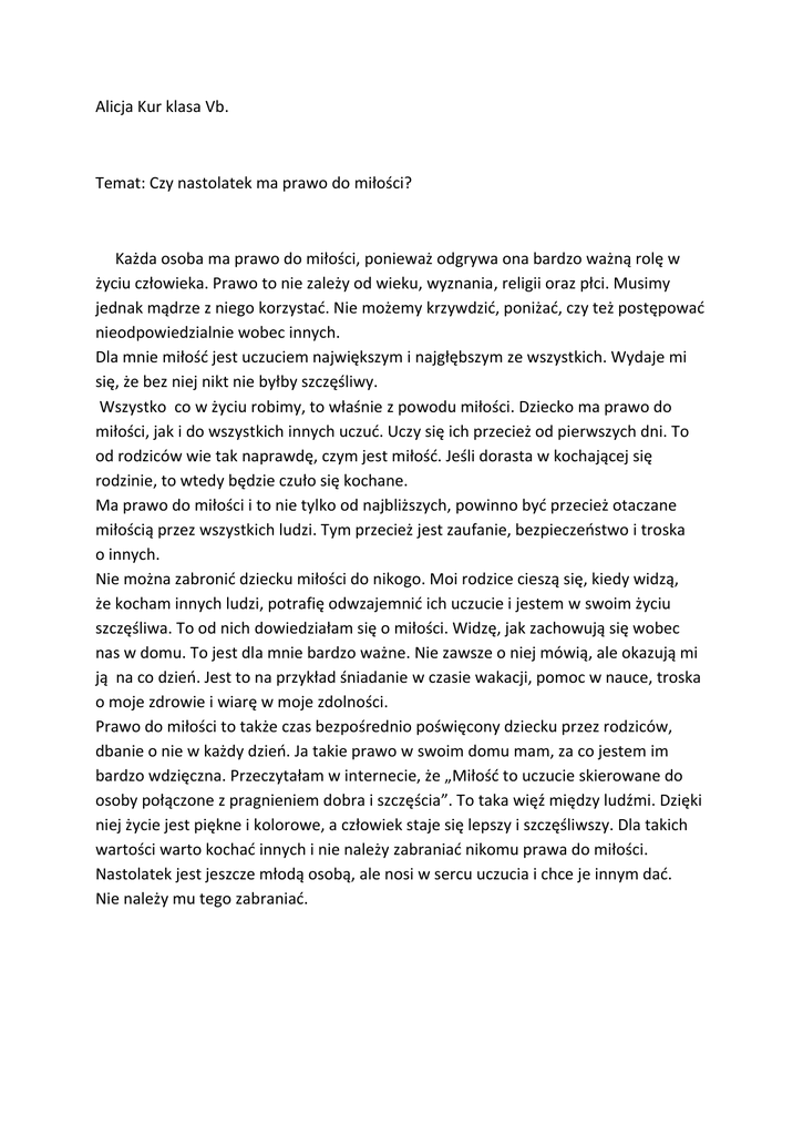 Alicja Kur klasa Vb. Temat: Czy nastolatek ma prawo do miłości? Każda osoba ma prawo do miłości, ponieważ odgrywa ona bardzo ważną rolę w życiu człowieka. Prawo to nie zależy od wieku, wyznania, religii oraz płci. Musimy jednak mądrze z niego korzystać. Nie możemy krzywdzić, poniżać, czy też postępować nieodpowiedzialnie wobec innych. Dla mnie miłość jest uczuciem największym i najgłębszym ze wszystkich. Wydaje mi się, że bez niej nikt nie byłby szczęśliwy. Wszystko co w życiu robimy, to właśnie z powodu miłości. Dziecko ma prawo do miłości, jak i do wszystkich innych uczuć. Uczy się ich przecież od pierwszych dni. To od rodziców wie tak naprawdę, czym jest miłość. Jeśli dorasta w kochającej się rodzinie, to wtedy będzie czuło się kochane. Ma prawo do miłości i to nie tylko od najbliższych, powinno być przecież otaczane miłością przez wszystkich ludzi. Tym przecież jest zaufanie, bezpieczeństwo i troska o innych. Nie można zabronić dziecku miłości do nikogo. Moi rodzice cieszą się, kiedy widzą, że kocham innych ludzi, potrafię odwzajemnić ich uczucie i jestem w swoim życiu szczęśliwa. To od nich dowiedziałam się o miłości. Widzę, jak zachowują się wobec nas w domu. To jest dla mnie bardzo ważne. Nie zawsze o niej mówią, ale okazują mi ją na co dzień. Jest to na przykład śniadanie w czasie wakacji, pomoc w nauce, troska o moje zdrowie i wiarę w moje zdolności. Prawo do miłości to także czas bezpośrednio poświęcony dziecku przez rodziców, dbanie o nie w każdy dzień. Ja takie prawo w swoim domu mam, za co jestem im bardzo wdzięczna. Przeczytałam w internecie, że „Miłość to uczucie skierowane do osoby połączone z pragnieniem dobra i szczęścia”. To taka więź między ludźmi. Dzięki niej życie jest piękne i kolorowe, a człowiek staje się lepszy i szczęśliwszy. Dla takich wartości warto kochać innych i nie należy zabraniać nikomu prawa do miłości. Nastolatek jest jeszcze młodą osobą, ale nosi w sercu uczucia i chce je innym dać. Nie należy mu tego zabraniać.