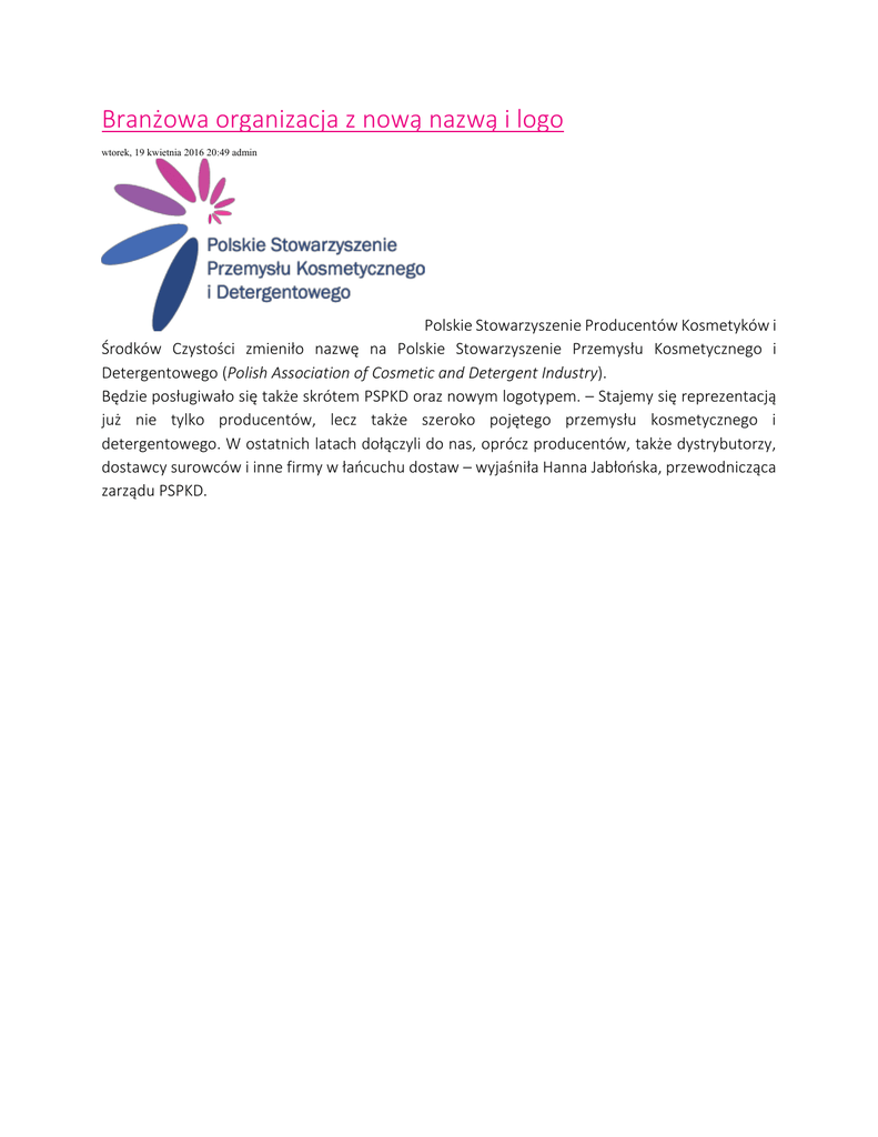 Branżowa organizacja z nową nazwą i logo wtorek, 19 kwietnia 2016 20:49 admin Polskie Stowarzyszenie Producentów Kosmetyków i Środków Czystości zmieniło nazwę na Polskie Stowarzyszenie Przemysłu Kosmetycznego i Detergentowego (Polish Association of Cosmetic and Detergent Industry). Będzie posługiwało się także skrótem PSPKD oraz nowym logotypem. – Stajemy się reprezentacją już nie tylko producentów, lecz także szeroko pojętego przemysłu kosmetycznego i detergentowego. W ostatnich latach dołączyli do nas, oprócz producentów, także dystrybutorzy, dostawcy surowców i inne firmy w łańcuchu dostaw – wyjaśniła Hanna Jabłońska, przewodnicząca zarządu PSPKD.
