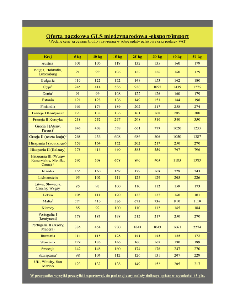 Oferta paczkowa GLS międzynarodowa -eksport/import *Podane ceny są cenami brutto i zawierają w sobie opłaty paliwowe oraz podatek VAT Kraj 5 kg 10 kg 15 kg 25 kg 30 kg 40 kg 50 kg Austria 101 106 118 132 135 160 179 Belgia, Holandia, Luxemburg 91 99 106 122 126 160 179 Bułgaria 116 122 132 148 153 162 180 Cypr2 245 414 586 928 1097 1439 1775 91 99 108 122 126 160 179 Estonia 121 128 136 149 153 184 198 Finlandia 161 174 189 202 217 258 274 Francja I Kontynent 123 132 136 161 160 205 300 Francja II Korsyka 238 252 267 298 310 340 350 Grecja I (Ateny, Pireus)2 240 408 578 661 779 1020 1255 Grecja II (reszta kraju)2 268 436 608 686 806 1050 1287 Hiszpania I (kontynent) 158 164 172 202 217 250 270 Hiszpania II (Baleary) 375 416 460 585 550 707 796 Hiszpania III (Wyspy Kanaryjskie, Melilla, Ceuta) 1 592 608 678 890 905 1185 1383 Irlandia 155 160 168 179 168 229 243 Lichtenstein 95 102 111 125 129 205 226 Litwa, Słowacja, Czechy, Węgry 85 92 100 110 112 159 173 Łotwa 105 111 120 133 137 168 181 Malta2 274 410 536 673 736 910 1110 Niemcy 85 92 100 110 112 165 184 Portugalia I (kontynent) 178 185 198 212 217 250 270 Portugalia II (Azory, Madera) 336 454 770 1043 1043 1661 2274 Rumunia 114 118 128 141 145 155 172 Słowenia 129 136 146 160 167 180 189 142 148 160 174 176 247 270 98 104 112 126 131 207 229 123 132 138 149 152 205 217 Dania 3 Szwecja Szwajcaria 1 UK, Włochy, San Marino W przypadku wysylki przesyłki importowej, do podanej ceny należy doliczyć opłatę w wysokości 45 pln. Objaśnienia stosowane w tabeli: 1) Niezbędna dopłata za odprawę celną 2) Kraje z transportem lotniczym: dla tych kierunków wymagane jest dołączenie do paczki opisu towarów w języku angielskim (kopia faktury lub specyfikacja). Cenę za paczkę ustala się na podstawie wagi objętościowej (wysokość x długość x szerokość w cm / 6000) w przypadku, jeśli jest ona wyższa od wagi brutto. 3) Z wyłączeniem Wysp Faroe i Grenlandii. Paczki wysyłane w systemie GLS muszą spełniać następujące wymagania: • waga jednostkowa do 50kg, • obwód + najdłuższy bok < 3m, • najdłuższy bok < 2m. Usługi dodatkowe: * W przypadku anulowania zlecenia, naliczana jest opłata w wysokości 15,00 pln * Dodatkowe doręczenie paczki po dwóch nieudanych próbach doręczenia obciążane jest w wysokości 15 pln * Wysłanie wiadomości sms lub e-mail o nadanej przesyłce podlega opłacie w wysokości 1 pln * W przypadku wysyłki paczki importowej, do cen w tabeli należy doliczyć opłatę w wysokości 45 pln za paczkę brutto. Poza usługami na terenie UE, rozszerzamy swoje kompetencje poza Europę. Dzięki dobranym partnerom mogą Państwo wysyłać swoje paczki do niemal wszystkich krajów na świecie! Zapraszamy do kontaktu na www.logisticsystem.pl
