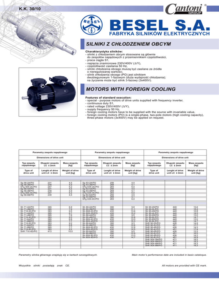 K.K. 30/10 BESEL S.A. FABRYKA SILNIKÓW ELEKTRYCZNYCH SILNIKI Z CH£ODZENIEM OBCYM Charakterystyka silników: - silniki z ch³odzeniem obcym stosowane s¹ g³ównie do zespo³ów napêdowych z przemiennikiem czêstotliwoœci, - praca ci¹g³a S1, - napiêcia znamionowe 230V/400V (D /Y), - czêstotliwoœæ zasilania 50 Hz, - silniki ch³odzenia obcego musz¹ byæ zasilane ze Ÿród³a o nieregulowanej wartoœci, - silnik ch³odzenia obcego (PO) jest silnikiem dwubiegunowym 1-fazowym (du¿a wydajnoœæ ch³odzenia); na ¿yczenie mo¿e byæ silnik 3-fazowy (3x400V). MOTORS WITH FOREIGN COOLING Features of standard execution: - special - purpose motors of drive units supplied with frequency inverter, - continuous duty S1, /Y), - rated voltage 230V/400V (D - supply frequency 50 Hz, - foreign cooling motors have to be supplied with the source with invariable value, - foreign cooling motors (PO) is a single-phase, two-pole motors (high cooling capacity), three-phase motors (3x400V) may be applied on request. Parametry zespo³u napêdowego Parametry zespo³u napêdowego Dimensions of drive unit Dimensions of drive unit Parametry zespo³u napêdowego Dimensions of drive unit Typ zespo³u napêdowego D³ugoœæ zespo³u LC ± 2mm Masa zespo³u [kg] Typ zespo³u napêdowego D³ugoœæ zespo³u LC ± 2mm Masa zespo³u [kg] Typ zespo³u napêdowego D³ugoœæ zespo³u LC ± 2mm Masa zespo³u [kg] Type of drive unit Lenght of drive unit LC ± 2mm Weight of drive unit [kg] Type of drive unit Lenght of drive unit LC ± 2mm Weight of drive unit [kg] Type of drive unit Lenght of drive unit LC ± 2mm Weight of drive unit [kg] Sg 56-2A/PO Sg 56-2B/PO STg 56X-2C/PO Sg 56-4A/PO Sg 56-4B/PO STg 56X-4C/PO Sg 56-6B/PO 231 239 247 231 239 247 239 4,5 4,9 5,2 4,5 4,9 5,2 4,5 Sg 63-2A/PO Sg 63-2B/PO STg 63X-2C/PO Sg 63-4A/PO Sg 63-4B/PO STg 63X-4C/PO Sg 63-6A/PO Sg 63-6B/PO STg 63X-6C/PO 256 268 283 256 268 283 256 268 283 4,5 5,1 6,0 4,5 5,1 6,0 4,5 5,1 6,0 Sh 71-2A/PO Sh 71-2B/PO Sh 71X-2C/PO Sh 71-4A/PO Sh 71-4B/PO Sh 71X-4C/PO Sh 71-6A/PO Sh 71-6B/PO Sh 71X-6C/PO Sh 71-8A/PO Sh 71-8B/PO Sh 71X-8C/PO ShR 71X-4D/PO 365 365 383 365 365 383 365 365 383 365 365 383 413 6,9 7,9 9,5 6,7 7,8 9,3 6,8 7,7 9,2 6,8 7,7 9,2 10,0 Sh Sh Sh Sh Sh Sh Sh Sh Sh Sh Sh Sh Sh Sh Sh Sh 390 390 430 430 390 390 430 430 390 390 430 430 390 390 430 430 9,8 11,1 13,6 15,2 9,5 10,8 13,0 15,3 9,3 10,6 12,8 14,5 9,5 10,9 13,0 14,7 Sh 90-2S/PO Sh 90-2L/PO Sh 90-4S/PO Sh 90-4L/PO Sh 90-6S/PO Sh 90-6L/PO Sh 90-8S/PO Sh 90-8L/PO ShR 90-2S/PO ShR 90-2L/PO ShR 90-4S/PO ShR 90-4L/PO ShR 90-6S/PO ShR 90-6L/PO ShR 80-8S/PO ShR 90-8L/PO ShR 90X-2M/PO ShR 90X-4M/PO ShR 90X-6M/PO ShR 90X-8M/PO 440 440 440 440 440 440 440 440 426 451 426 451 426 451 426 451 471 471 471 471 13,6 15,2 12,8 14,5 13,0 14,7 13,0 14,7 14,8 17,7 14,5 17,4 13,5 16,5 14,2 16,9 19,5 19,3 19,3 19,3 80-2A/PO 80-2B/PO 80X-2C/PO 80X-2D/PO 80-4A/PO 80-4B/PO 80X-4C/PO 80X-4D/PO 80-6A/PO 80-6B/PO 80X-6C/PO 80X-6D/PO 80-8A/PO 80-8B/PO 80X-8C/PO 80X-8D/PO Parametry silnika g³ównego znajduj¹ siê w kartach szczegó³owych. Wszystkie silniki posiadaj¹ znak CE. Main motor’s performance date are included in basic cataloque. All motors are provided with CE mark. Silnik z ch³odzeniem obcym - stopieñ ochrony IP54. Silnik g³ówny wielkoœci mechanicznej 56 lub 63 mm. Drive unit with foreign cooling - degree of protection IP54. Master motor in frame size 56 or 63 mm. silnik g³ówny master motor ch³odzenie obce foreign cooling IP54 LC Silnik z ch³odzeniem obcym - stopieñ ochrony IP54 (IP55). Silnik g³ówny wielkoœci mechanicznej 71, 80, 90 i 90R mm. Drive unit with foreign cooling - degree of protection IP54 (IP55). Master motor in frame size 71, 80, 90 i 90R mm. silnik g³ówny master motor ch³odzenie obce foreign cooling IP54 (IP55, IP56) LC Ch³odzenie obce oferowane jest jako ca³y zespó³ (silnik g³ówny sprzêgniêty z uk³adem ch³odz¹cym) lub odrêbnie jako samodzielny zespó³ ch³odz¹cy - karta katalogowa 30A. Foreign cooling is the subject of the offer as the whole unit (master motor coupled together with the cooling system) or as autonomous cooling unit - see catalogue card number 30A. Producent zastrzega sobie mo¿liwoœæ zmian danych zawartych w karcie katalogowej wynikaj¹cych z ci¹g³ego doskonalenia wyrobu. As part of our development program, we reserve the right to alter or amend any of the specifications without giving prior notice. K.K. 30/10 K.K. 30A/10 ZESPÓ£ CH£ODZENIA OBCEGO Zespó³ ch³odzenia obcego przystosowany jest do samodzielnego monta¿u ze standardowymi silnikami 3-fazowymi oferowanymi przez Besel. Charakterystyka silników: - silniki z ch³odzeniem obcym stosowane s¹ g³ównie do zespo³ów napêdowych z przemiennikiem czêstotliwoœci, - praca ci¹g³a S1, - napiêcia znamionowe 1x230V lub 3x230/400V (D /Y), - czêstotliwoœæ zasilania 50 Hz, - silniki ch³odzenia obcego musz¹ byæ zasilane ze Ÿród³a o nieregulowanej wartoœci, - silnik ch³odzenia obcego (PO) jest silnikiem dwubiegunowym 1-fazowym (du¿a wydajnoœæ ch³odzenia); na ¿yczenie mo¿e byæ silnik 3-fazowy (3x400V). COOLING UNITS Foreign cooling kit for self-assembling to 3-phase motors offered by Besel. Features of standard execution: - special - purpose motors of drive units supplied with frequency inverter, - continuous duty S1, - rated voltage 1x230V or 3x230/400V (D /Y), - supply frequency 50 Hz, - foreign cooling motors have to be supplied with the source with invariable value, - foreign cooling motors (PO) is a single-phase, two-pole motors (high cooling capacity), three-phase motors (3x400V) may be applied on request. Parametry silnika zespo³u napêdowego Technical data of drive unit motor Prêdkoœæ obrotowa Rated speed Pr¹d Rated current Wydajnoœæ Capacity [A] [m3/s] Napiêcie Rated voltage Czêstotliwoœæ Frequency Moc Rated output [V] [Hz] [kW] PO-56 220/240 50/60 14,5/14 2350/2850 0,07/0,06 0,014 PO-63 220/240 50/60 14,5/14 2350/2850 0,07/0,06 0,014 P
