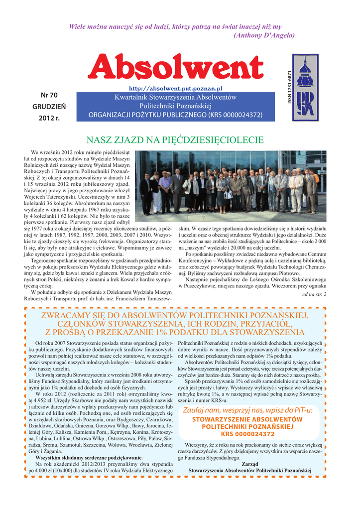 Kwartalnik Stowarzyszenia Absolwentów Politechniki Poznańskiej ORGANIZACJI POŻYTKU PUBLICZNEGO (KRS 0000024372) http://absolwent.put.poznan.pl Nr 70 GRUDZIEŃ 2012 r. ISSN 1731-6871 Wiele można nauczyć się od ludzi, którzy patrzą na świat inaczej niż my (Anthony D'Angelo) NASZ ZJAZD NA PIĘĆDZIESIĘCIOLECIE We wrześniu 2012 roku minęło pięćdziesiąt lat od rozpoczęcia studiów na Wydziale Maszyn Rolniczych dziś noszący nazwę Wydział Maszyn Roboczych i Transportu Politechniki Poznańskiej. Z tej okazji zorganizowaliśmy w dniach 14 i 15 września 2012 roku jubileuszowy zjazd. Najwięcej pracy w jego przygotowanie włożył Wojciech Taterczyński. Uczestniczyły w nim 3 koleżanki 36 kolegów. Absolutorium na naszym wydziale w dniu 4 listopada 1967 roku uzyskały 4 koleżanki i 62 kolegów. Nie było to nasze pierwsze spotkanie. Pierwszy nasz zjazd odbył się 1977 roku z okazji dziesiątej rocznicy ukończenia studiów, a później w latach 1987, 1992, 1997, 2000, 2003, 2007 i 2010. Wszystkie te zjazdy cieszyły się wysoką frekwencja. Organizatorzy starali się, aby były one atrakcyjne i ciekawe. Wspominamy je zawsze jako sympatyczne i przyjacielskie spotkania. Tegoroczne spotkanie rozpoczęliśmy w godzinach przedpołudniowych w pokoju profesorskim Wydziału Elektrycznego gdzie witaliśmy się, gdzie była kawa i szneki z glancem. Wielu przyjechało z różnych stron Polski, niektórzy z żonami a Irek Kowal z bardzo sympatyczną córką. W południe odbyło się spotkanie z Dziekanem Wydziału Maszyn Roboczych i Transportu prof. dr hab. inż. Franciszkiem Tomaszew- skim. W czasie tego spotkania dowiedzieliśmy się o historii wydziału i uczelni oraz o obecnej strukturze Wydziału i jego działalności. Duże wrażenie na nas zrobiła ilość studiujących na Politechnice – około 2.000 na „naszym” wydziale i 20.000 na całej uczelni. Po spotkaniu poszliśmy zwiedzać niedawno wybudowane Centrum Konferencyjno – Wykładowe z piękną aulą i uczelnianą biblioteką, oraz zobaczyć powstający budynek Wydziału Technologii Chemicznej. Byliśmy zachwyceni rozbudową campusu Piotrowo. Następnie pojechaliśmy do Leśnego Ośrodka Szkoleniowego w Puszczykowie, miejsca naszego zjazdu. Wieczorem przy ognisku cd na str. 2 ZWRACAMY SIĘ DO ABSOLWENTÓW POLITECHNIKI POZNAŃSKIEJ, CZŁONKÓW STOWARZYSZENIA, ICH RODZIN, PRZYJACIÓŁ, Z PROŚBĄ O PRZEKAZANIE 1% PODATKU DLA STOWARZYSZENIA Od roku 2007 Stowarzyszenie posiada status organizacji pożytku publicznego. Pozyskanie dodatkowych środków finansowych pozwoli nam pełniej realizować nasze cele statutowe, w szczególności wspomagać naszych młodszych kolegów – koleżanki studentów naszej uczelni. Uchwałą zarządu Stowarzyszenia z września 2008 roku utworzyliśmy Fundusz Stypendialny, który zasilany jest środkami otrzymanymi jako 1% podatku od dochodu od osób fizycznych. W roku 2012 (rozliczenie za 2011 rok) otrzymaliśmy kwotę 4.952 zł. Urzędy Skarbowe nie podały nam wszystkich nazwisk i adresów darczyńców a wpłaty przekazywały nam pojedynczo lub łącznie od kilku osób. Pochodzą one, od osób rozliczających się w urzędach skarbowych Poznania, oraz Bydgoszczy, Czarnkowa, Działdowa, Gdańska, Gniezna, Gorzowa Wlkp., Iławy, Jarocina, Jeleniej Góry, Kalisza, Kamienia Pom., Kętrzyna, Konina, Krotoszyna, Lubina, Lublina, Ostrowa Wlkp., Ostrzeszowa, Piły, Puław, Sieradza, Śremu, Szamotuł, Szczecina, Wołowa, Wrocławia, Zielonej Góry i Żagania. Wszystkim składamy serdeczne podziękowanie. Na rok akademicki 2012/2013 przyznaliśmy dwa stypendia po 4.000 zł (10x400) dla studentów IV roku Wydziału Elektrycznego Politechniki Poznańskiej z rodzin o niskich dochodach, uzyskujących dobre wyniki w nauce. Ilość przyznawanych stypendiów zależy od wielkości przekazanych nam odpisów 1% podatku. Absolwentów Politechniki Poznańskiej są dziesiątki tysięcy, członków Stowarzyszenia jest ponad czterysta, więc rzesza potencjalnych darczyńców jest bardzo duża. Staramy się do nich dotrzeć z naszą prośbą. Sposób przekazywania 1% od osób samodzielnie się rozliczających jest prosty i łatwy. Wystarczy wyliczyć i wpisać we właściwą rubrykę kwotę 1%, a w następnej wpisać pełną nazwę Stowarzyszenia i numer KRS-u. Zaufaj nam, wesprzyj nas, wpisz do PIT-u: STOWARZYSZENIE ABSOLWENTÓW POLITECHNIKI POZNAŃSKIEJ KRS 0000024372 Wierzymy, że z roku na rok przekonamy do siebie coraz większą rzeszę darczyńców. Z góry dziękujemy wszystkim za wsparcie naszego Funduszu Stypendialnego. Zarząd Stowarzyszenia Absolwentów Politechniki Poznańskiej NASZ ZJAZD NA PIĘĆDZIESIĘCIOLECIE cd ze str. 1 była kolacja z daniami z grilla oraz trunkami i piwem. Wokół ogniska ustawiono 15 zniczy przypominających kolegów, którzy przedwcześnie odeszli z naszych szeregów. Pomimo chłodnego wieczoru atmosfera była ciepła, sypały się dowcipy i wspomnienia z lat studiów. Rozmowy trwały do późnych godzin nocnych. Nazajutrz, rano odbyła się msza w kościele pw. Wniebowzięcia NMB w Puszczykowie. Proboszcz tej parafii ks. Roman Poźniak w kazaniu wskazał na naszą – absolwentów Politechniki przyjaźń, która powoduje, że chcemy się spotykać i pamiętamy o kolegach, którzy odeszli do wieczności. Wymienił ich nazwiska. Po mszy pojechaliśmy do Rogalina. Zwiedzaliśmy pałac, powozownie i słynne rogalińskie dęby. Dużą znajomością koni i dawnych powozów wykazał się Józef Szews, który opowiedział nam o różnych rasach koni, konstrukcji i przeznaczeniu każdego z powozów. Historie Rogalina i pałacu rodu Raczyńskich świetnie przekazywali nam koledzy Jerzy Bugajski i Stanisław Demut. Potem wróciliśmy do Ośrodka na wspólny obiad, po którym mieliśmy czas na rozmowy w grupach. Wspominano nasze życie studenckie. Praktyki odbywane w zakładach pracy, zajęcia na uczelni, kadrę naukową, ubawy w klubach studenckich, studium wojskowe i obóz wojskowy 
