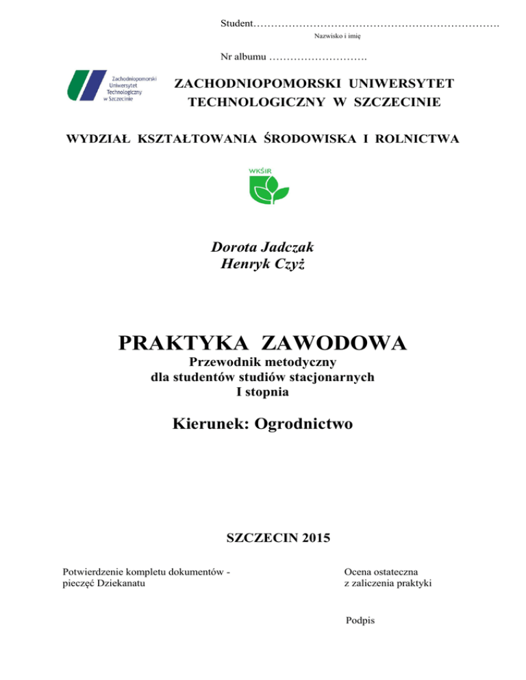 Student……………………………………………………………. Nazwisko i imię Nr albumu ………………………. ZACHODNIOPOMORSKI UNIWERSYTET TECHNOLOGICZNY W SZCZECINIE WYDZIAŁ KSZTAŁTOWANIA ŚRODOWISKA I ROLNICTWA Dorota Jadczak Henryk Czyż PRAKTYKA ZAWODOWA Przewodnik metodyczny dla studentów studiów stacjonarnych I stopnia Kierunek: Ogrodnictwo SZCZECIN 2015 Potwierdzenie kompletu dokumentów pieczęć Dziekanatu Ocena ostateczna z zaliczenia praktyki Podpis 2 Vacat 2 str. 3 ………………………………………………… Imię i nazwisko …………………………………………………. Numer albumu …………………………………………………. Rok akademicki PRZEBIEG Liczba tygodni pracy PRAKTYKI Potwierdzenie rozpoczęcia praktyki Data Podpis i pieczęć zakładu pracy Zakończenie praktyki Data Podpis i pieczęć zakładu pracy 4 Vacat 4 str. 5 SPIS TREŚCI 1. Wstęp i cel praktyki ........................................................................................................ 7 2. Regulamin i organizacja praktyki (prof. dr hab. Henryk Czyż)...................................... 7 2.1. Zasady ogólne .......................................................................................................... 7 2.2. Obowiązki studenta-praktykanta i zakładu pracy .................................................... 8 3. Program praktyki realizowanej w gospodarstwach ogrodniczych.................................13 3.1. Produkcja warzywnicza (dr inż. Agnieszka Żurawik) ............................................ 13 3.1.1. Treści programowe z zakresu warzywnictwa .............................................. 13 3.1.2. Charakterystyka gospodarstwa i zadania praktyczne................................... 14 3.2. Produkcja sadownicza (dr hab.inż. Ireneusz Ochmian) ......................................... 22 3.2.1. Treści programowe z zakresu sadownictwa................................................. 22 3.2.2. Charakterystyka gospodarstwa i zadania praktyczne................................... 23 3.3. Produkcja roślin ozdobnych (dr inż. Agnieszka Zawadzińska) .............................. 31 3.3.1. Treści programowe z zakresu roślin ozdobnych .......................................... 31 3.3.2. Charakterystyka gospodarstwa i zadania praktyczne................................... 32 3.4. Produkcja szkółkarska drzew i krzewów ozdobnych (prof.dr hab. Urszula Nawrocka-Grześkowiak) ..................................................... 41 3.4.1. Treści programowe z zakresu szkółkarstwa drzew i krzewów ozdobnych. ...................................................................... 41 3.4.2. Charakterystyka gospodarstwa i zadania praktyczne................................... 42 4. Dziennik praktyk............................................................................................................50 5. Sprawozdanie z pobytu na praktyce w instytucjach związanych z ogrodnictwem .......61 6. Sprawozdanie z pobytu na praktyce zagranicznej .........................................................62 7. Uwagi .............................................................................................................................63 8. Potwierdzenie odbycia praktyki .....................................................................................64 6 1. Wstęp i cel praktyki Praktyka zawodowa stanowi integralną część studiów I stopnia na kierunku Ogrodnictwo. Może być ona realizowana w gospodarstwach prowadzących działalność odpowiadającą treściom kształcenia na tym kierunku. Zasady odbywania praktyk studenckich regulowane są zarządzeniem Rektora ZUT w Szczecinie nr 169 z dnia 20 listopada 2009 r. Zasadniczym celem praktyki zawodowej jest zastosowanie wiedzy i umiejętności teoretycznych zdobytych w trakcie zajęć dydaktycznych, w praktyce ogrodniczej, a także zdobycie kompetencji przy wykonywaniu przyszłej pracy zawodowej. Osiągnięcie tego celu w szczególności zapewniają: cel wychowawczy – przygotowanie studenta do pracy w zespole i poznanie przez niego znaczenia oraz wartości pracy na różnych stanowiskach; cel poznawczy – przedstawienie studentowi praktycznych zastosowań wiedzy teoretycznej nabytej przez niego podczas studiów; cel dydaktyczny - poznanie podstawowych zasad funkcjonowania gospodarstwa ogrodniczego, zapoznanie z nowoczesnymi technologiami produkcji ogrodniczej, stosowanymi w gospodarstwach krajowych lub zagranicznych, wykształcenie umiejętności wykonywania prac niezbędnych w zawodzie ogrodnika, opanowanie zasad posługiwania się sprzętem mechanicznym wykorzystywanym w ogrodnictwie; cel społeczny – ukazanie studentowi jego miejsca i roli w gospodarce i społeczeństwie; cel promocyjny – ułatwienie przyszłemu absolwentowi znalezienia pracy poprzez osobisty kontakt z potencjalnymi pracodawcami i przekonania ich o odpowiednim przygotowaniu do wykonywania zawodu. Stworzenie studentowi możliwości sformułowania tematu przyszłej pracy dyplomowej i pozyskania materiałów do części praktycznej. 2. Regulamin i organizacja praktyki zawodowej Studenci studiów zawodowych powinni realizować praktykę zgodnie z programem i zasadami jej organizacji. Program praktyki obejmuje zapoznanie się z technologiami produkcji stosowanymi w ogrodnictwie, realizację zadań zawartych w niniejszym przewodniku oraz wykonywanych prac na załączonych kartach tygodniowych. 2.1. Zasady ogólne 1. Studenta-praktykanta obowiązuje realizacja programu praktyki zawodowej dla studentów III roku kierunku Ogrodnictwo, zawartego w niniejszym przewodniku. 7 2. Praktyka zawodowa stanowi integralną część studiów. 3. Czas trwania praktyki wynosi 6 tygodni. Student zobowiązany jest przed rozpoczęciem praktyki zawodowej ubezpieczyć się na czas jej odbywania od następstw nieszczęśliwych wypadków (ubezpieczenie NNW) i dostarczyć stosowny dokument do Dziekanatu. Na